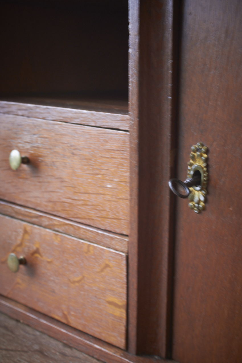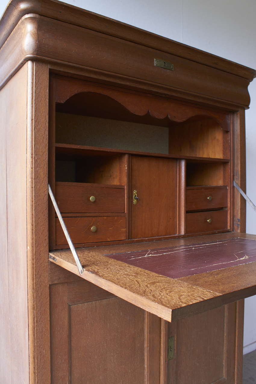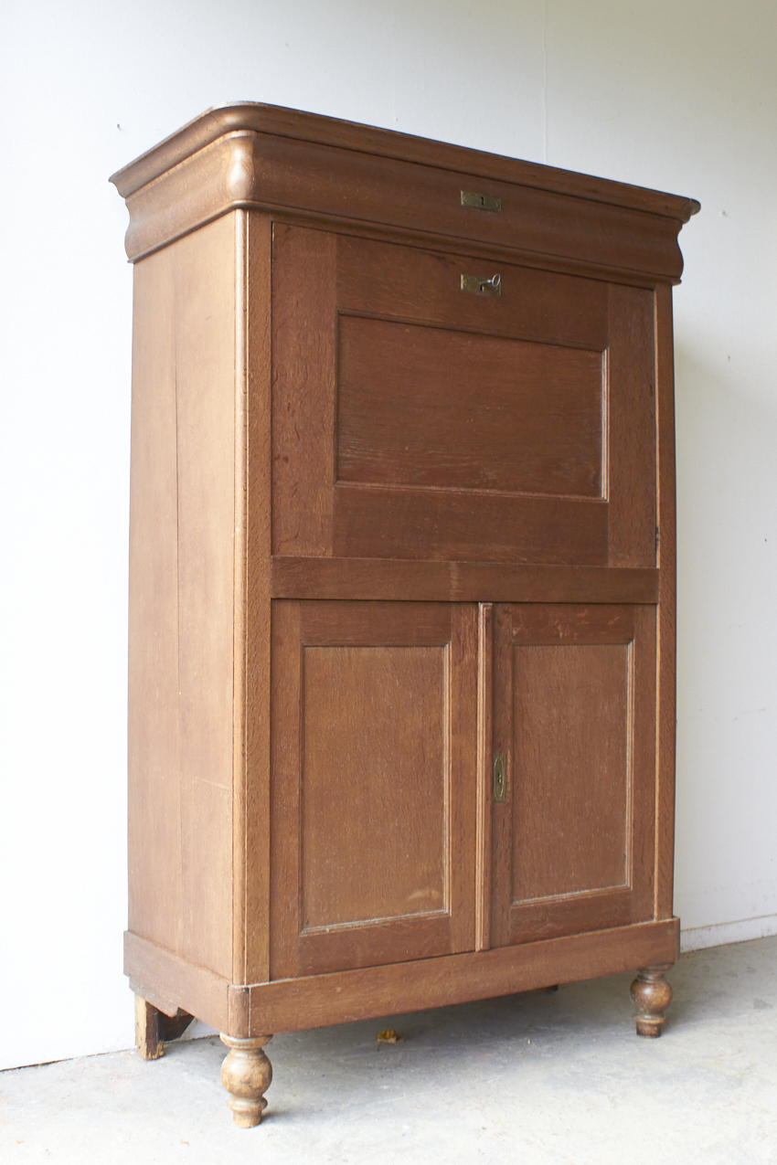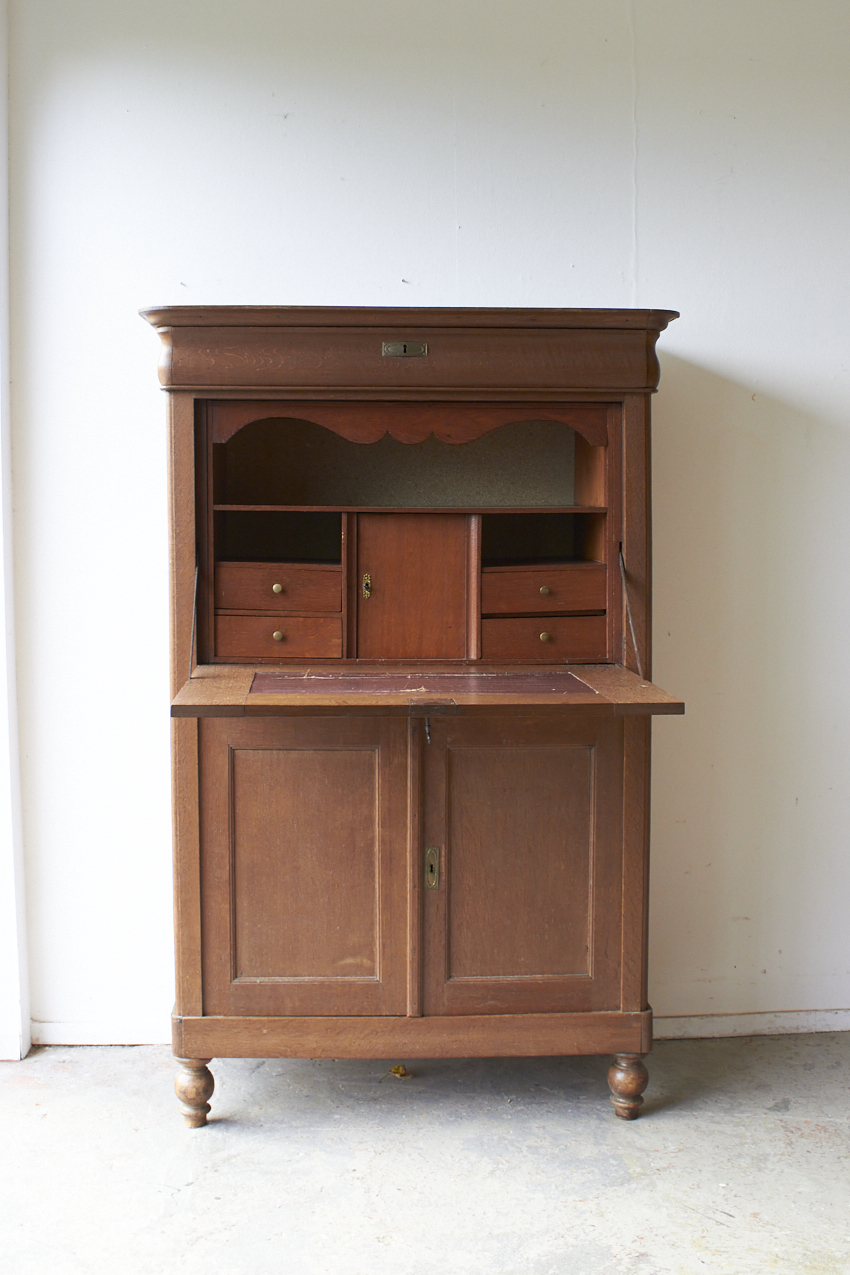 Een unieke Franse meidenkast met een klep komen we weinig tegen. Wat worden we blij van deze authentieke uitstraling en de vele opbergplekjes die de kast biedt. Bovenin een lade over de hele breedte van de kast. Daaronder een klep, met kleine lades en vakken. Achter de paneeldeuren onder nog een ruim vak met plank. De subtiele bolpootjes, de rondingen in de lade boven en de lijnen op de deuren zijn tekenend voor deze kast. Ook achter de klep schuilt nog een mooie sierrand.