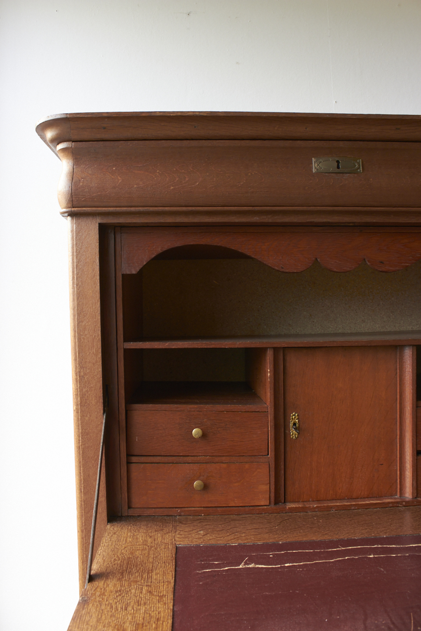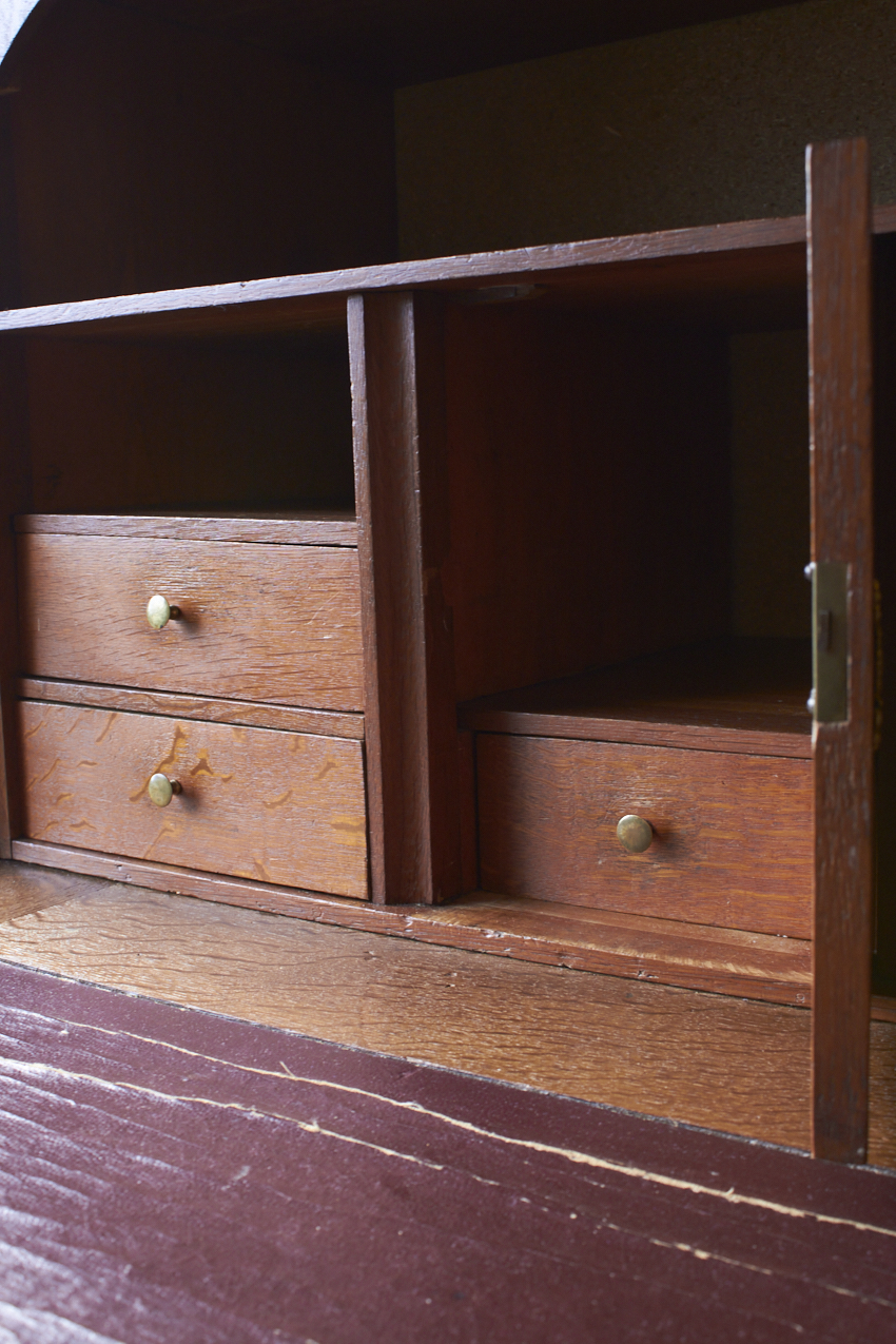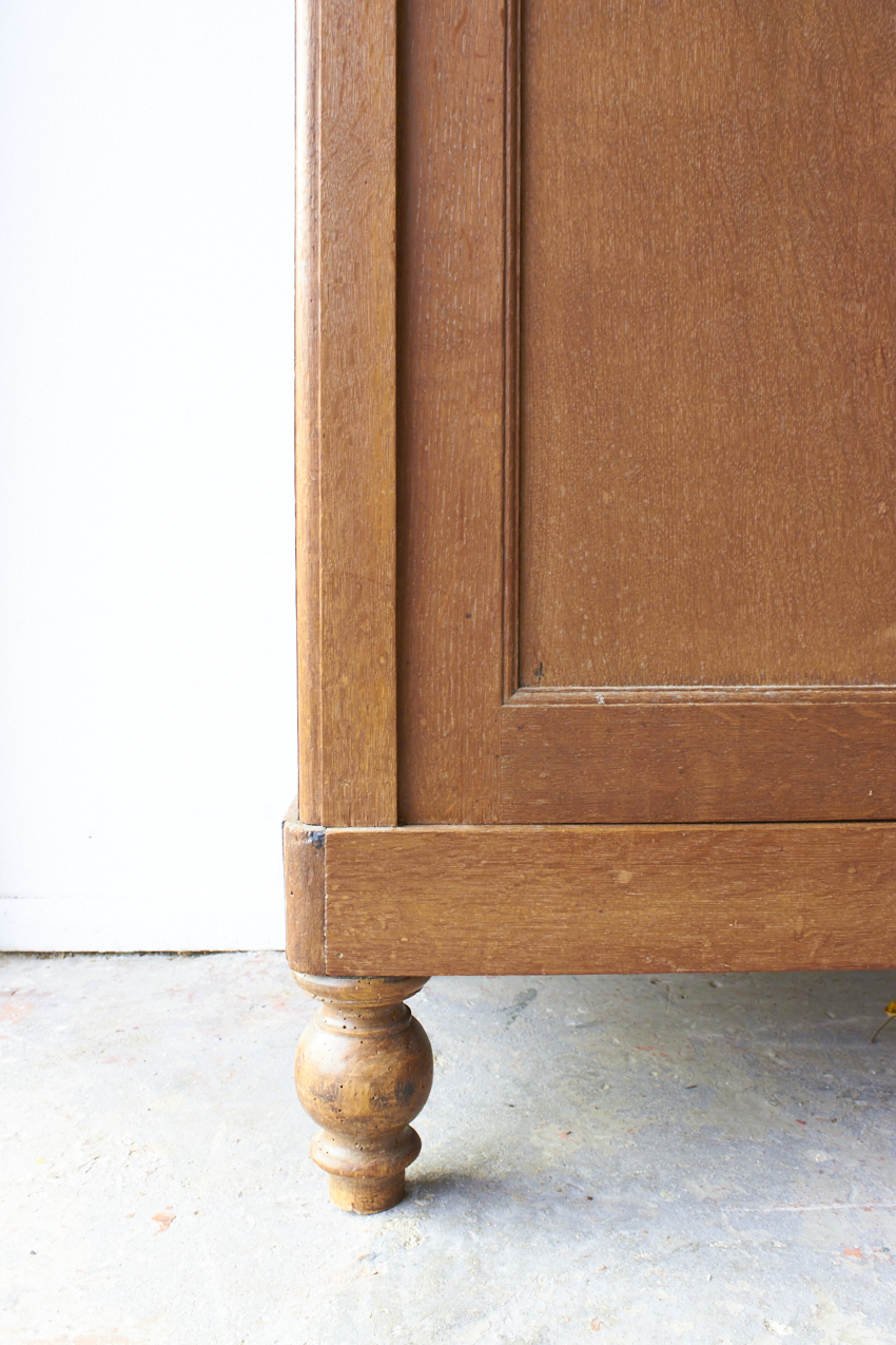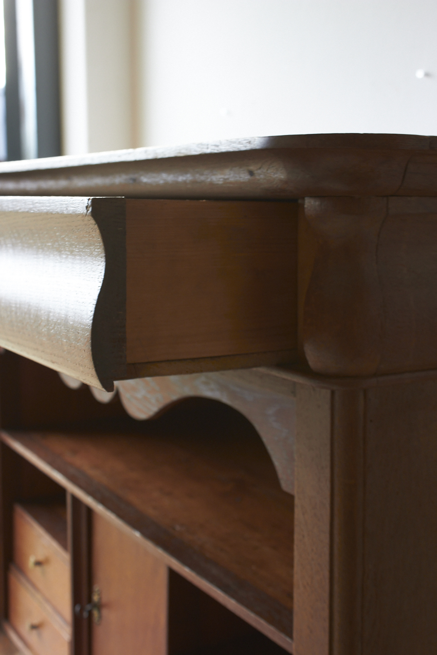 Een unieke Franse meidenkast met een klep komen we weinig tegen. Wat worden we blij van deze authentieke uitstraling en de vele opbergplekjes die de kast biedt. Bovenin een lade over de hele breedte van de kast. Daaronder een klep, met kleine lades en vakken. Achter de paneeldeuren onder nog een ruim vak met plank. De subtiele bolpootjes, de rondingen in de lade boven en de lijnen op de deuren zijn tekenend voor deze kast. Ook achter de klep schuilt nog een mooie sierrand.