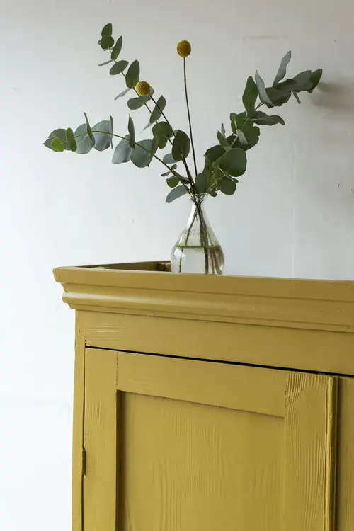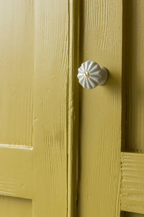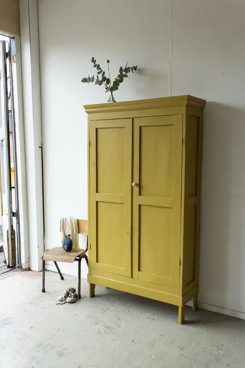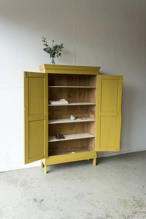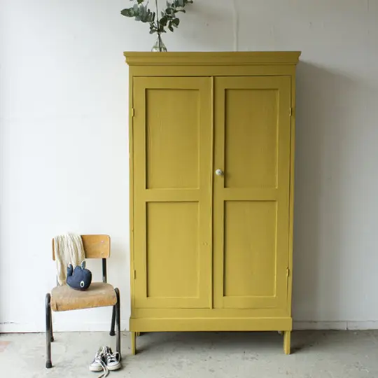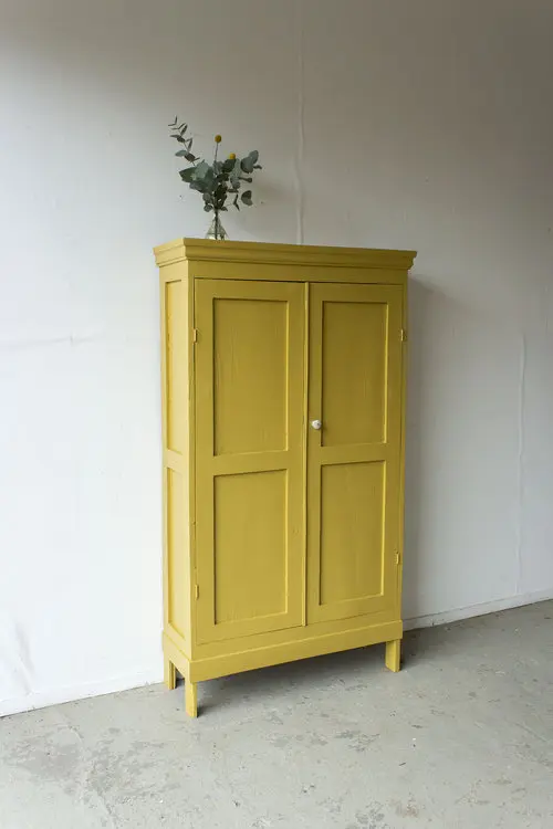 Wat een leuk kastje is dit! We hebben dit Franse vintage kledingkastje goed schoongemaakt, ontdaan van zijn vorige laag verf en vervolgens in deze geweldige okergele kleur geschilderd. We hebben tot slot een klassiek porseleinen knopjes op de rechter deur geplaatst. De deuren sluiten door middel van een schuifje en een magneetje. Omdat de originele planken niet zo stevig en recht meer waren, hebben we er vier nieuwe berkenhouten planken voor gemaakt. Een geweldig kledingkastje voor op de baby- of kinderkamer. En omdat hij niet zo diep is, past hij zelfs op de wat kleinere kinderkamer. Helemaal klaar voor gebruik!
