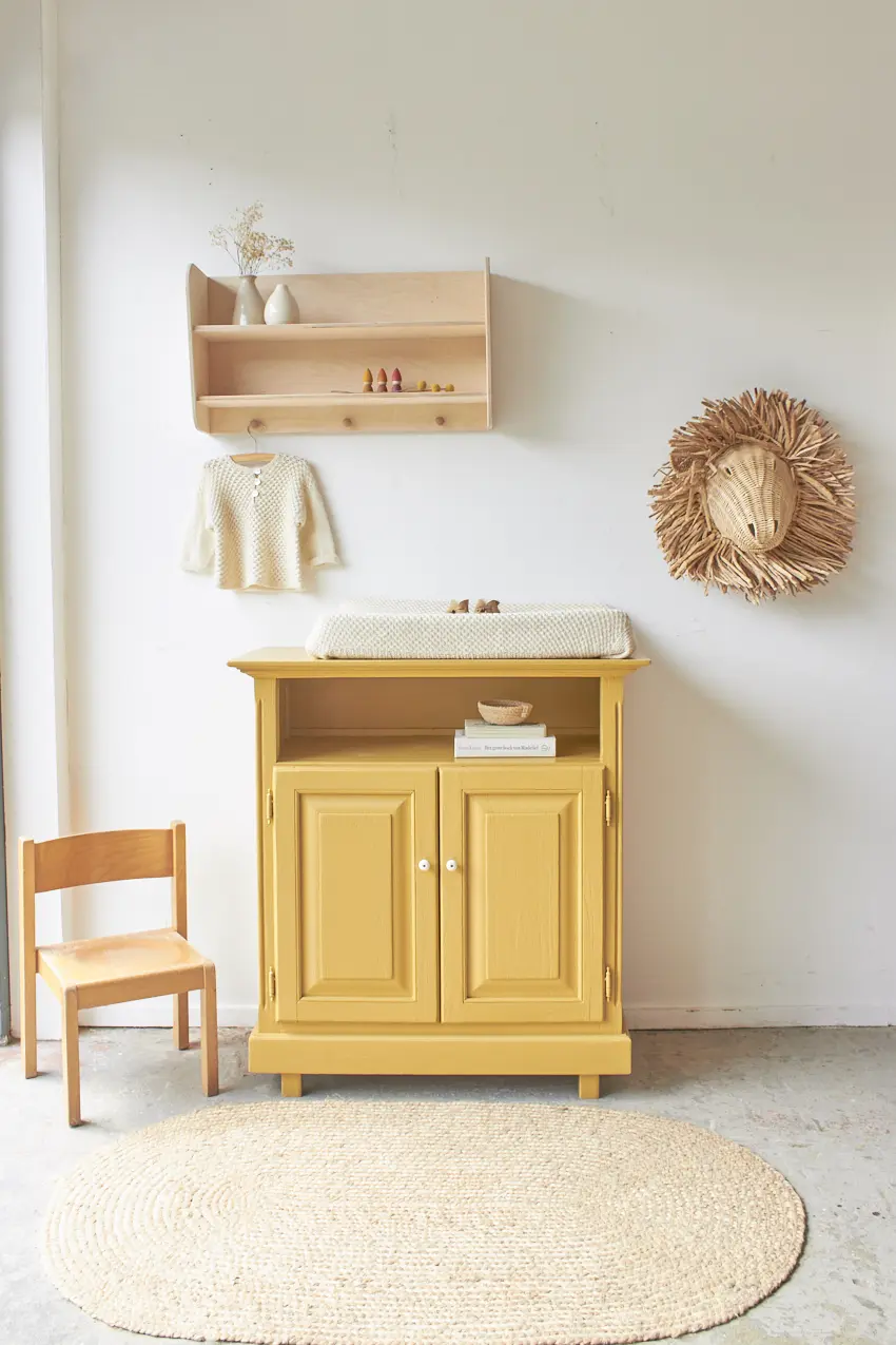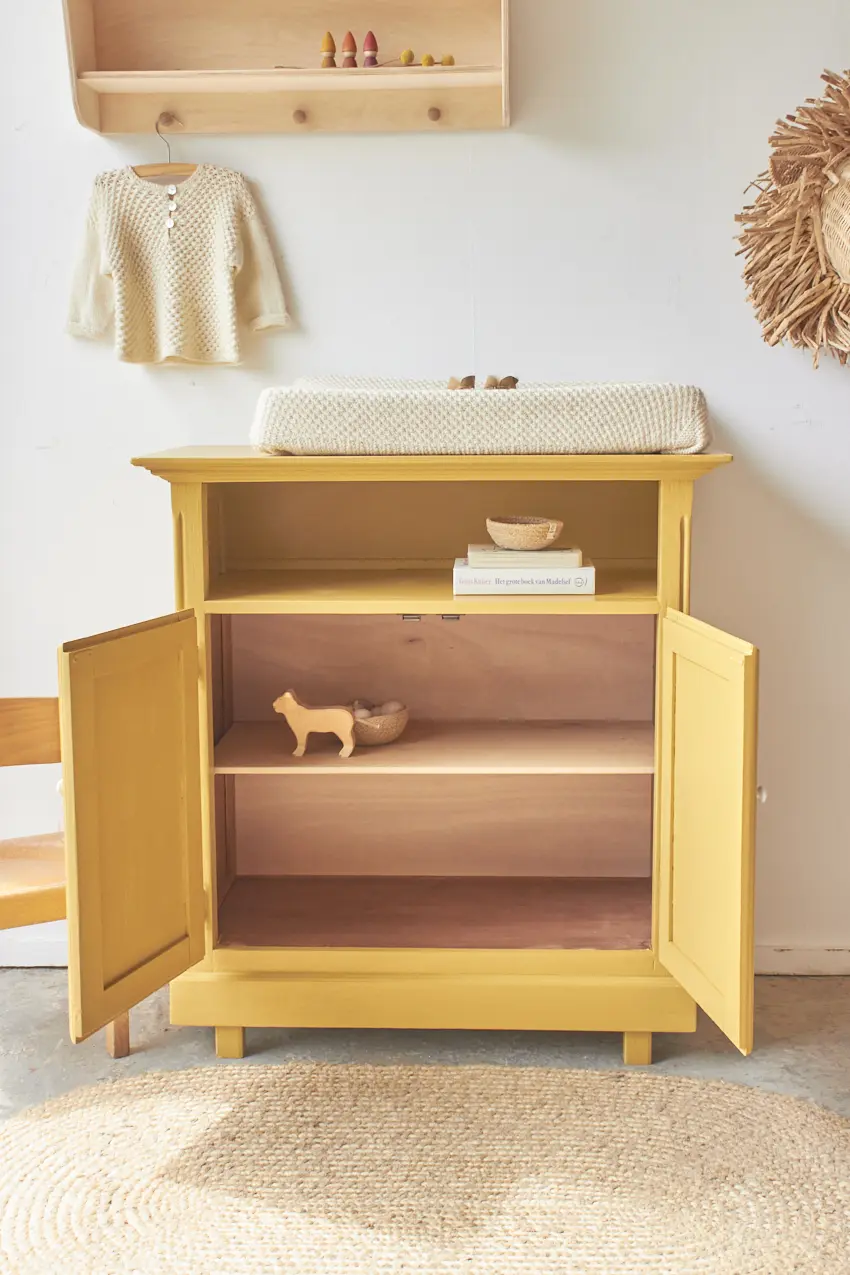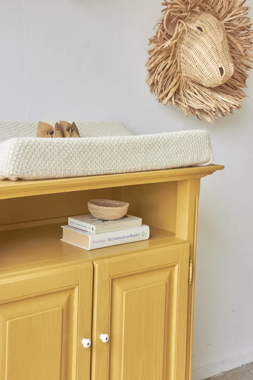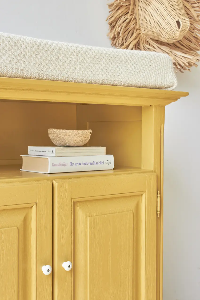 Deze kleine commode is zo leuk geworden in onze okergeel ‘Saffraan’. Het blad is nu precies groot genoeg voor een verschoonkussen, perfect om eerst als commode te gebruiken. Heel fijn als je wat minder ruimte hebt in huis. De ideale commode voor op een kleine babykamer. Deze kast wil je. Een mooi detail is het grote open vak, dit zien we niet vaak en is dus uniek en zo leuk om hier boekjes te leggen of hydrofiele doeken en luiers.