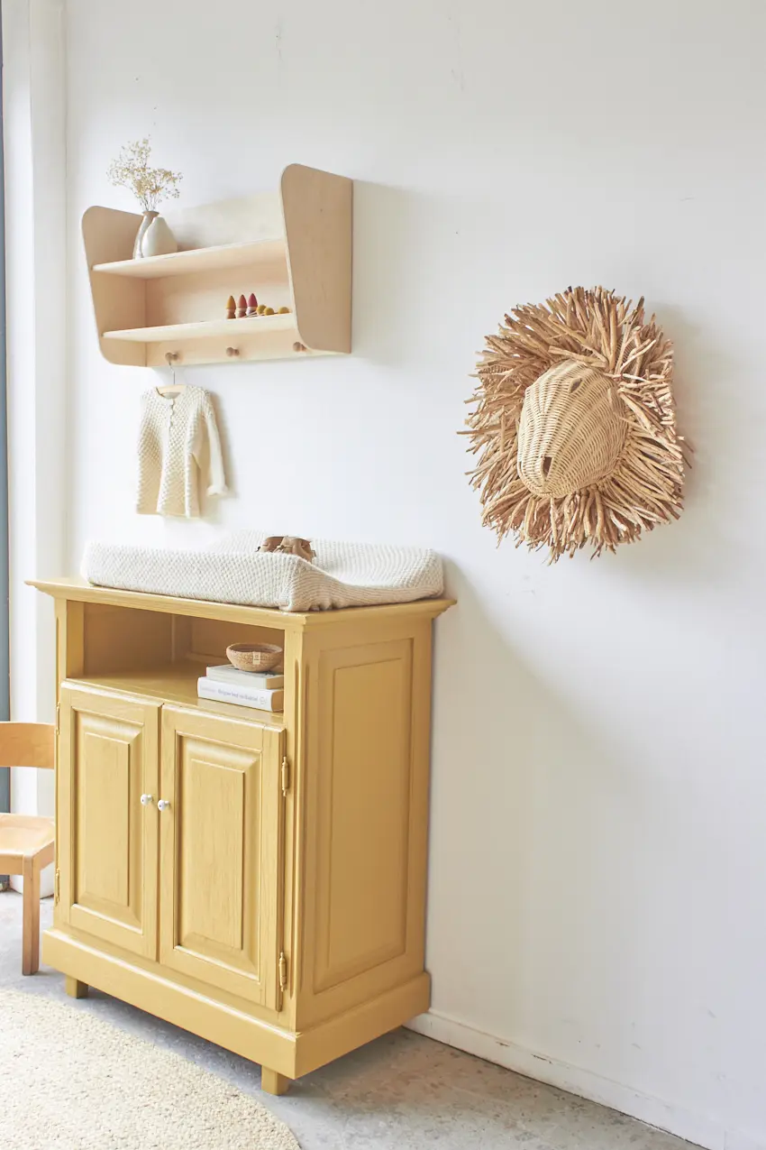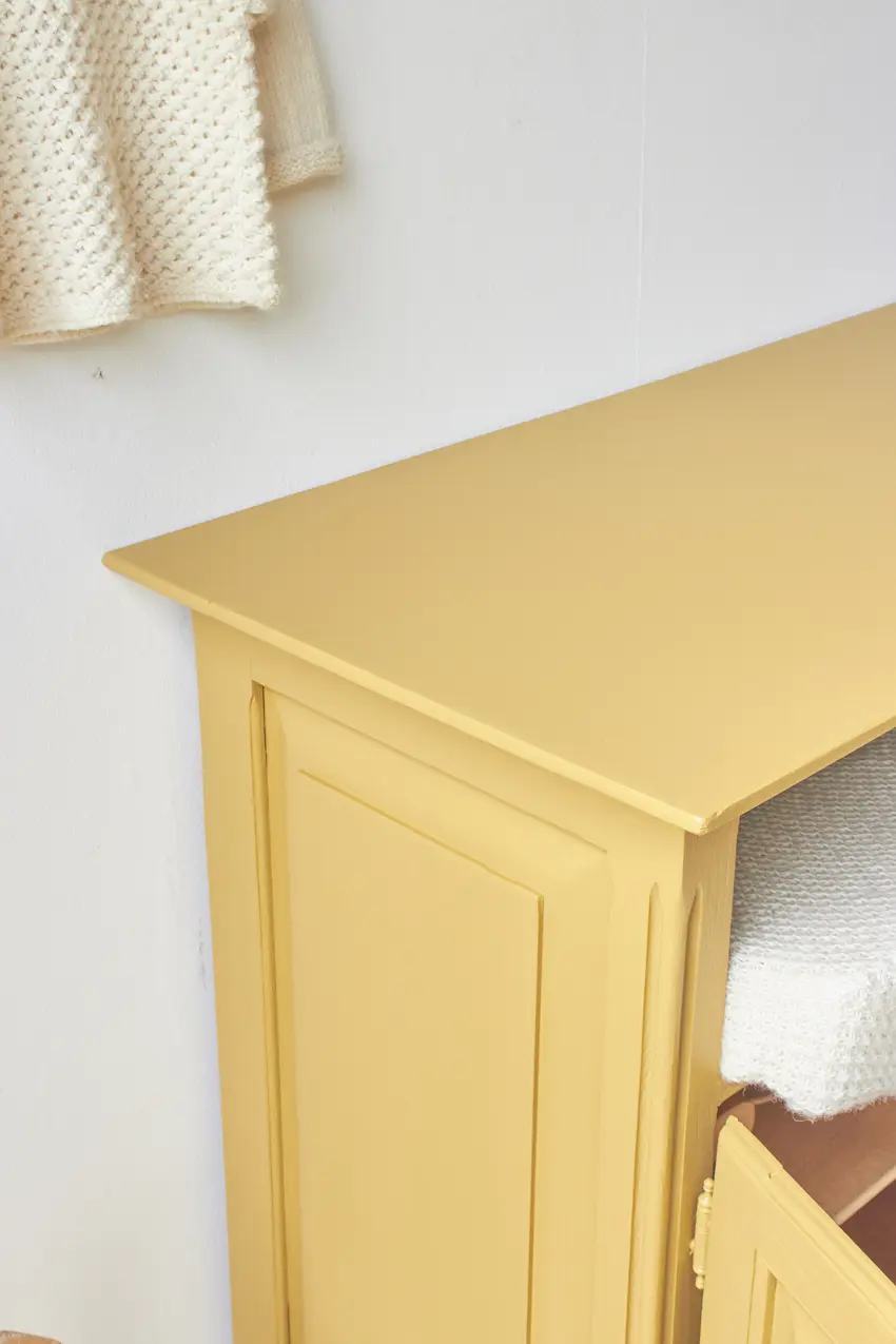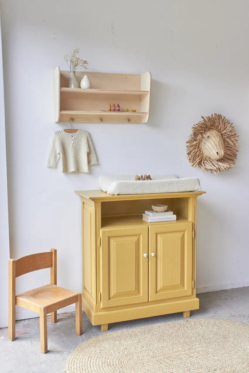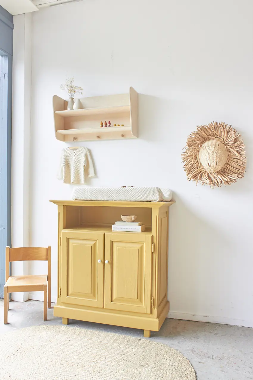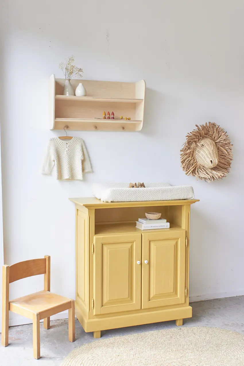 Deze kleine commode is zo leuk geworden in onze okergeel ‘Saffraan’. Het blad is nu precies groot genoeg voor een verschoonkussen, perfect om eerst als commode te gebruiken. Heel fijn als je wat minder ruimte hebt in huis. De ideale commode voor op een kleine babykamer. Deze kast wil je. Een mooi detail is het grote open vak, dit zien we niet vaak en is dus uniek en zo leuk om hier boekjes te leggen of hydrofiele doeken en luiers.
