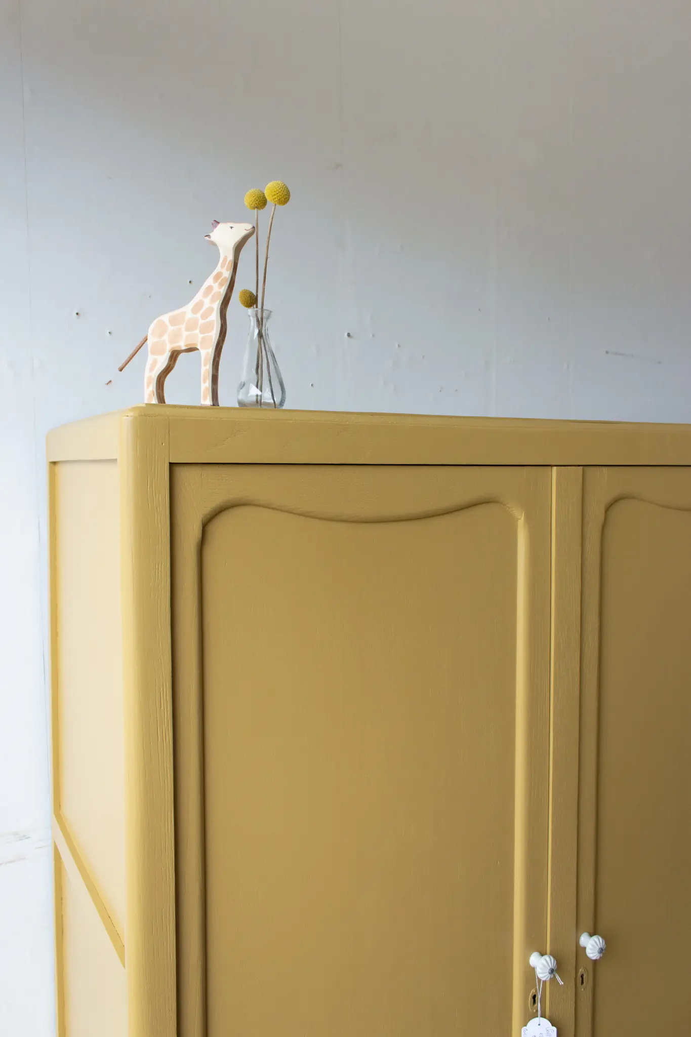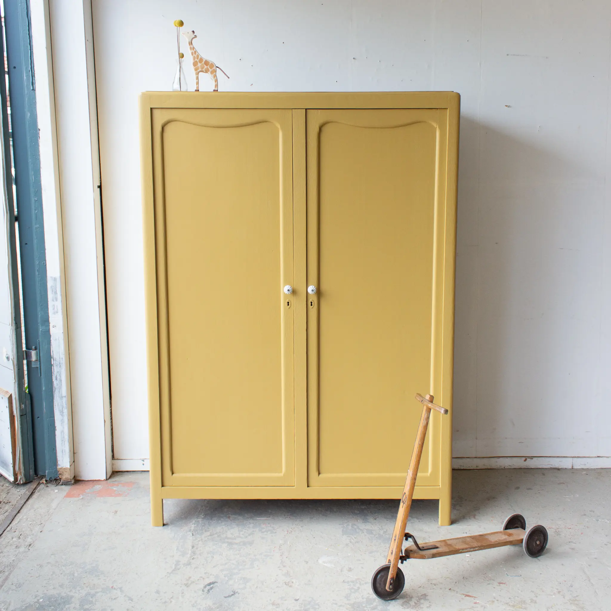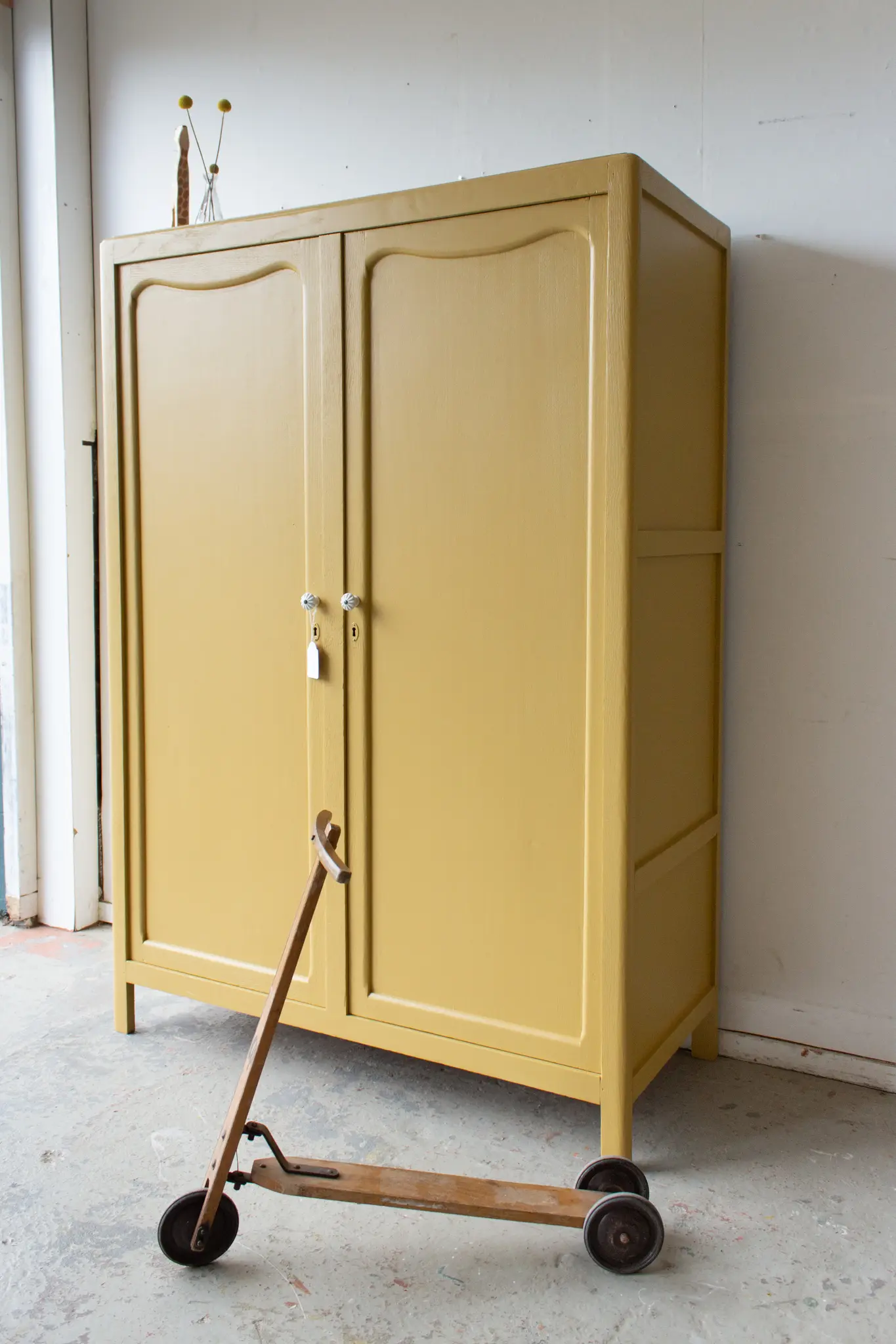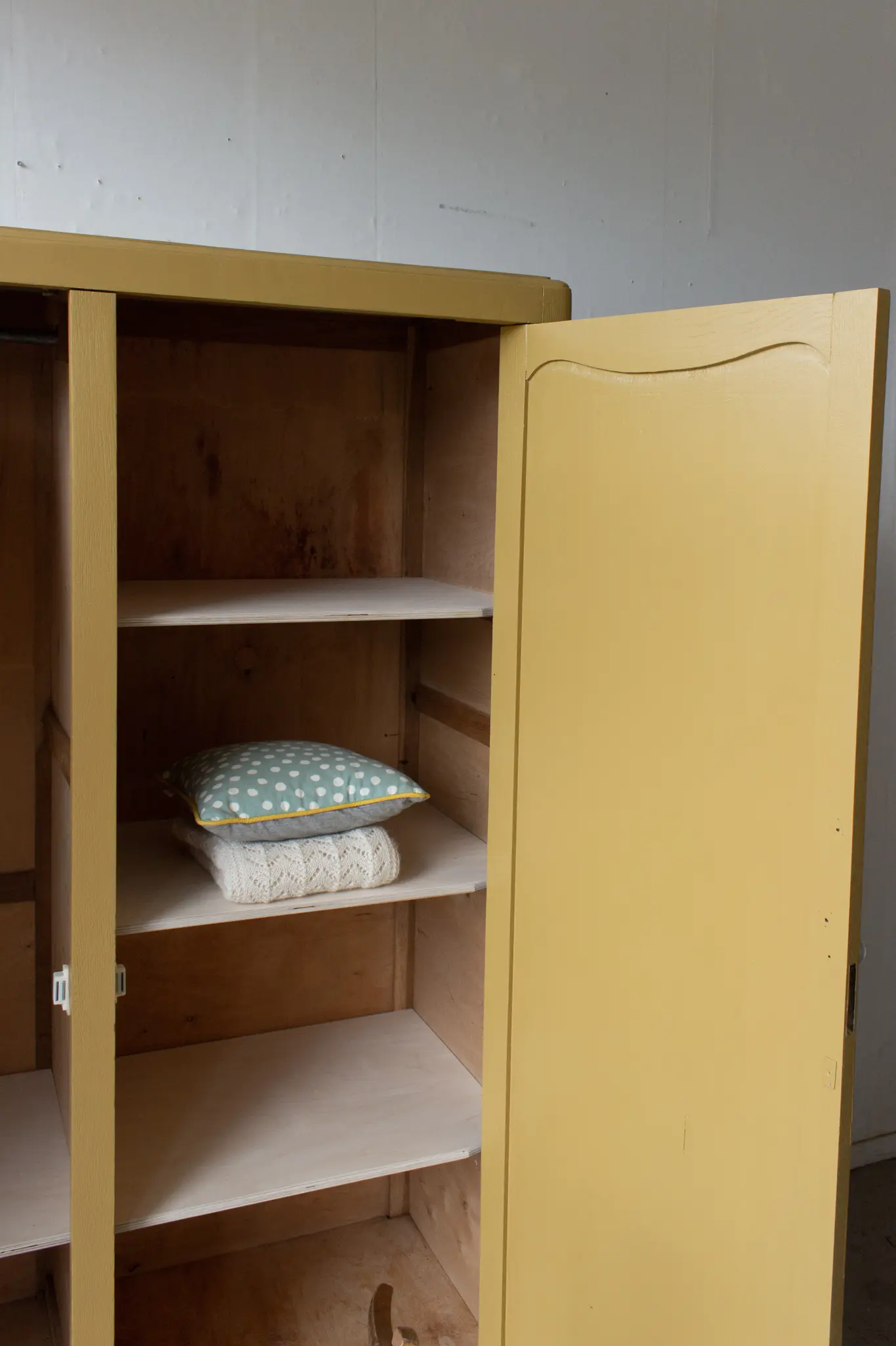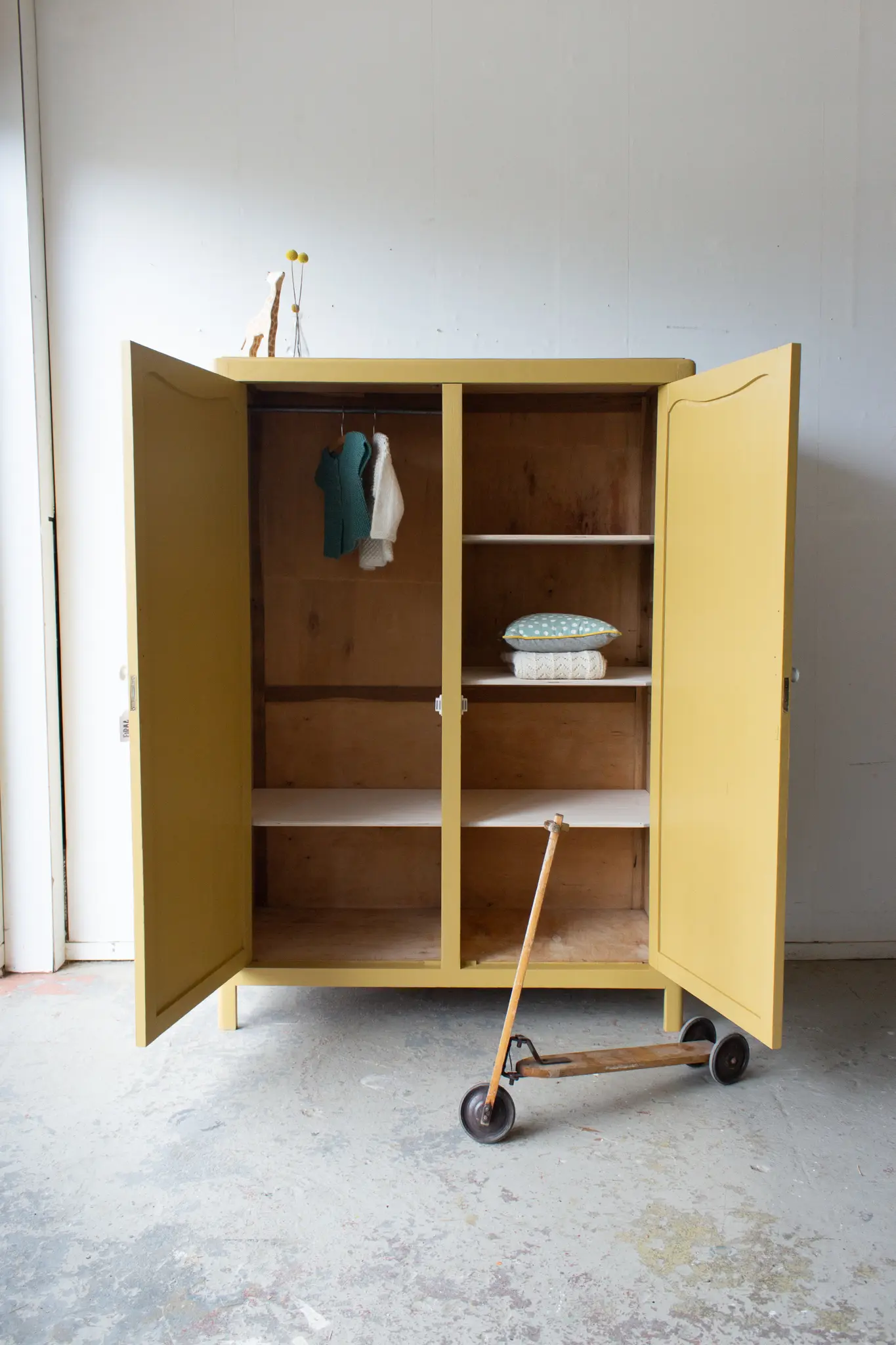 Een ideale kast voor op de kinderkamer. Niet al te hoog, wel diep genoeg voor zowel hang- als legkleding. En een fijne breedte. Toen we de kast binnenkregen zaten er geen planken of roede in. Wij besloten rechts drie plankjes te maken en links een plank en een roede. De kast heeft strakke buitenlijnen, de golf in de deur en de sierlijke knopjes zorgen voor een perfecte mate van speelsheid. De kast is grondig schoongemaakt en heeft een behandeling tegen houtworm gehad. De deuren sluiten door middel van magneetjes. Nu is hij weer helemaal klaar voor een nieuwe plek!