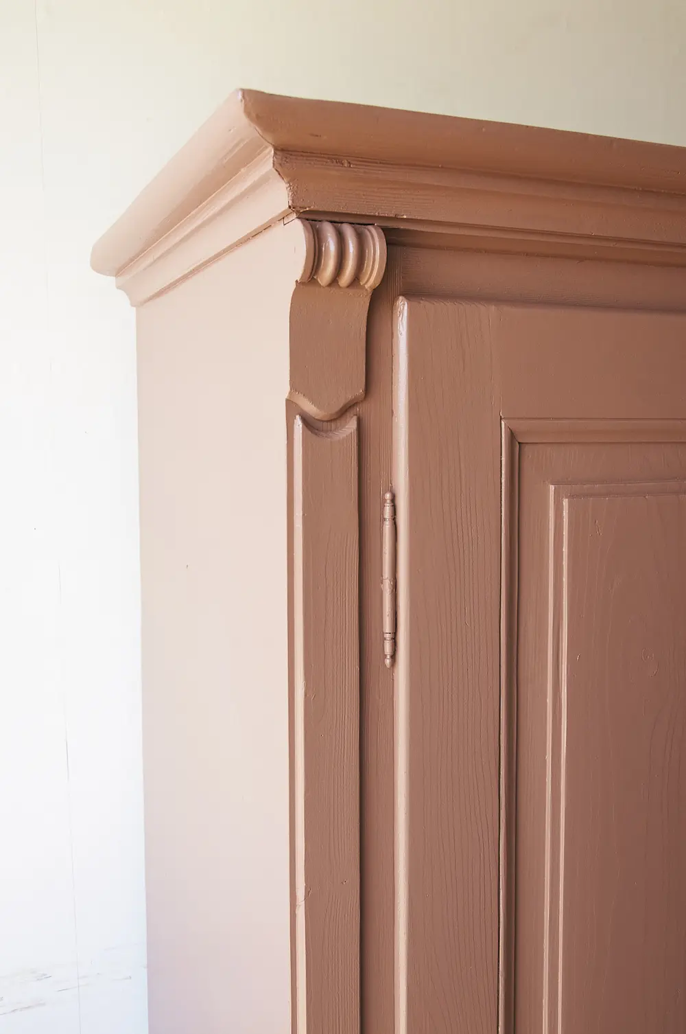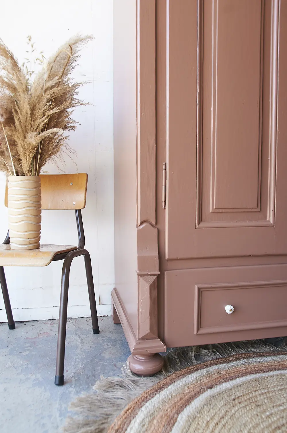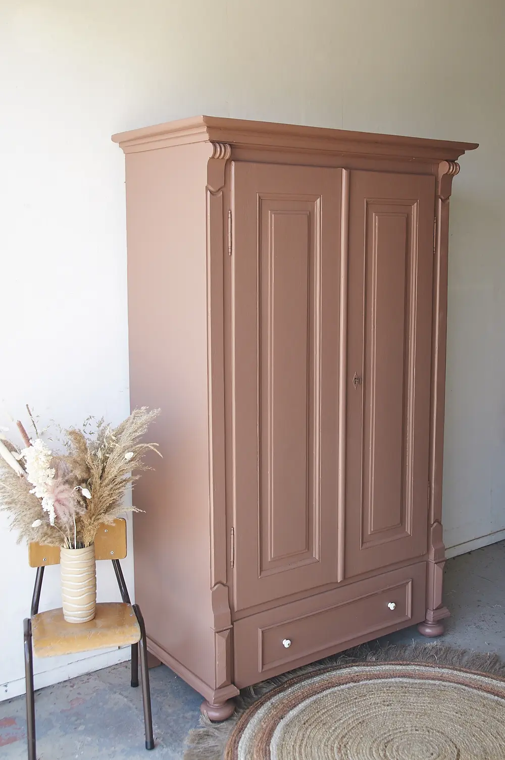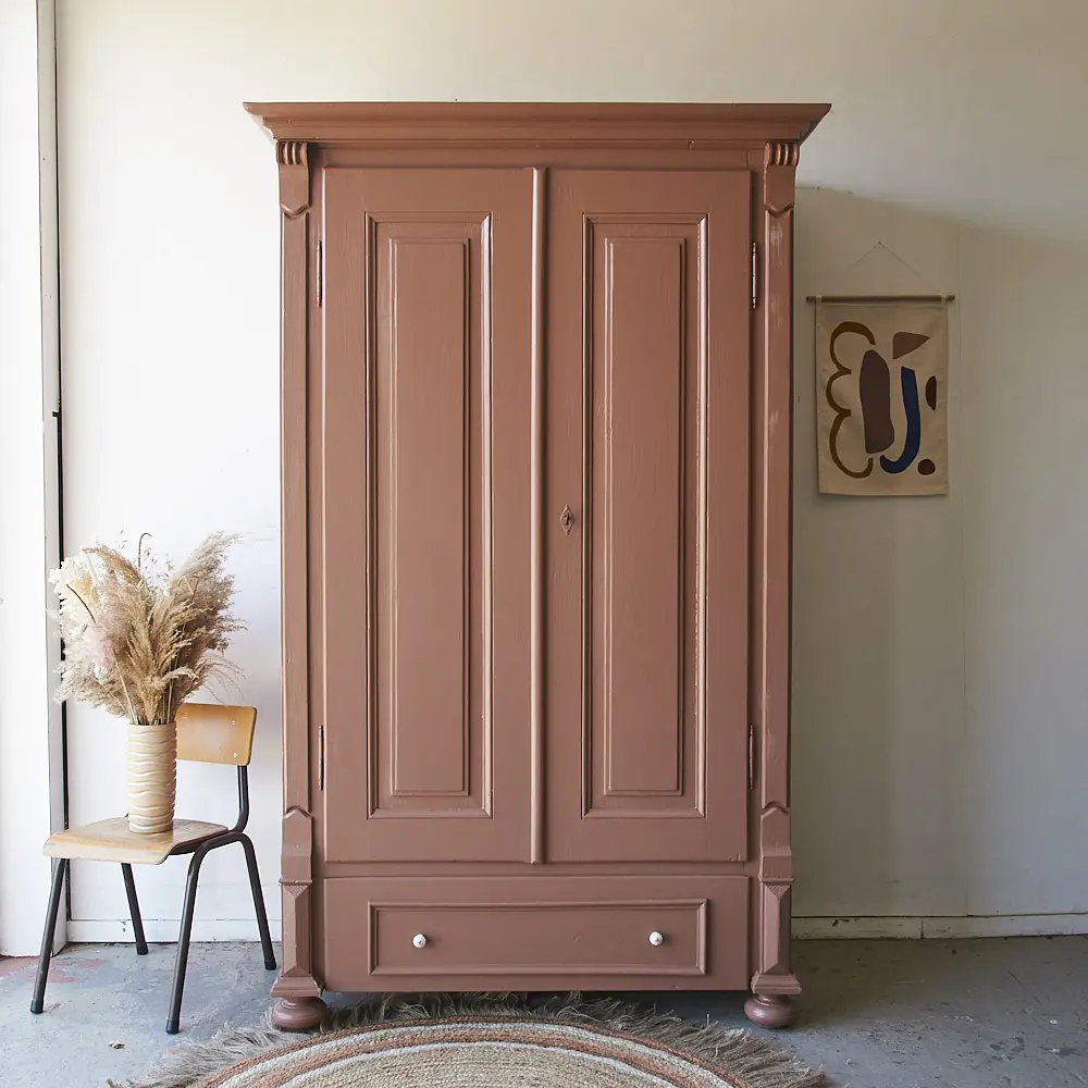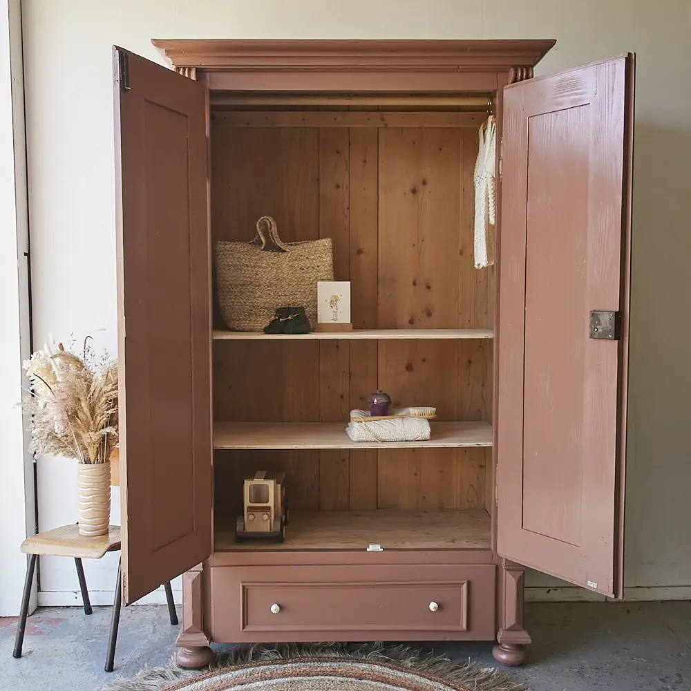 Zo’n leuke kast voor op de baby- of kinderkamer! Toen we deze kast binnenkregen waren we meteen verkocht. Nadat hij was kaal gemaakt hebben we hem grondig schoongemaakt en behandeld tegen houtworm. De kast had geen indeling, we vonden dit een kast waar zowel een roede als planken in mochten en dat hebben we gedaan. De lade biedt nog extra opslagruimte, heel fijn! We hebben de kast in deze mooie oud roze kleur geschilderd genaamd vijg. De lade hebben we afgewerkt met twee leuke porseleinen knopjes, het linker deur sluit met een schuifje en het rechterdeurtje sluit met de sleutel. Deze kast is weer helemaal klaar voor gebruik!