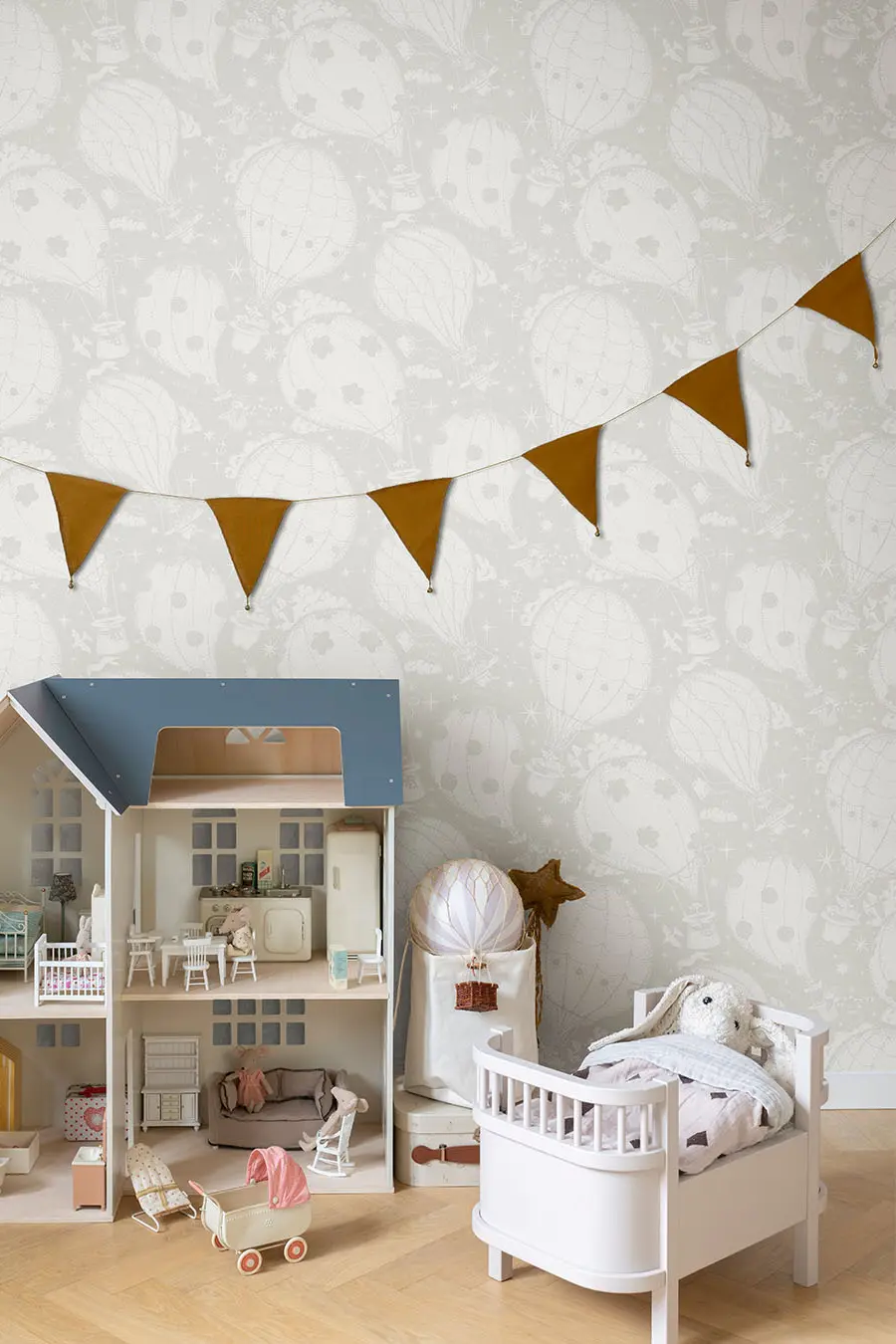 Dit prachtige behang met luchtballonnen neemt je mee omhoog naar een andere wereld. De zachte pasteltinten in dit behang matchen heel goed met een vintage meubel in een van de kleuren van Firma Zoethout. Het zachte beige leent zich heel mooi voor een rustige baby- of kinderkamer waarbij onze poederachtige kleuren Maan, Linnen of Bloesem een mooie combinatie vormen met het behang. Maar ook met de warmere, donkere tinten kan je prachtige combinaties maken met deze fijne zandkleurige basistint.