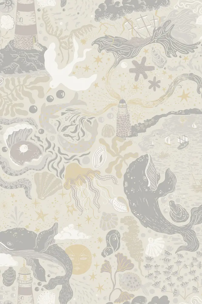 Welkom in deze onderwaterwereld, waarin zeesterren, parels, schelpen, vissen en allerlei ander moois te vinden is. Het behang heeft prachtige, zachte kleuren in zich die, ondanks de drukkere behangprint, toch een rustige sfeer zullen creëren in de slaapkamer van je kindje. Het matcht dan ook perfect met de subtielere kleuren uit ons kleurenpalet zoals Linnen, Amandel, Hazel en Maan. Wil je juist de gele tonen benadrukken uit het behang, kies dan voor onze prachtige Kamille of Saffraan op je vintage meubel.