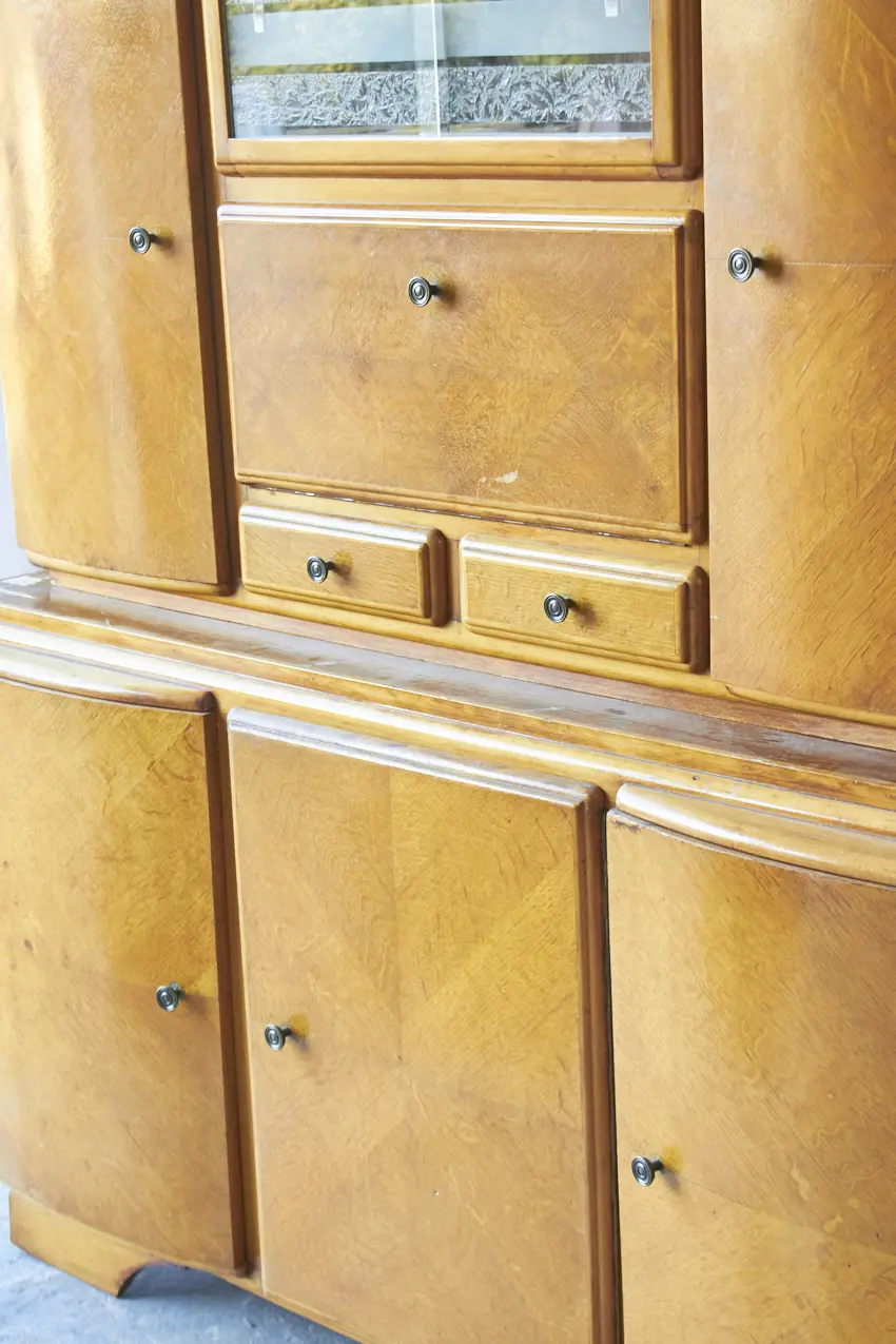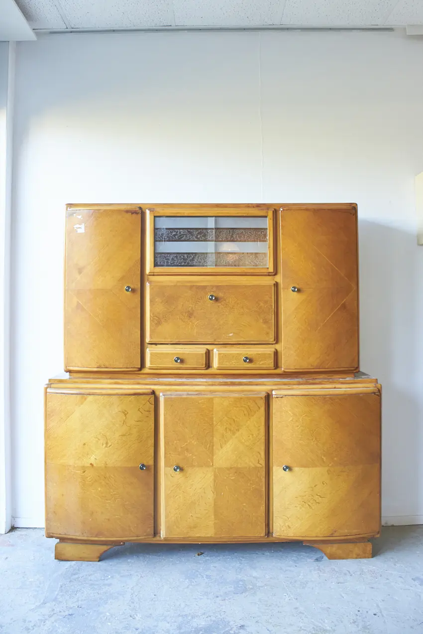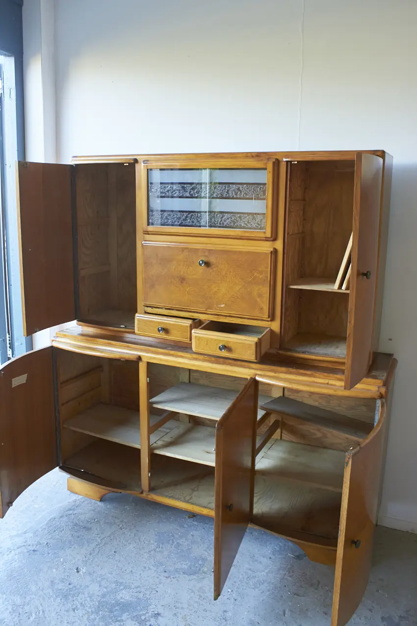 Wauw, een grote retrobuffet kast. Echt onze lievelings. Met zoveel deurtjes en lades. Deze kast is helemaal naar jouw wens samen te stellen! We kunnen er nog een open vak in maken of de kast in twee delen opknappen.