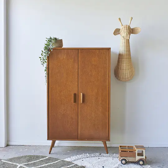 Wauw! We hebben ze niet vaak, retro kastjes zoals deze. We konden daarom ook niet wachten om er mee te beginnen. Het is een kleiner kledingkastje van 138,5 cm hoog. Een stukje kleiner, maar daarom perfect voor op de baby- of kinderkamer! Maar ook in de hal zal hij mooi staan, voor jasjes, sjaals en handschoenen. De indeling is origineel. Er zit een roede in die je kunt uitschuiven. Zo kun je gemakkelijk bij alle kleding, ook het kledingstuk wat achterin hangt. De 3 mooie afgeronde plankjes zijn fijn om kleding neer te leggen. Toen dit kastje binnenkwam hebben we hem meteen onder handen genomen. We hebben hem goed schoongemaakt en de nodige reparaties gedaan. De pootjes zaten los, dus deze hebben we weer goed vastgezet. Ook de originele houten handgrepen zitten weer goed vast. Op wat kleine beschadigingen in het hout na, was hij in zo’n goede staat dat we de kast in de originele kleur konden behouden. Dit gebeurd niet vaak, maar wat fijn dat het bij deze fijne kast wel kon! Je ziet aan de linkerkant wel wat kleurverschil door de zon, een groot gedeelte van het hout aan deze kant is wat lichter. We hebben de gehele kast zorgvuldig een nieuwe laag meubelolie gegeven en nu is hij weer helemaal klaar voor een nieuwe plek. Wat zal hij mooi staan in huis!