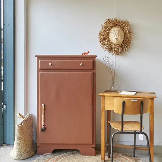 Wat een leuk kastje is dit. Een fijn klein formaatje, deze kast past in elke ruimte in huis. In de kinderkamer vol met kleding of in de woonkamer voor spelletjes en ander speelgoed. Dit is een kastje waar we zelf altijd heel blij van worden, zeker met die leuke pootjes. We hebben hem eerst goed schoongemaakt, ontdaan van al zijn oude lagen en vervolgens behandeld tegen houtworm. De rechter zijkant is vervangen en de planken en lade hebben we goed geschuurd. De lade gaat nu weer fijn open en dicht. We hebben hem geschilderd in onze kleur roest, wat ons betreft de perfecte kleur voor deze kast. Een warme aardse tint met veel karakter. De lieve porseleinen knopjes maken de kast helemaal af. Dat leuke tafeltje is ook te koop bij ons, klik HIER.