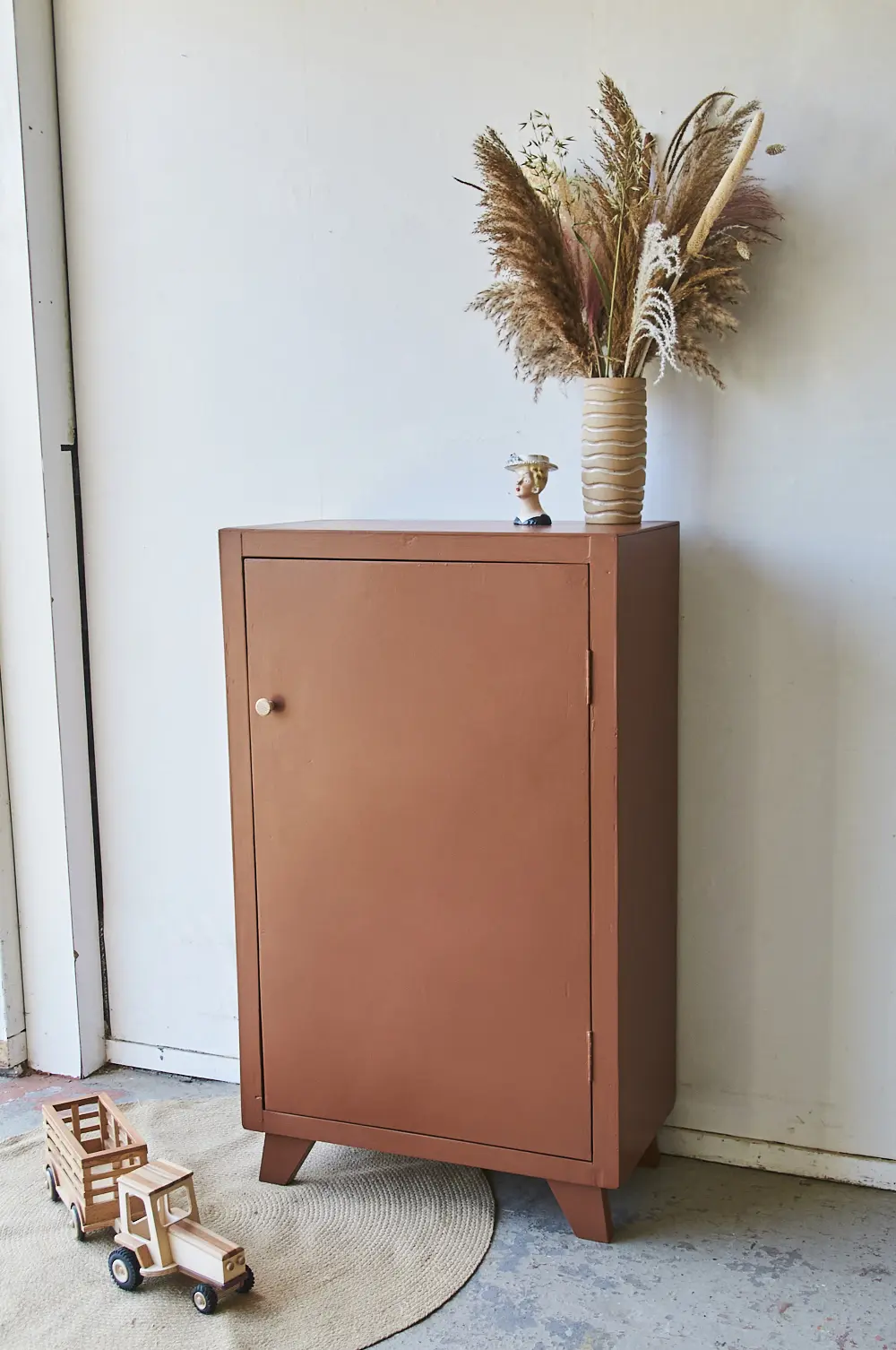 Roest is een stoere roodbruine kleur. Je komt deze kleur veel tegen op muren, wij vonden de perfecte tint voor op een meubel en daar zijn we heel blij mee! Een warme aardse tint met veel karakter. Roest past mooi samen met houtkleuren en met groen, zoals onze Rozemarijn bijvoorbeeld! Een grote groene plant naast je net geschilderde kast, een prachtige combinatie die twee!