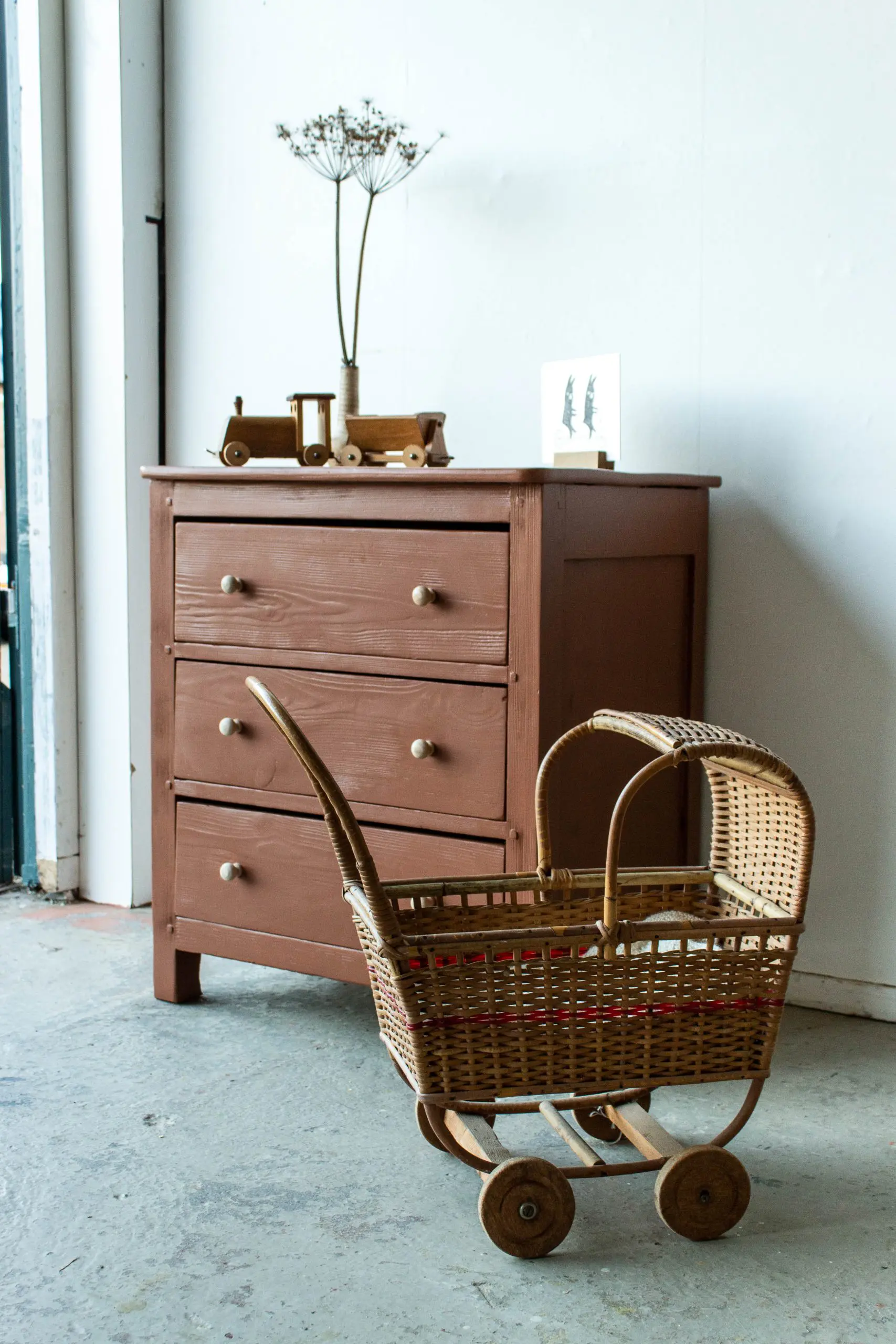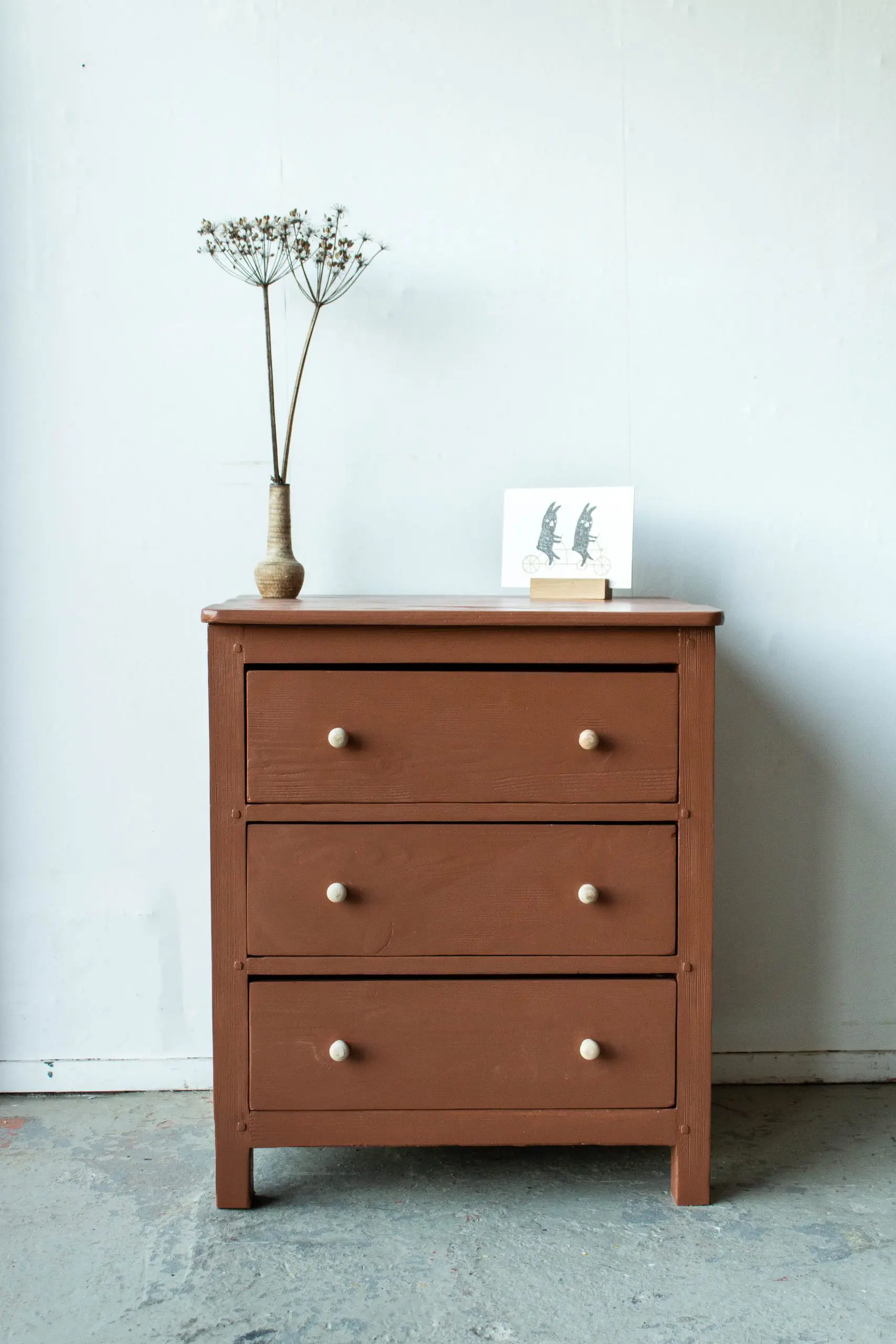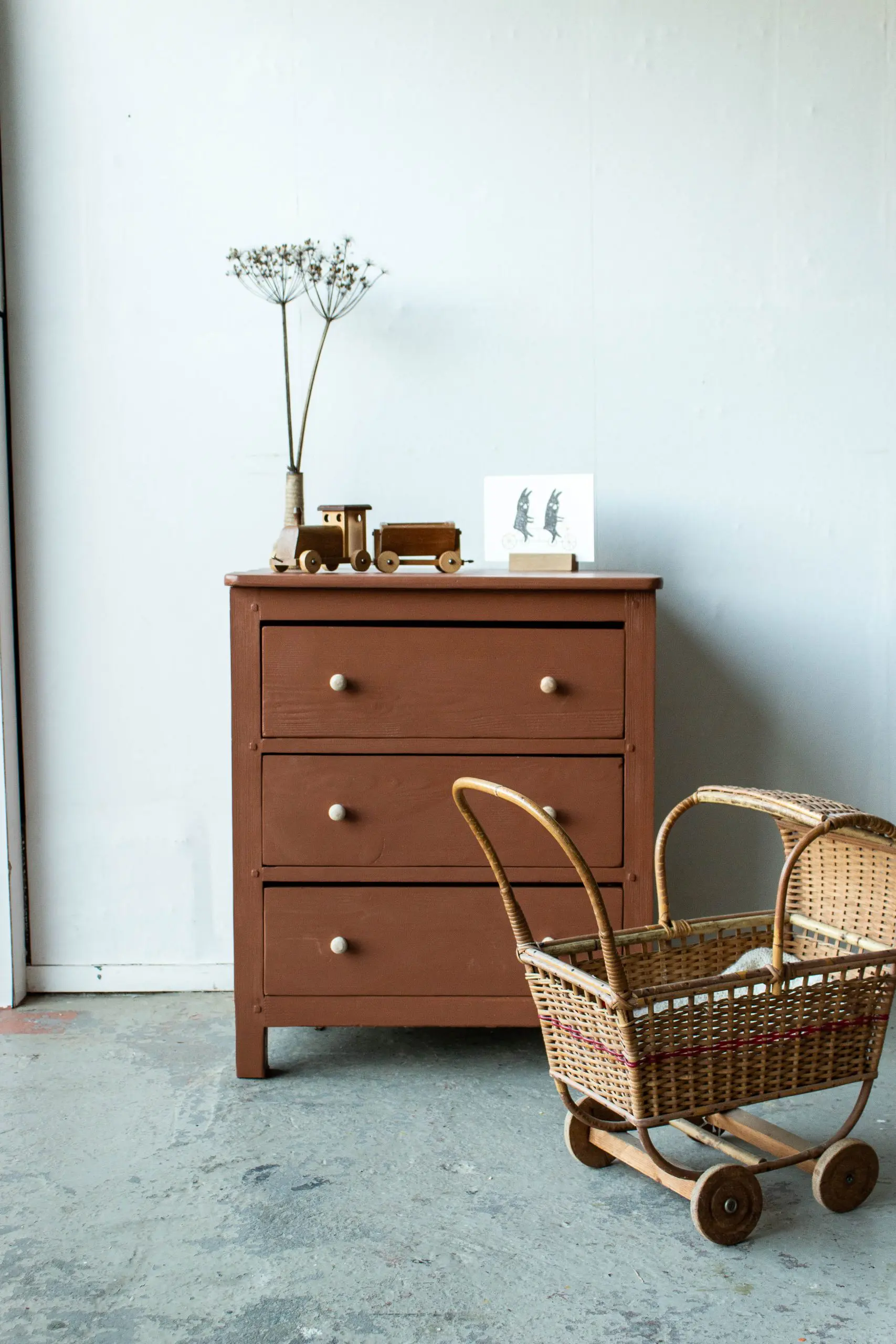 Dit mooie oude ladenkastje komt uit België. Het grenenhouten kastje gaat al een hele tijd mee, maar is nog erg stevig en leuk! Wij hebben hem goed schoongemaakt en helemaal nagelopen. We kozen voor deze warme roestkleur. Wat is ie leuk geworden met deze kleur! Op de laden hebben we mooie simpele houten knopjes gezet. Een geweldig kastje voor op de kinderkamer, om sokken en ondergoed in op te bergen bijvoorbeeld. Of voor speelgoed natuurlijk. Klaar voor gebruik.