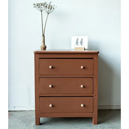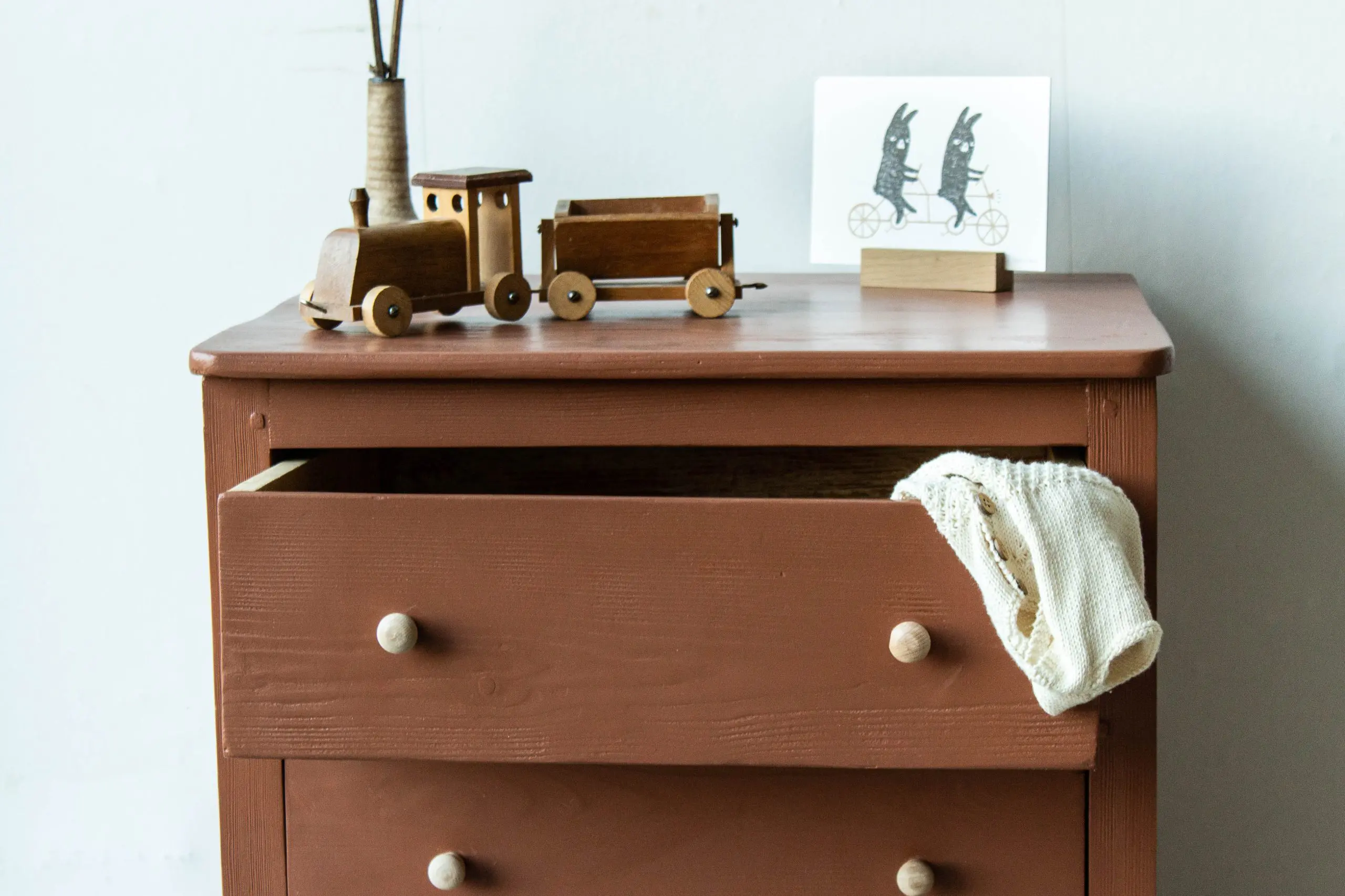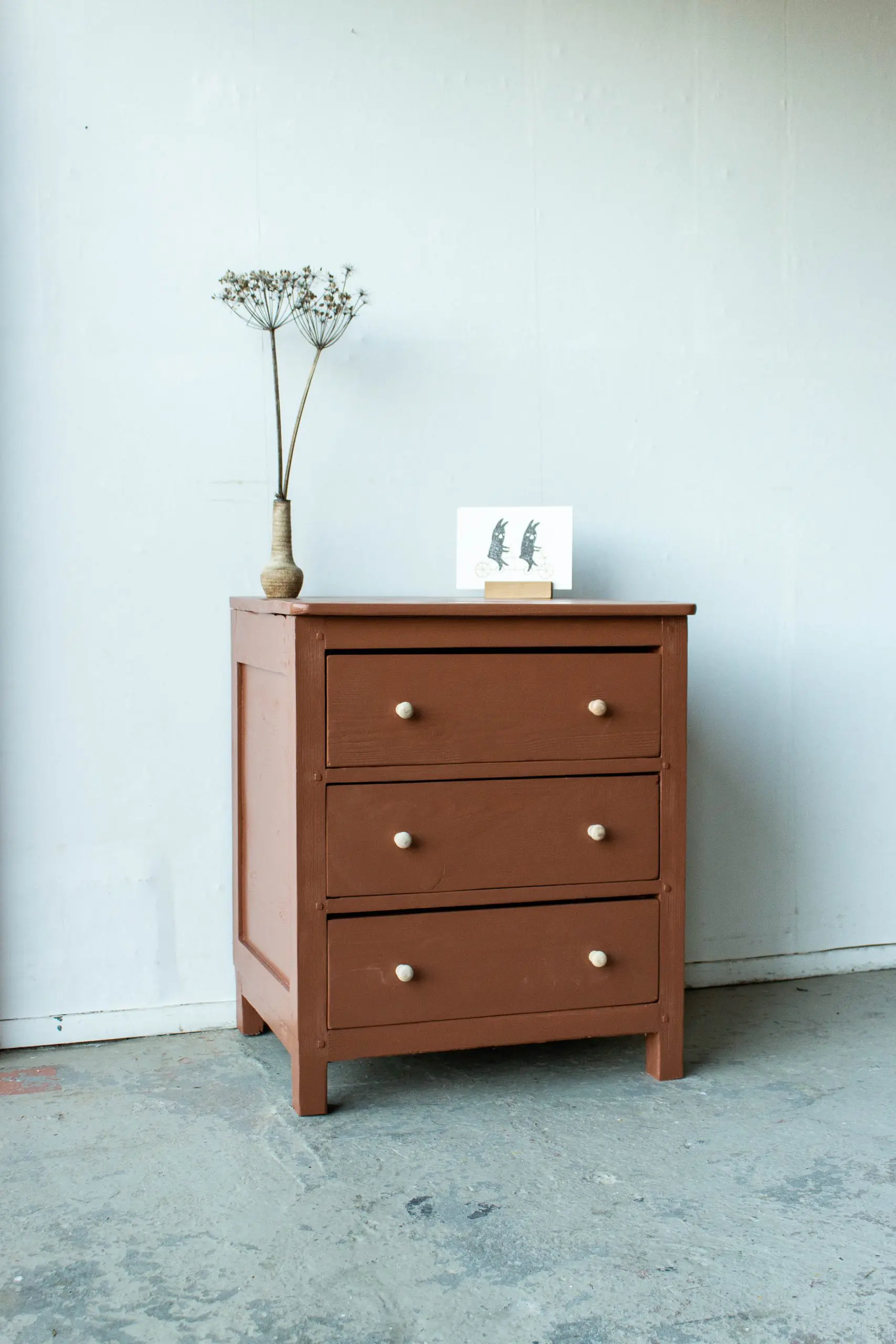 Dit mooie oude ladenkastje komt uit België. Het grenenhouten kastje gaat al een hele tijd mee, maar is nog erg stevig en leuk! Wij hebben hem goed schoongemaakt en helemaal nagelopen. We kozen voor deze warme roestkleur. Wat is ie leuk geworden met deze kleur! Op de laden hebben we mooie simpele houten knopjes gezet. Een geweldig kastje voor op de kinderkamer, om sokken en ondergoed in op te bergen bijvoorbeeld. Of voor speelgoed natuurlijk. Klaar voor gebruik.