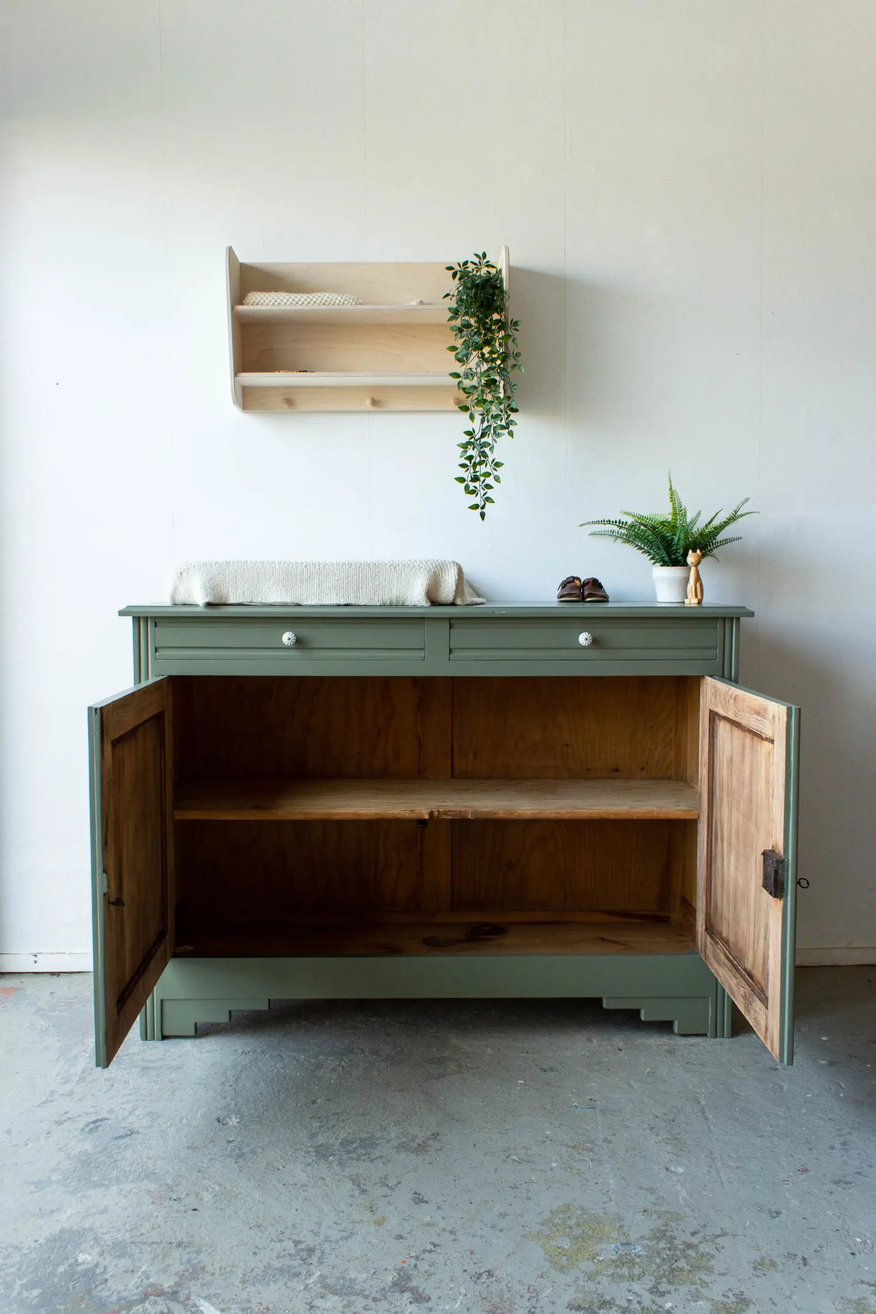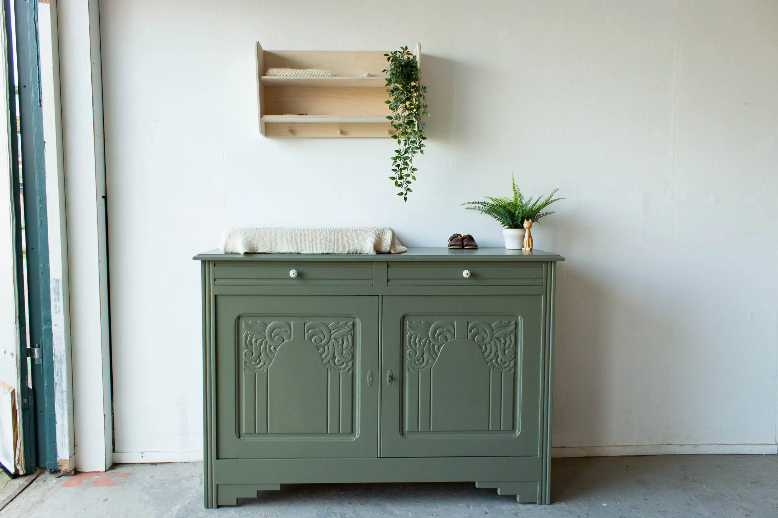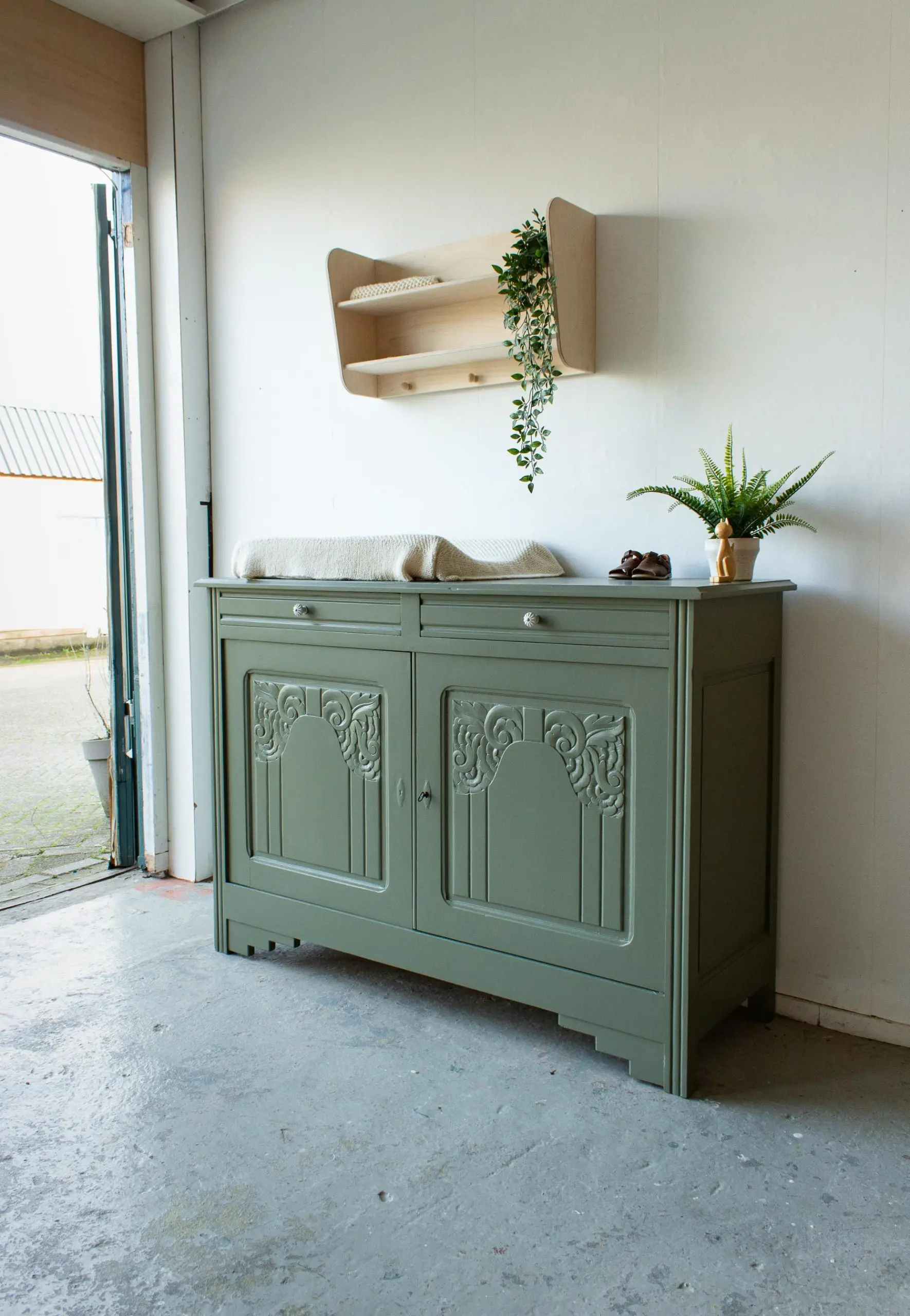 Deze prachtige vintage commode komt uit Midden Frankrijk, uit de buurt van Limoges. Het mooie houtsnijwerk op de deuren maken hem erg bijzonder en heel sierlijk. De commode is grondig schoongemaakt en gerepareerd waar nodig. Daarna is hij in deze warme rozemarijngroene kleur geschilderd. Op de laatjes zijn tot slot sierlijke knopjes van porselein gezet, De deuren sluiten door middel van een haakje en de originele sleutel. En zo is deze ruime en robuuste vintage commode klaar voor een volgend leven! Heel mooi om te combineren met het houten wandplankje van Firma Zoethout!