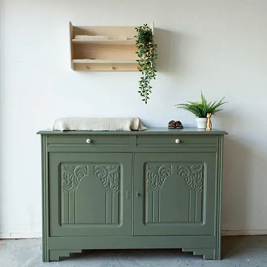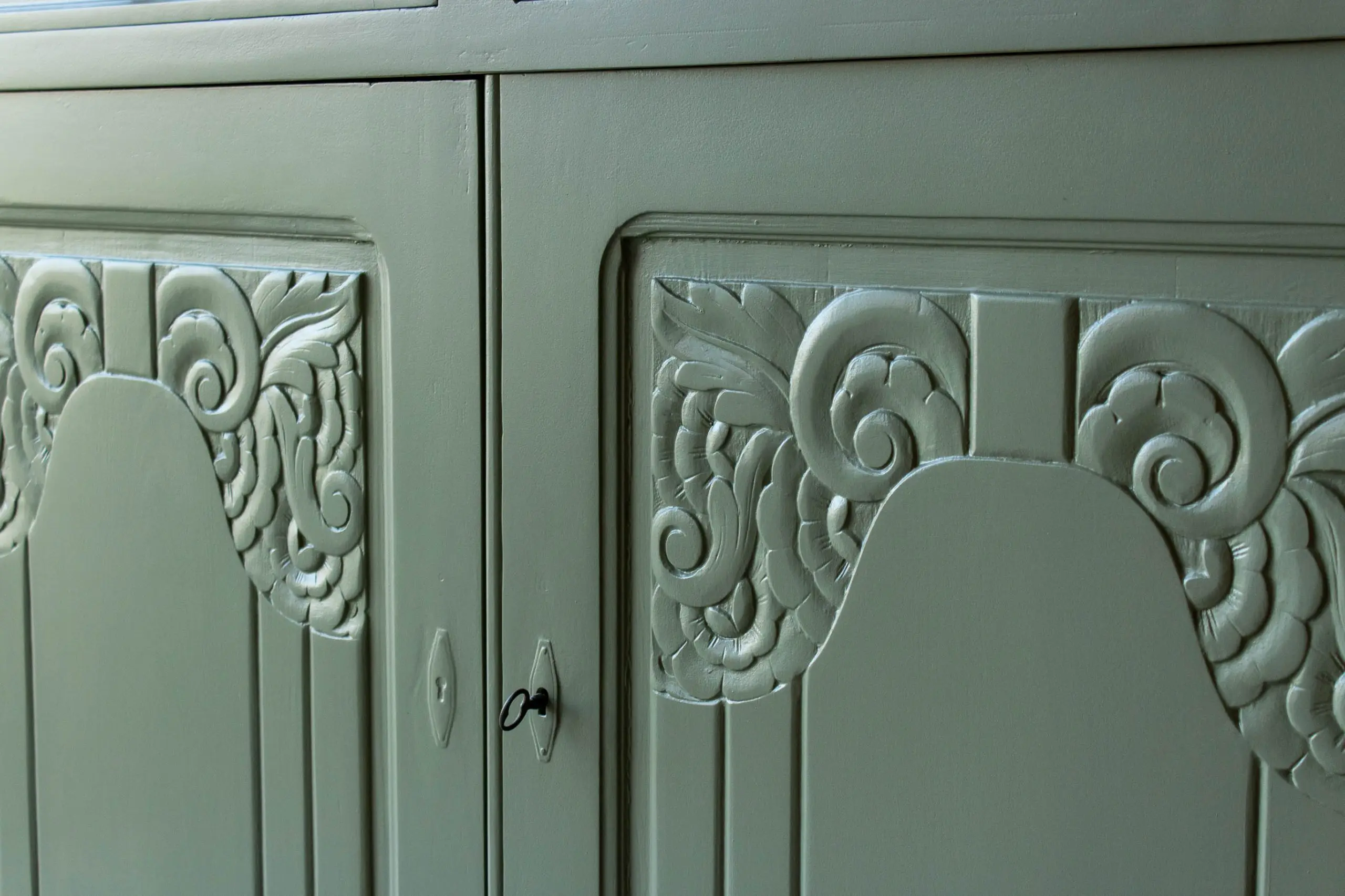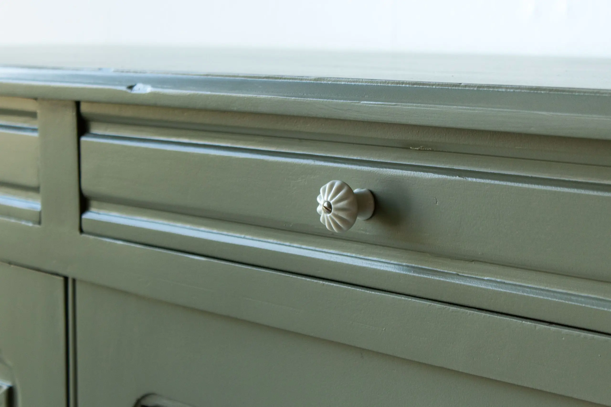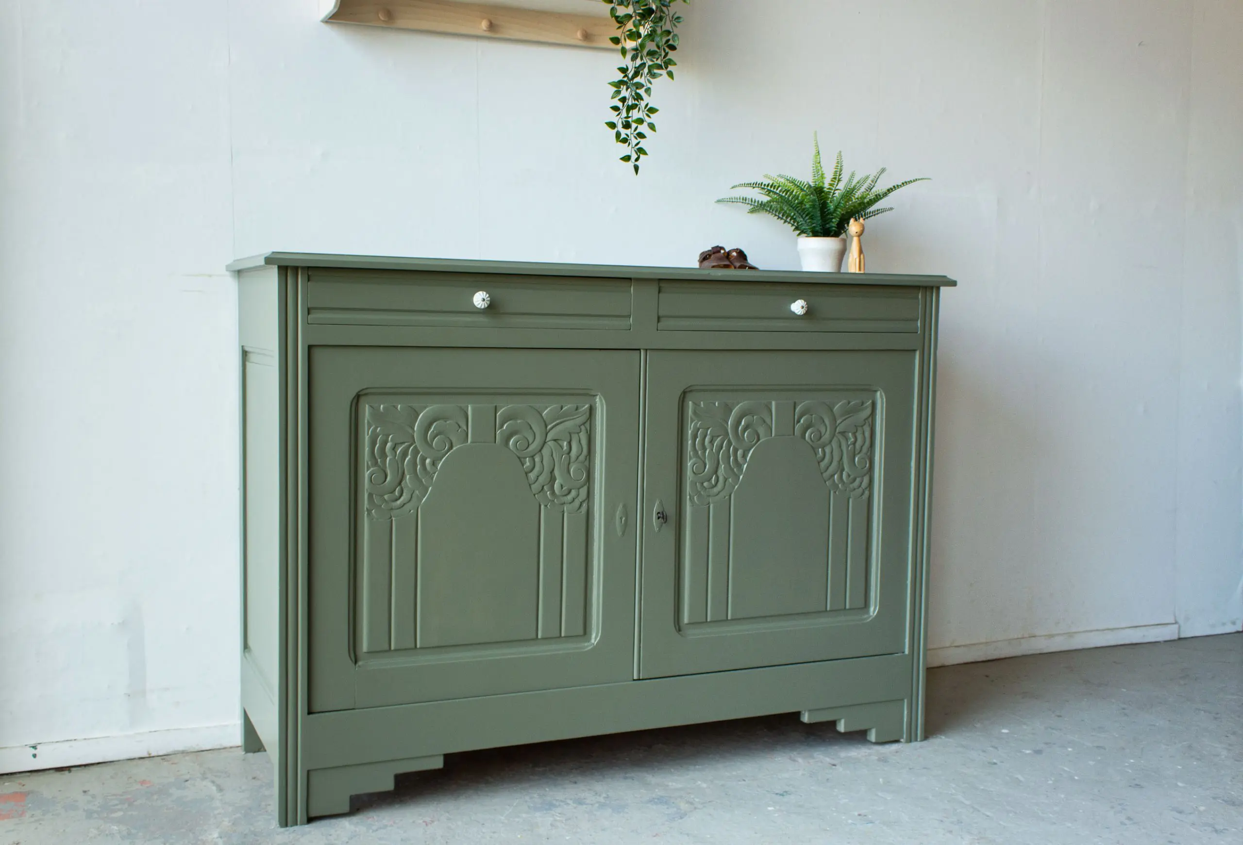 Deze prachtige vintage commode komt uit Midden Frankrijk, uit de buurt van Limoges. Het mooie houtsnijwerk op de deuren maken hem erg bijzonder en heel sierlijk. De commode is grondig schoongemaakt en gerepareerd waar nodig. Daarna is hij in deze warme rozemarijngroene kleur geschilderd. Op de laatjes zijn tot slot sierlijke knopjes van porselein gezet, De deuren sluiten door middel van een haakje en de originele sleutel. En zo is deze ruime en robuuste vintage commode klaar voor een volgend leven! Heel mooi om te combineren met het houten wandplankje van Firma Zoethout!