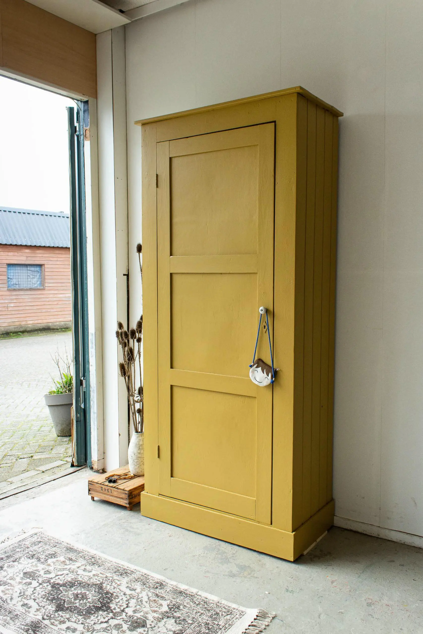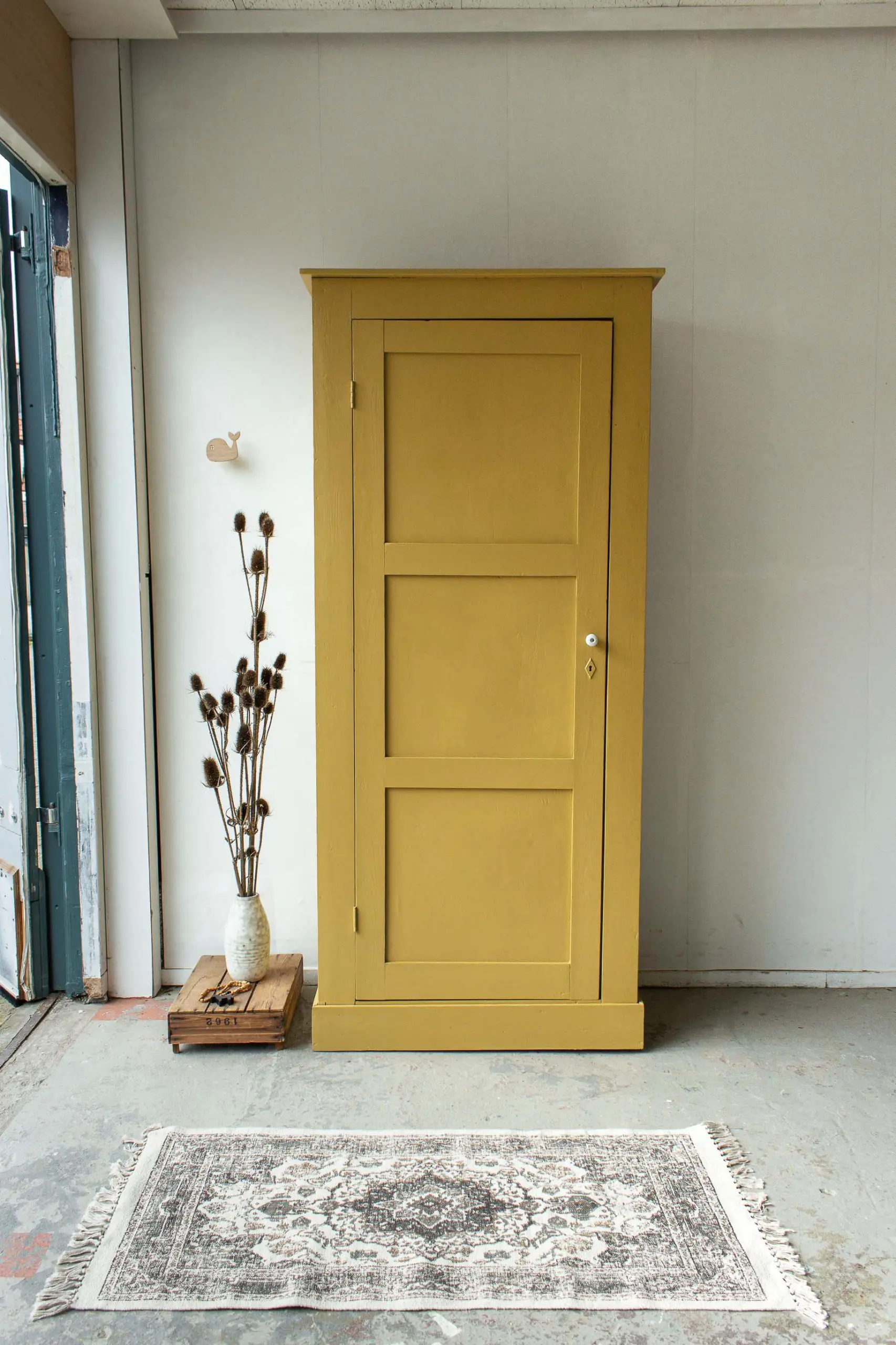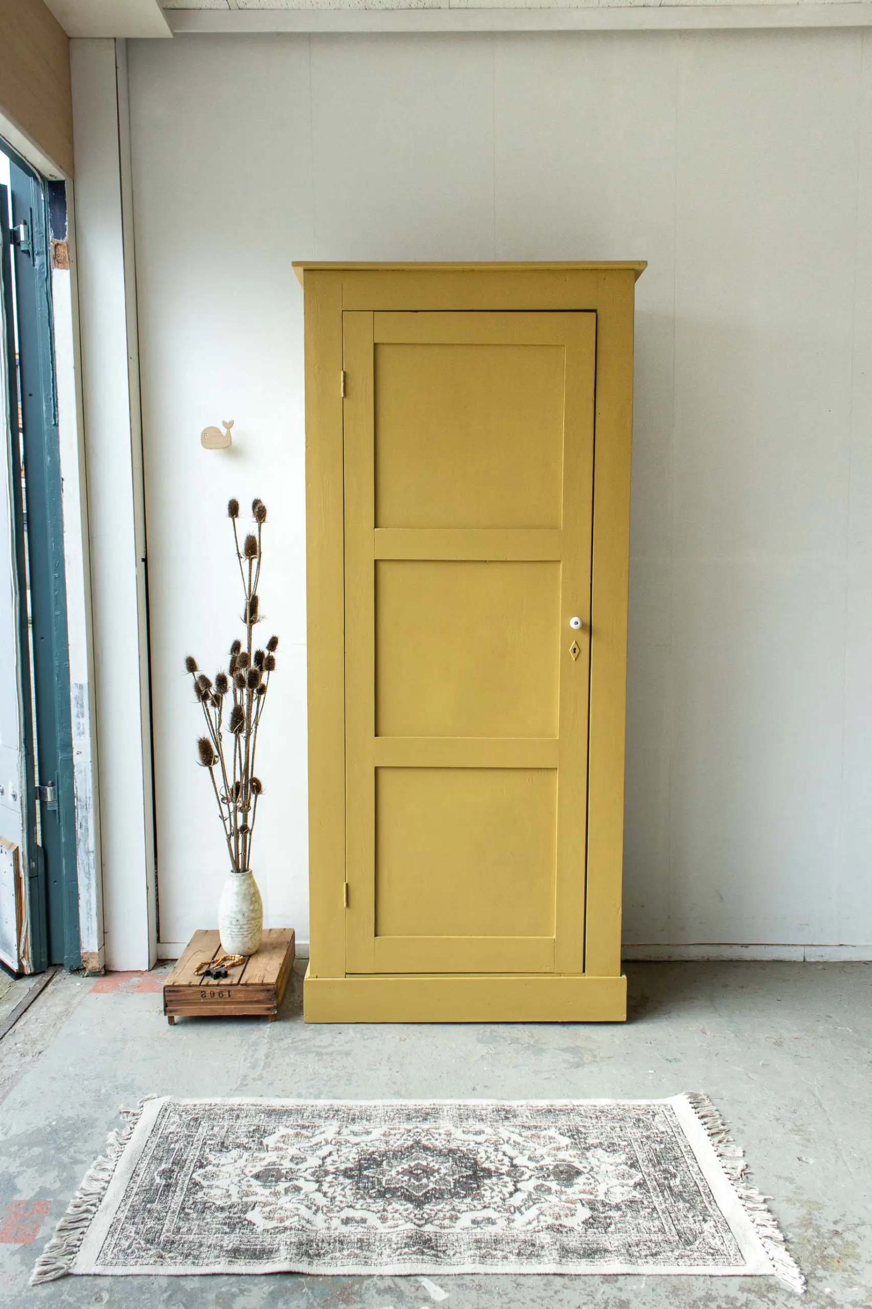 Wat een leuke vintage kast! Met vijf houten plankjes biedt deze leukerd volop ruimte voor alle spelletjes en knutselspullen. Maar hij kan natuurlijk ook heel goed als kledingkast gebruikt worden! Na de grote schoonmaakbeurt, is de kast helemaal nagelopen. En daarna hebben we hem in deze prachtige saffraangele kleur geschilderd. Op de deur is tot slot een simpel knopje van porselein gezet. En zo is deze geweldige vintage kast weer klaar voor een volgend leven!
