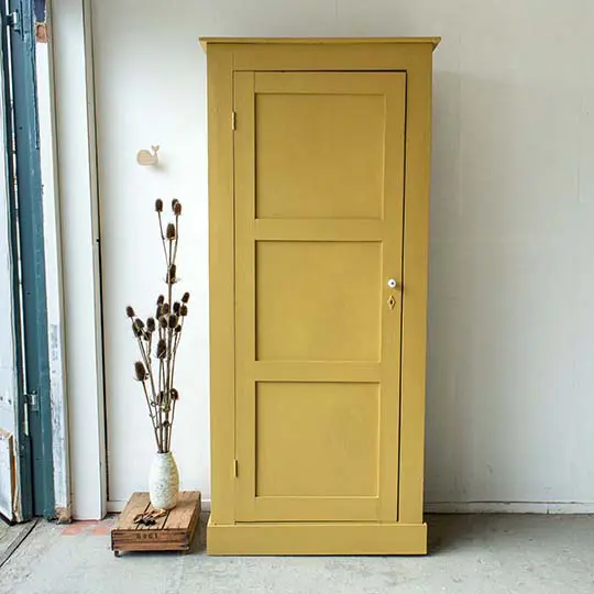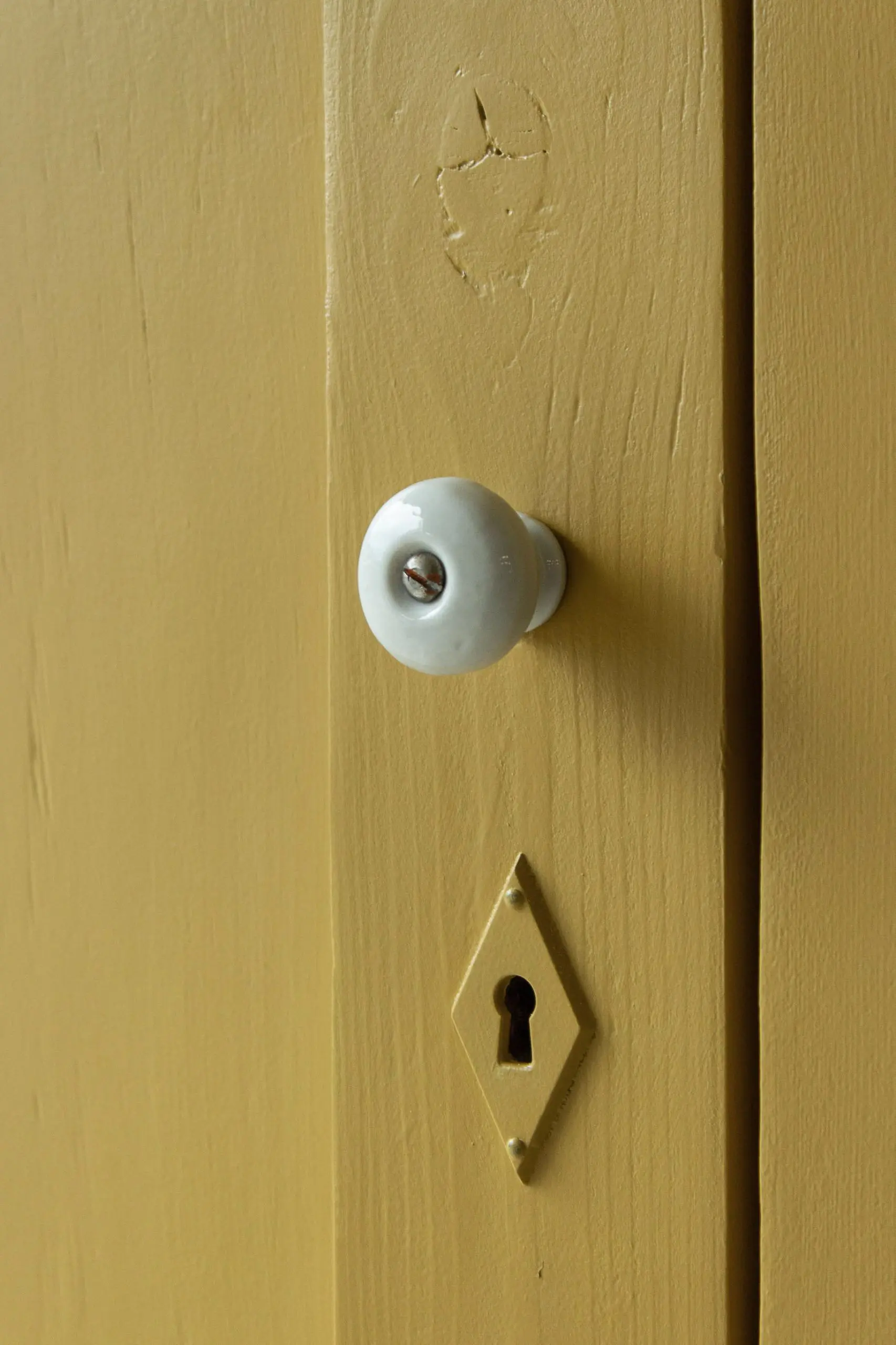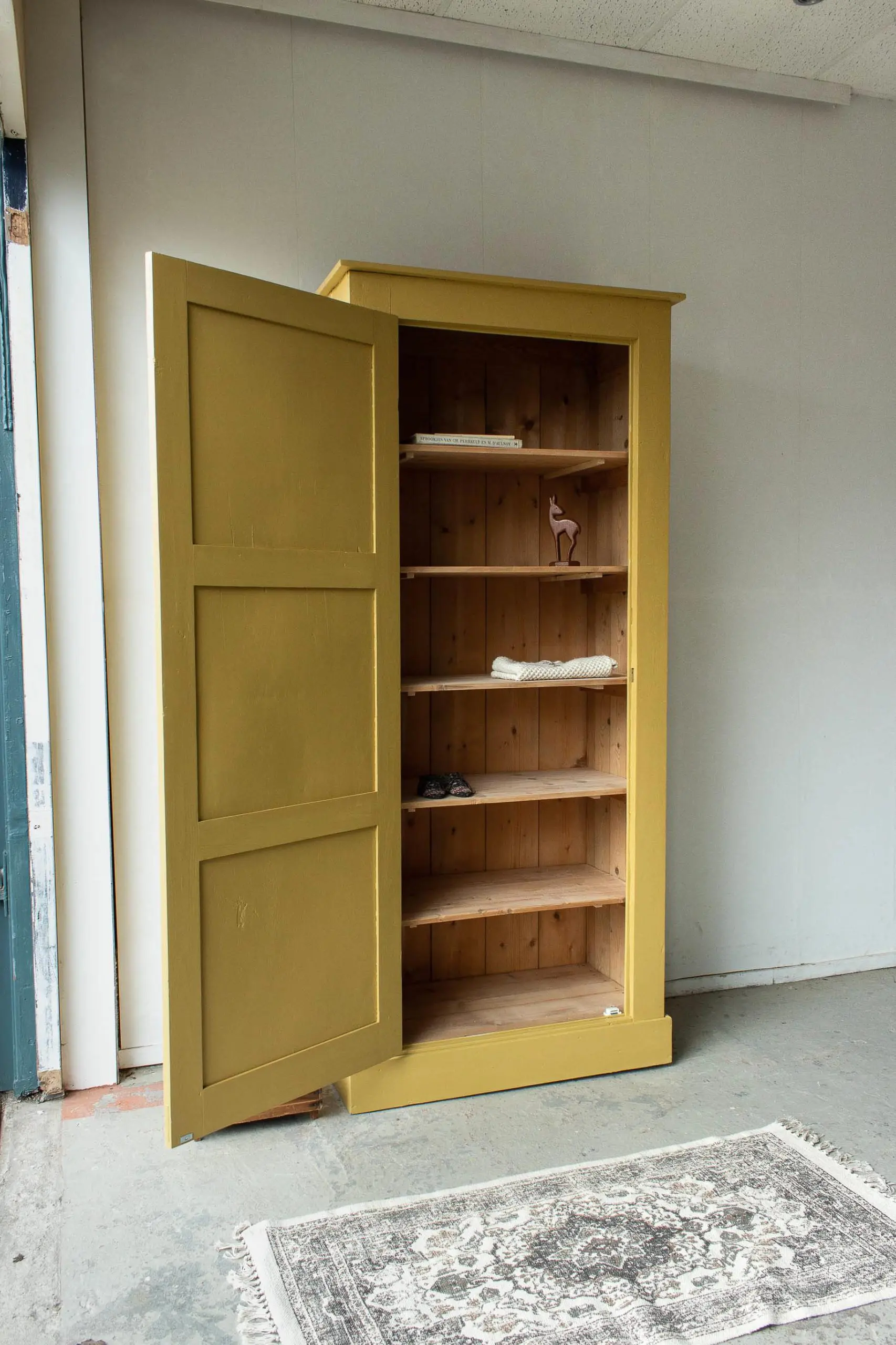 Wat een leuke vintage kast! Met vijf houten plankjes biedt deze leukerd volop ruimte voor alle spelletjes en knutselspullen. Maar hij kan natuurlijk ook heel goed als kledingkast gebruikt worden! Na de grote schoonmaakbeurt, is de kast helemaal nagelopen. En daarna hebben we hem in deze prachtige saffraangele kleur geschilderd. Op de deur is tot slot een simpel knopje van porselein gezet. En zo is deze geweldige vintage kast weer klaar voor een volgend leven!