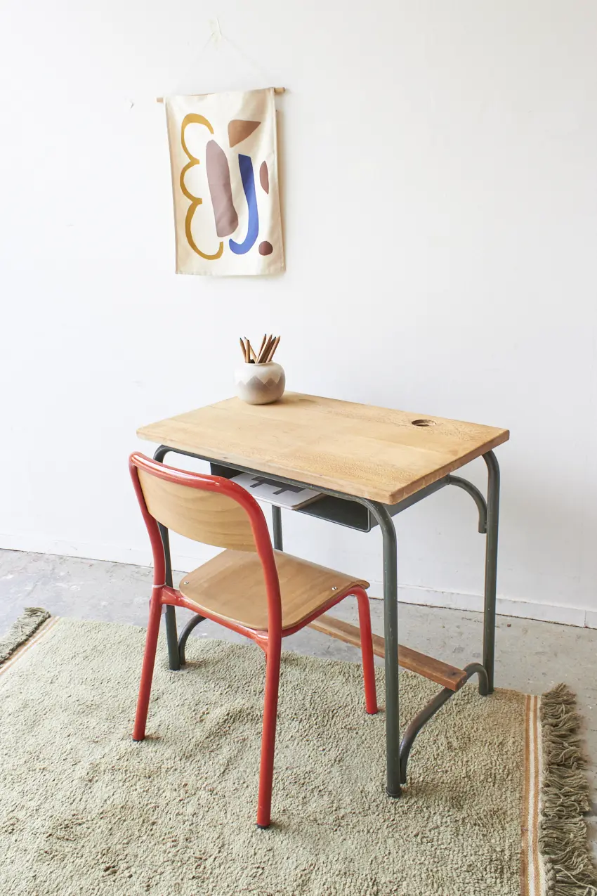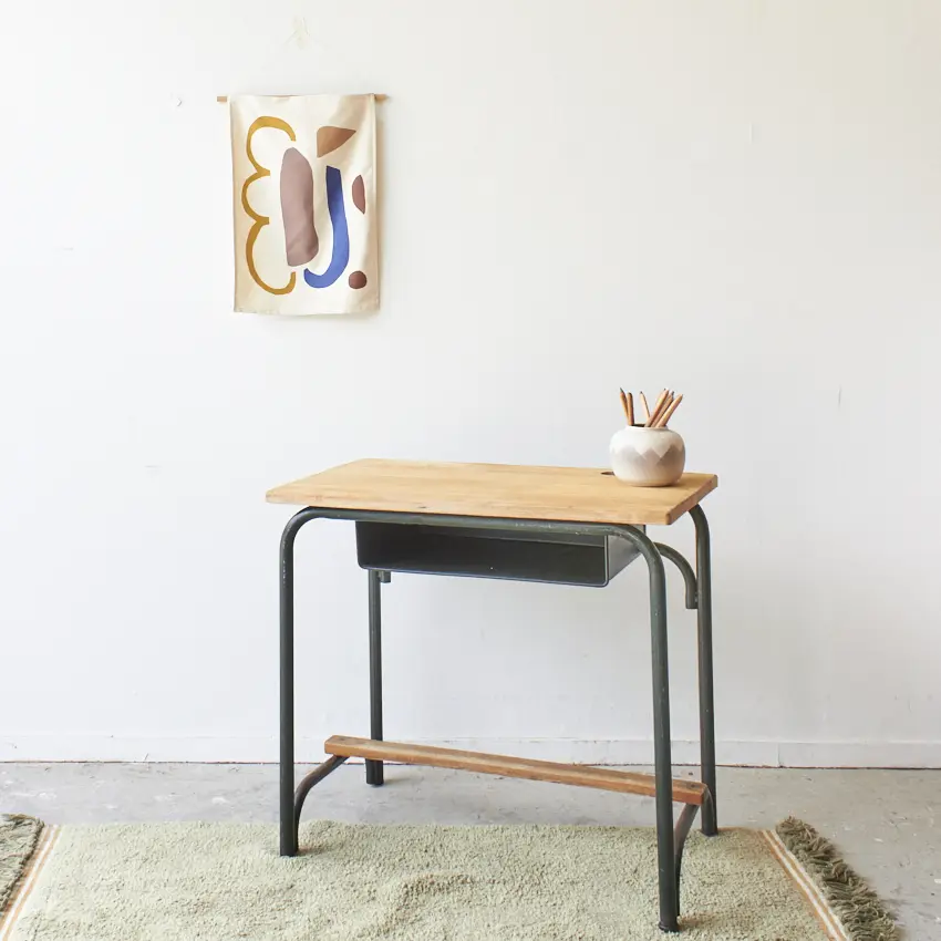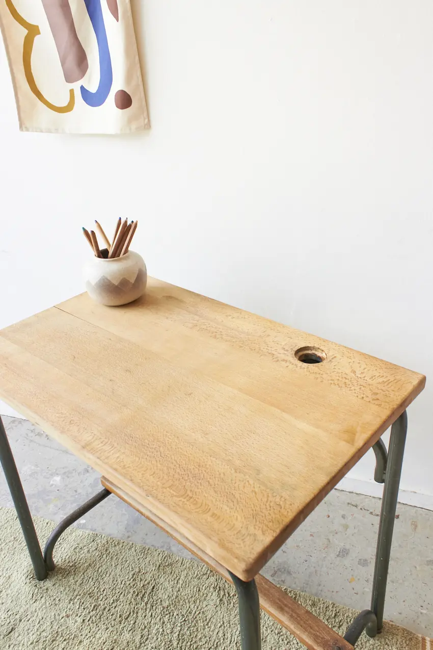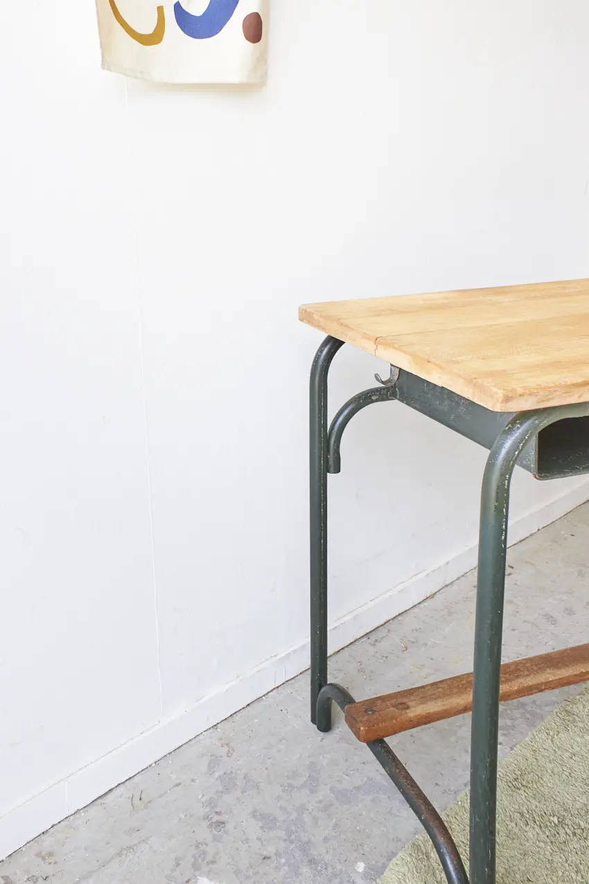 Een fijne schooltafel met een sterk groen metalen frame en mooi houten blad. Onder het blad is er genoeg ruimte om tekeningen en boekjes in op te bergen. En in het blad zit nog een gat voor een inktpotje. Wat een leukerd!