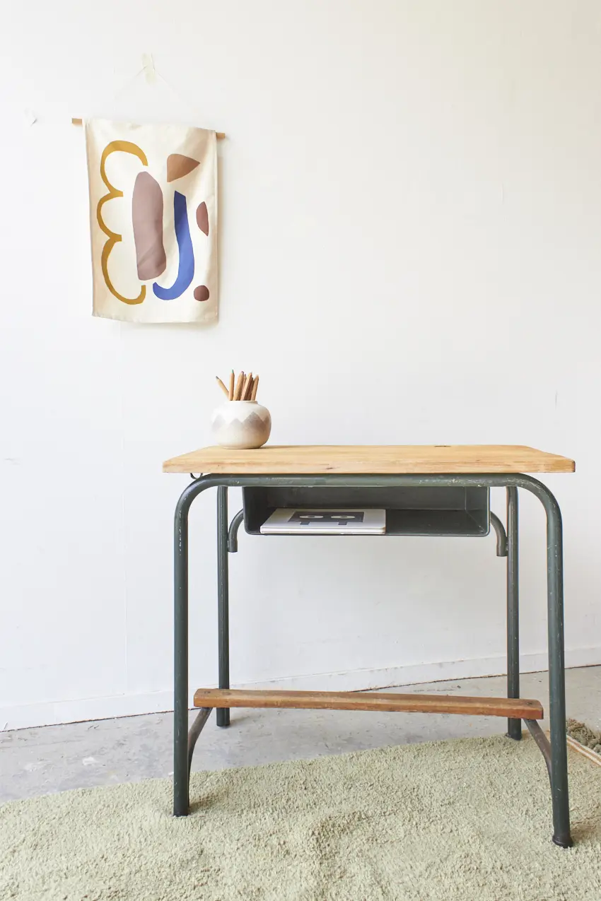 Schooltafel met groene metalen poten