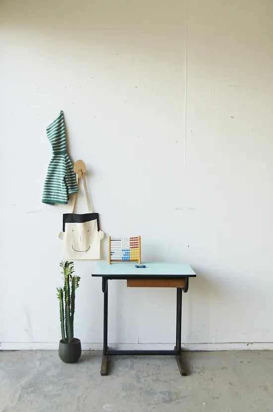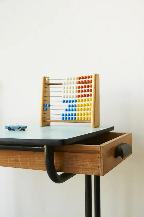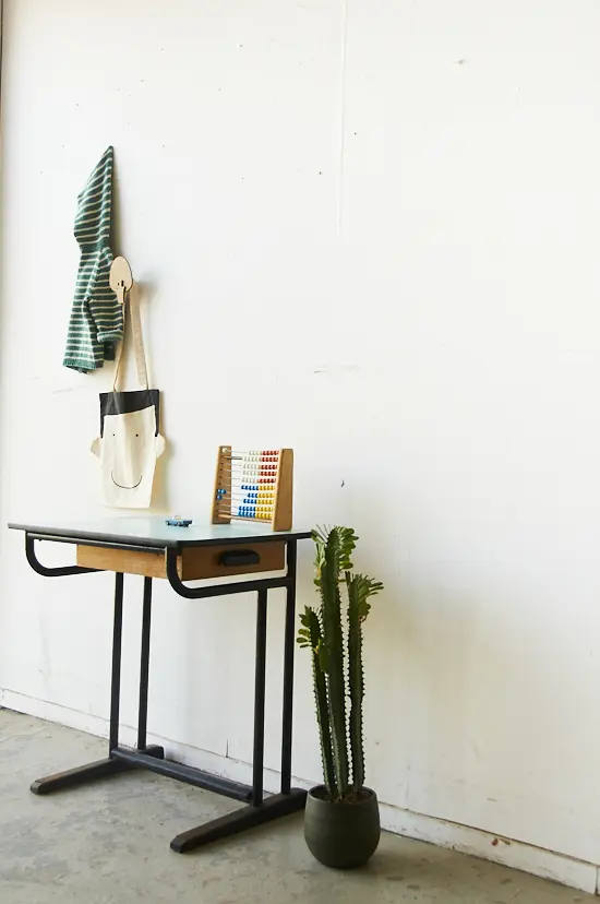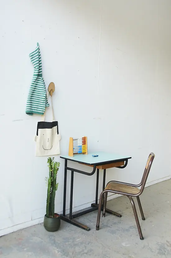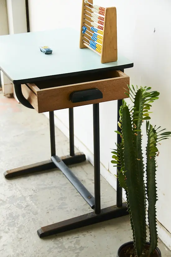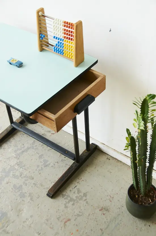 Deze vintage schooltafel komt uit Frankrijk. Het tafeltje heeft een mintblauw formicablad en een houten laatje. Ideaal voor een peuter om lekker aan te tekenen. Omdat we in één klap veel schooltafels hebben kunnen inkopen, kunnen we ze nu aanbieden voor een scherpere prijs!