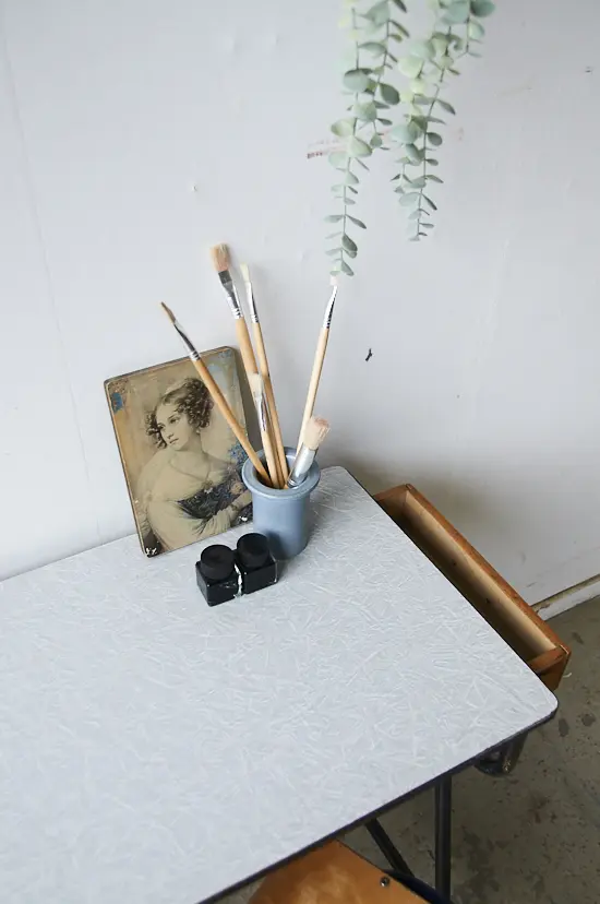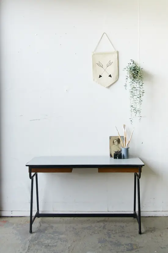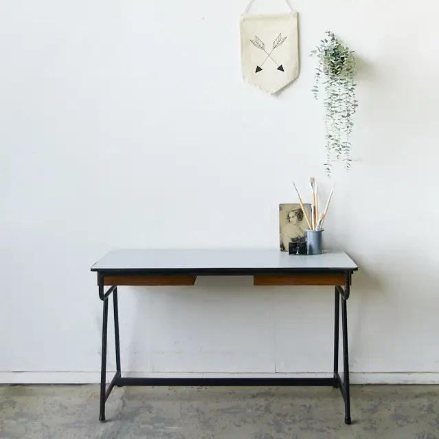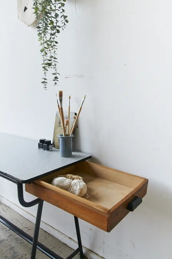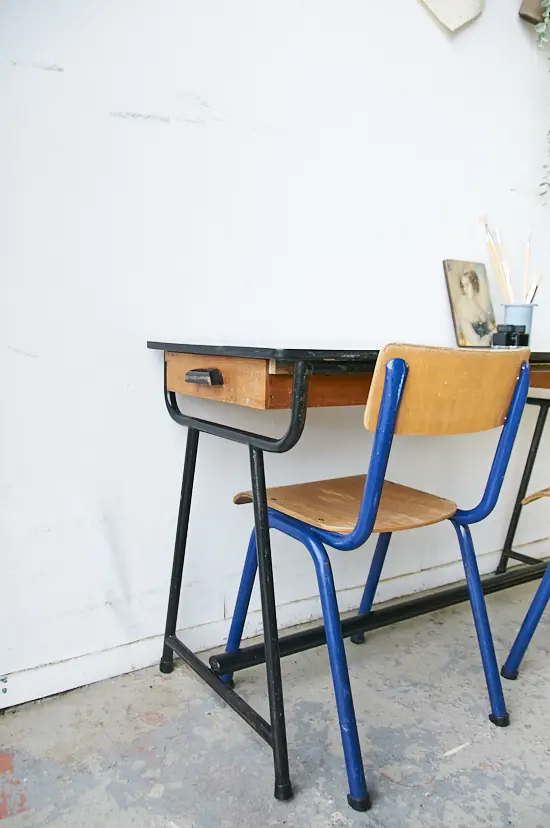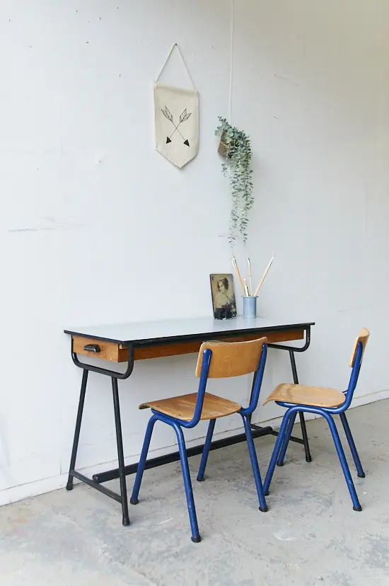 Een heel leuk schooltafeltje uit België met 2 zij laatjes. Heel fijn om bijvoorbeeld alle potloden in op te bergen. De tafel hebben wij goed schoongemaakt en nagelopen en is nu weer helemaal klaar voor een nieuw plekje! De prijs is exclusief stoeltjes.
