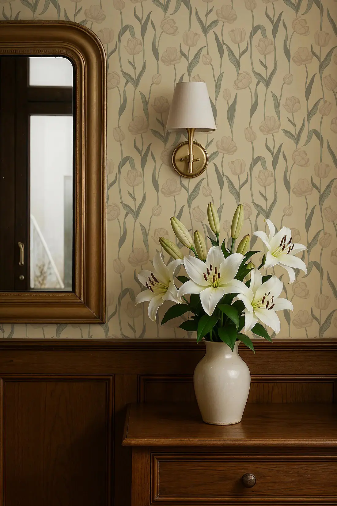 Met het behang Fjädra van Summer Gray haal je de vrolijke tulpenvelden van Amsterdam gewoon in huis! Op het behang staan lieve lentebloemen in zachte, rustige kleuren. Zo maak je van je kamer een fijne, rustige plek waar je lekker kunt spelen, lezen of dromen. Geinspireerd na een bezoek aan de Keukenhof tekende de Nederlandse ontwerper Simone Top deze print.