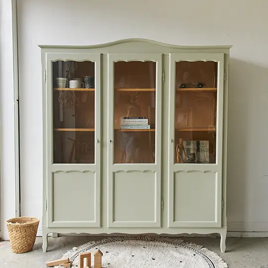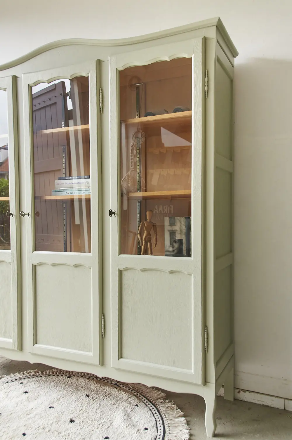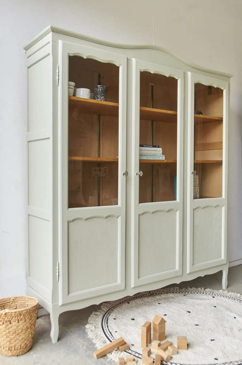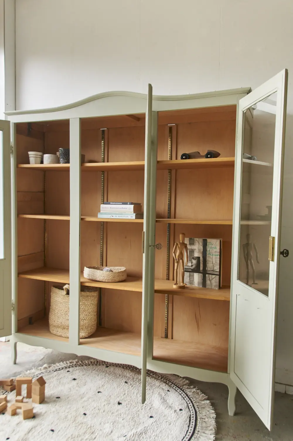 Een prachtige sierlijke vitrinekast. Wat een leukerd! We vinden het formaat heel leuk, niet zo bombastisch, maar wel drie hele stevige legplanken waar van alles op kan. De planken zijn origineel en in hoogte verstelbaar. We hebben deze kast grondig schoongemaakt en behandeld tegen houtworm. Na de nodige reparaties kreeg hij van ons de kleur Voorjaar. Wat staat het hem goed! Voorjaar is zo’n fijne, frisse en zachte groene kleur! Hij heeft niet voor niets deze naam gekregen, elk meubel fleurt helemaal op door deze lichtgroene kleur. Super goed te combineren met andere kleuren, we zien hem al helemaal staan in een toffe woonkeuken. De deuren sluiten allemaal door middel van de sleutels. Hij is klaar voor gebruik!