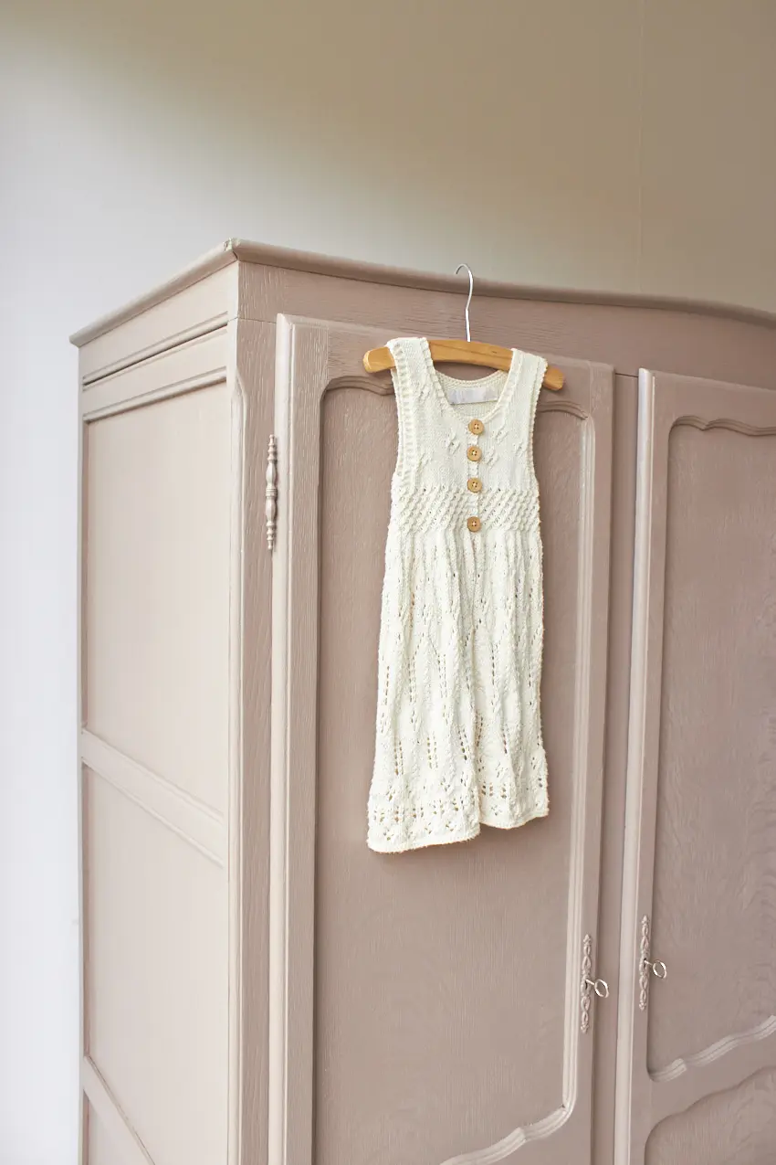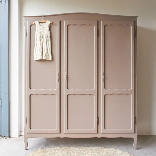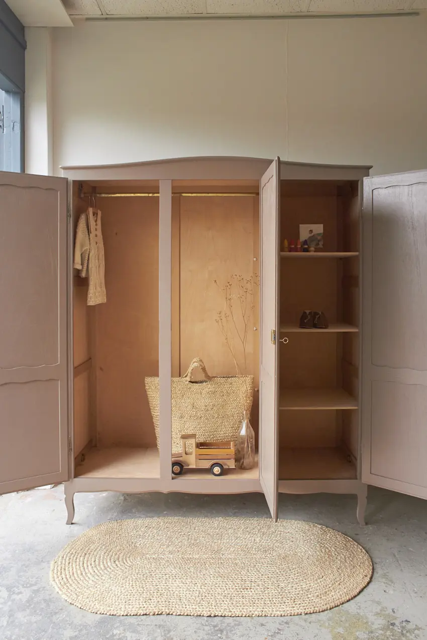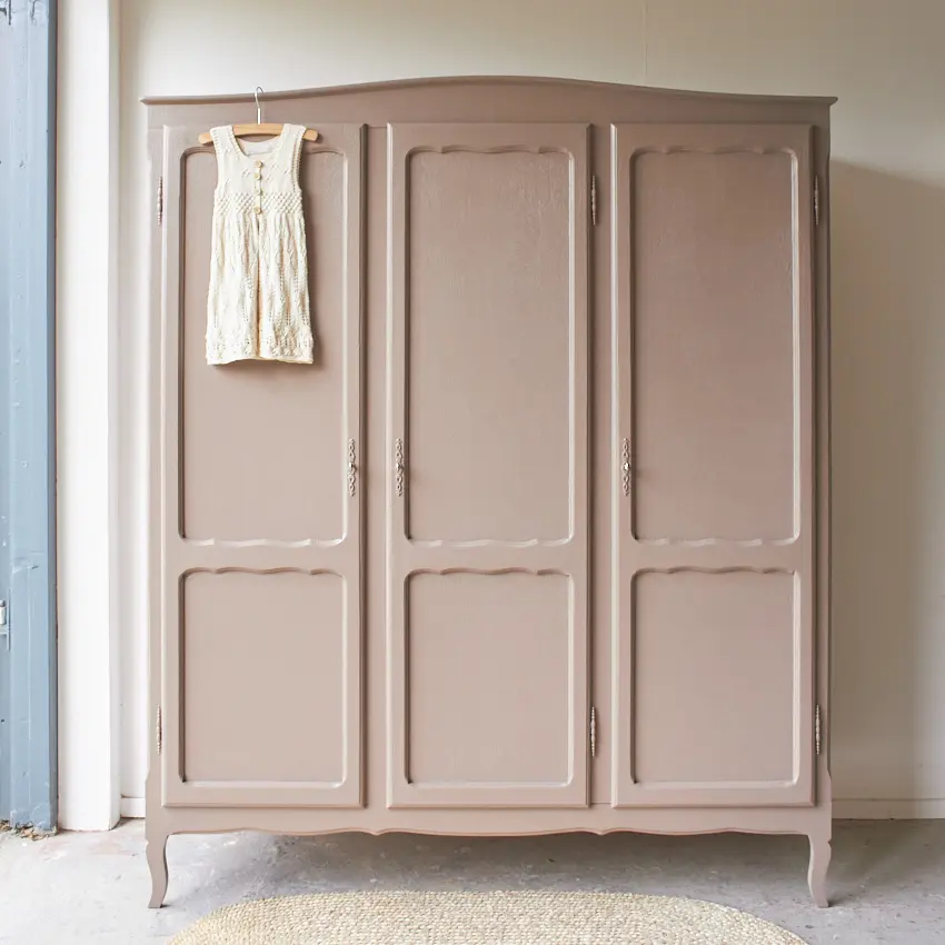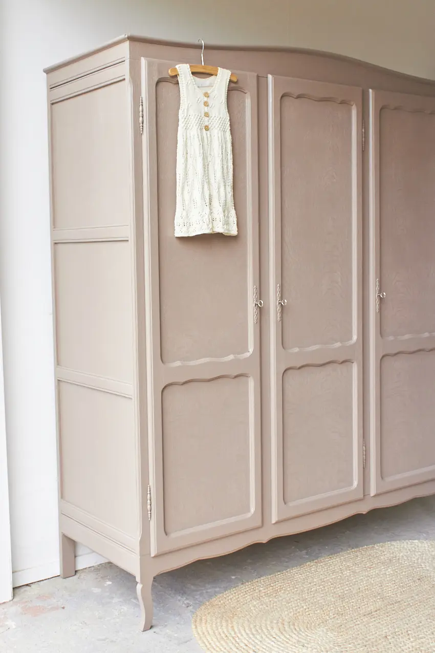 We hebben weer een sierlijke kast opgeknapt! Zulke sierlijke kasten hebben we wel vaker, wat zijn het toch fijne meubels voor in huis. Demontabel, dus gemakkelijk naar boven te tillen via de trap, een fijn formaat en genoeg opbergruimte. De sierlijke kasten die wij binnen krijgen zijn allemaal net even anders. Deze heeft mooie sierlijke pootjes en drie paneeldeuren. En wat zijn de sierlijke sleutelplaatjes mooi! Toen deze kast binnen kwam hebben we eerst alle onderdelen laten zandstralen, goed schoongemaakt en behandeld met een anti-houtworm spray. Tijdens het in elkaar zetten van de kast hebben we de nodige reparaties gedaan. Op de originele roede na, die links boveninin de kast zit, zat er geen indeling meer bij. Daarom hebben we rechts drie nieuwe planken geplaatst. Nu is er weer genoeg opbergruimte voor stapeltjes kleding en om kleding op te hangen. We kunnen eventueel tegen een kleine meerprijs links een extra plank plaatsen. De originele sleutels zijn nog aanwezig, waardoor alle drie de deuren sluiten met een sleutel. Uiteindelijk hebben we deze kast twee lagen van onze kleur Hazel gegeven, een mooie mix van roze en beige. Een fijne, zachte kleur die goed tot zijn recht komt op deze mooie kast. Nu is het de ideale kast voor op een meisjeskamer, wat is hij mooi geworden! Klik HIER voor het prachtige kleed.