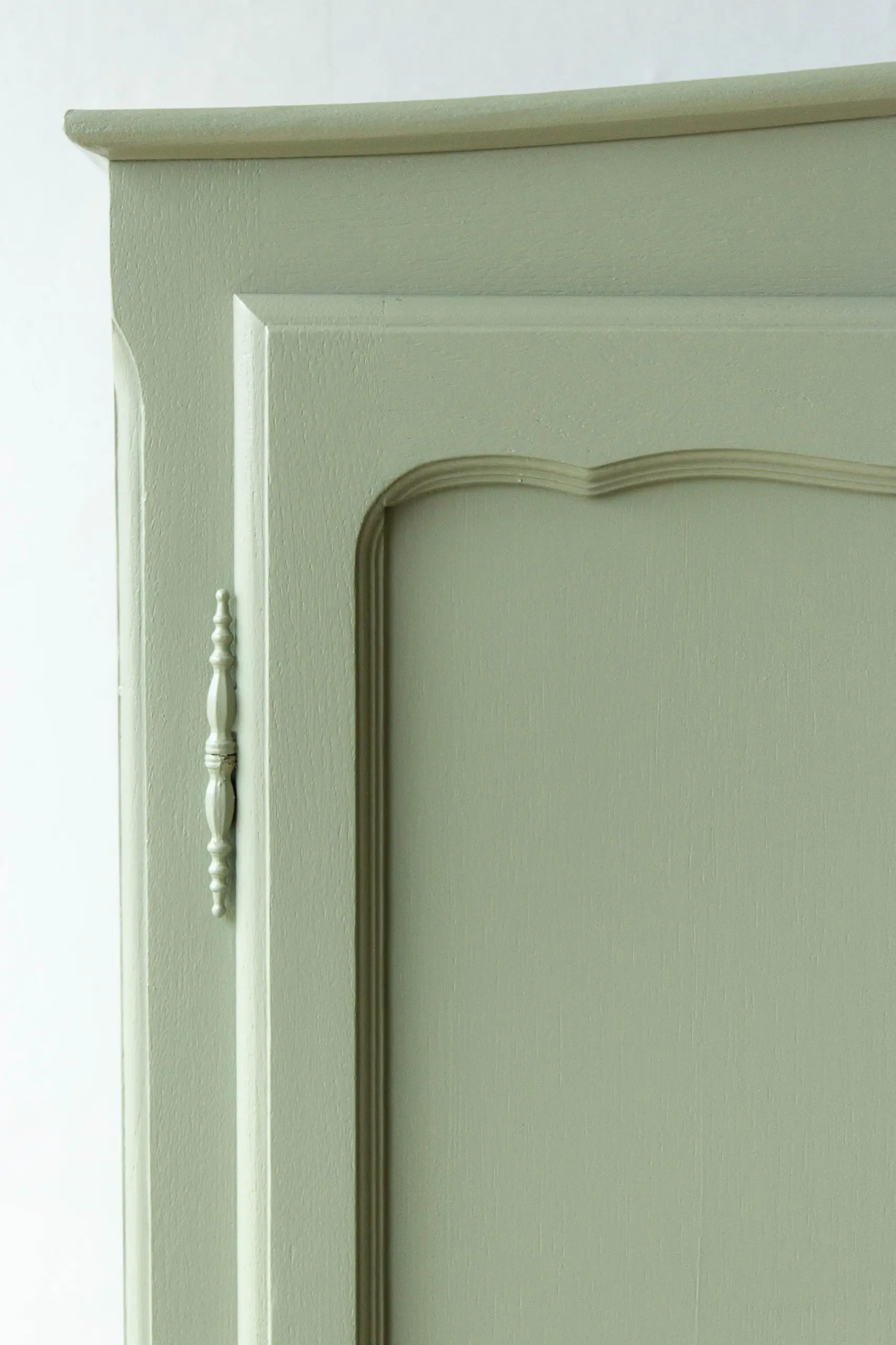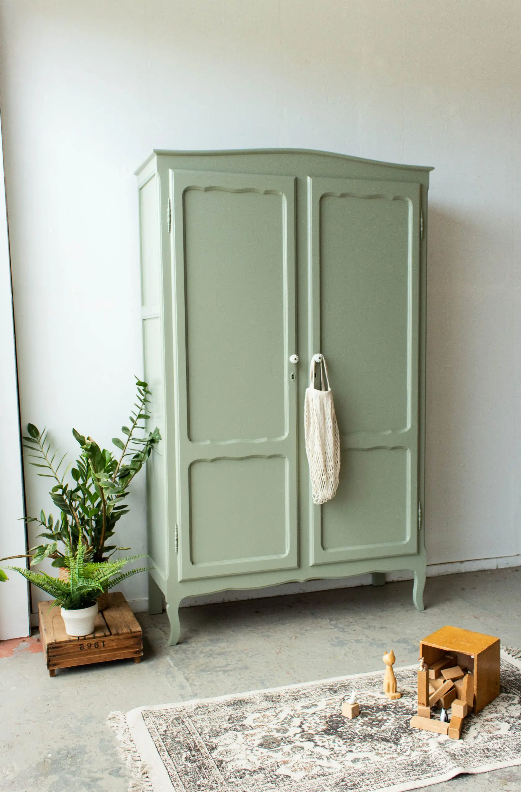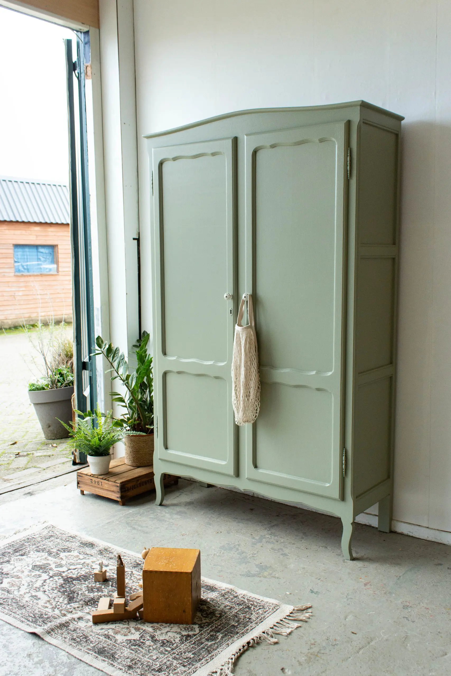 Wat een prachtige, sierlijke kast is dit! Hij komt uit Frankrijk, en is daar jarenlang als servieskast gebruikt. Toen zat er nog (geel) glas bovenin de de deuren. Dit hebben we in onze werkplaats vervangen door hout, want wij wilden er een kledingkast van maken. Daarna is hij volledig nagelopen en goed schoongemaakt. We hebben hem vervolgens in deze grijsgroene ‘artisjok’ kleur geschilderd. Op de deuren zitten nu sierlijke knopjes van porselein. De originele planken waren nog helemaal goed, dus die hebben we erin gelaten. Deze zijn in hoogte verstelbaar. En zo is deze mooie kledingkast weer helemaal klaar voor gebruik!