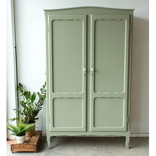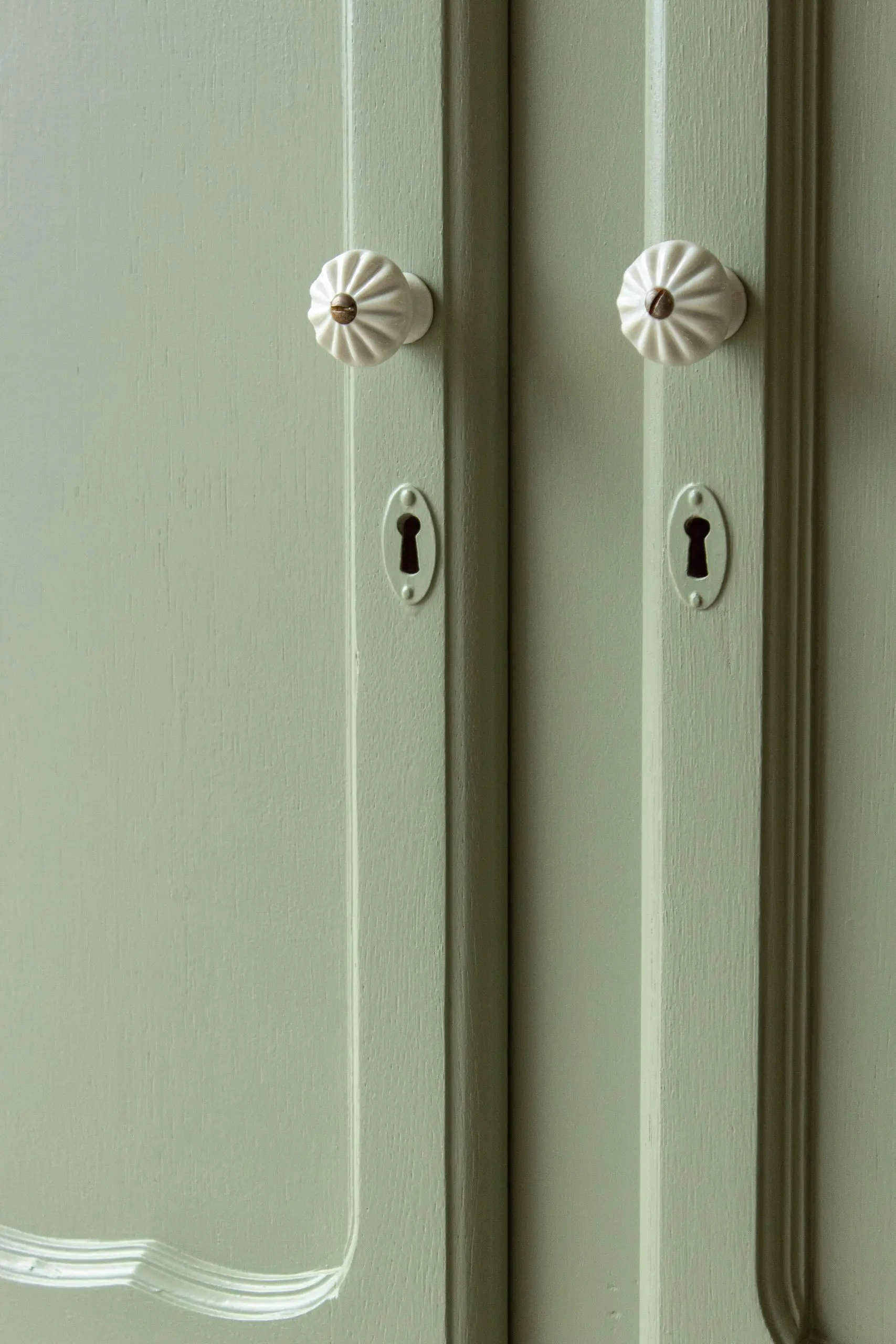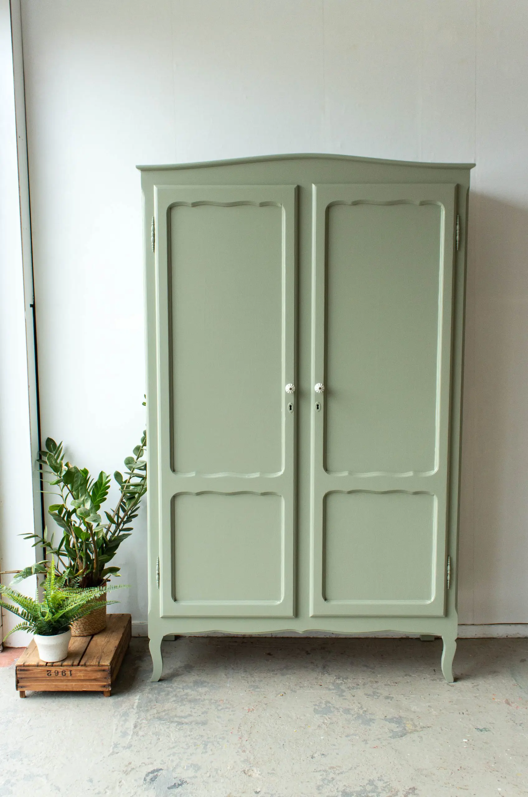 Wat een prachtige, sierlijke kast is dit! Hij komt uit Frankrijk, en is daar jarenlang als servieskast gebruikt. Toen zat er nog (geel) glas bovenin de de deuren. Dit hebben we in onze werkplaats vervangen door hout, want wij wilden er een kledingkast van maken. Daarna is hij volledig nagelopen en goed schoongemaakt. We hebben hem vervolgens in deze grijsgroene ‘artisjok’ kleur geschilderd. Op de deuren zitten nu sierlijke knopjes van porselein. De originele planken waren nog helemaal goed, dus die hebben we erin gelaten. Deze zijn in hoogte verstelbaar. En zo is deze mooie kledingkast weer helemaal klaar voor gebruik!