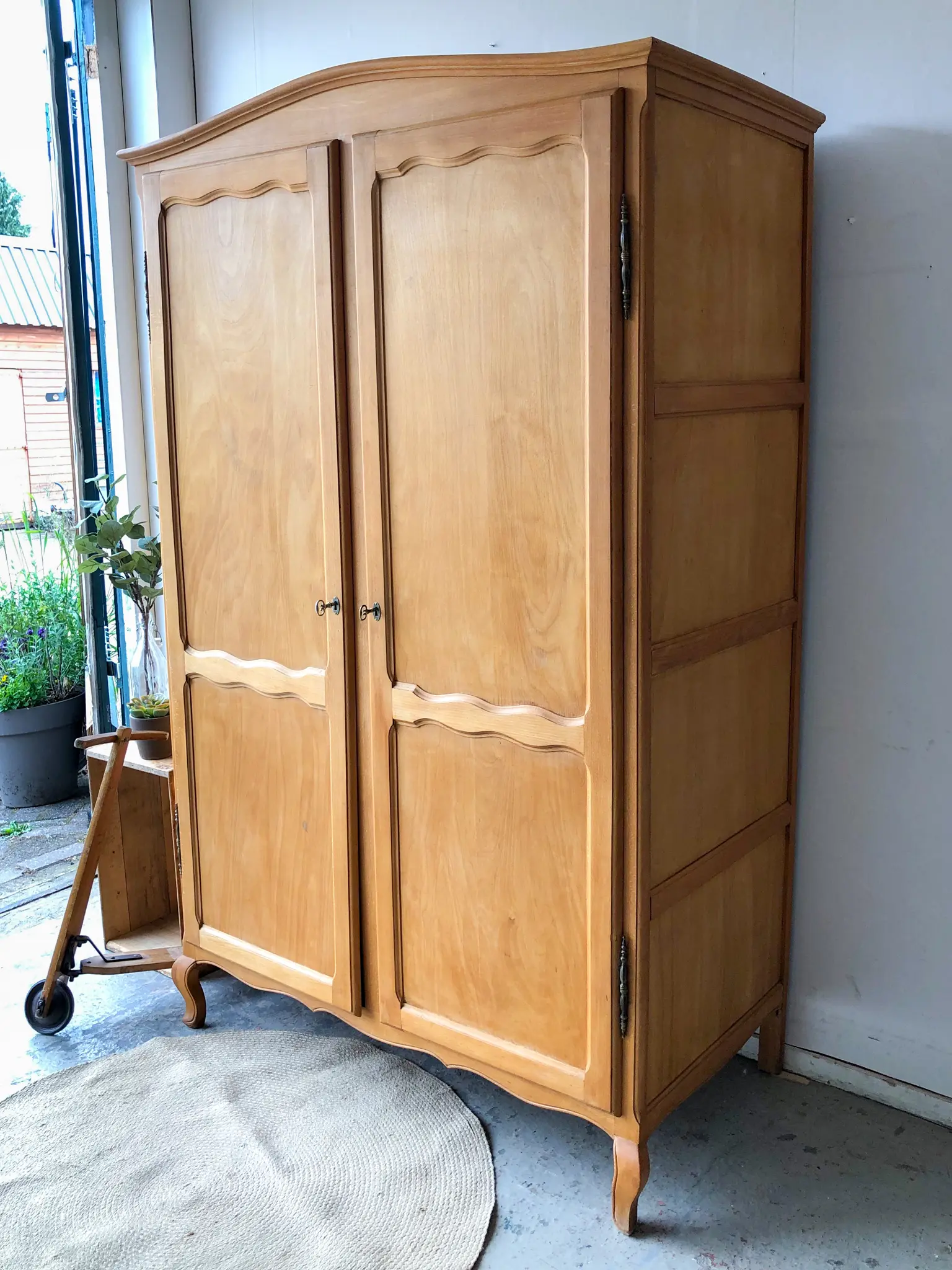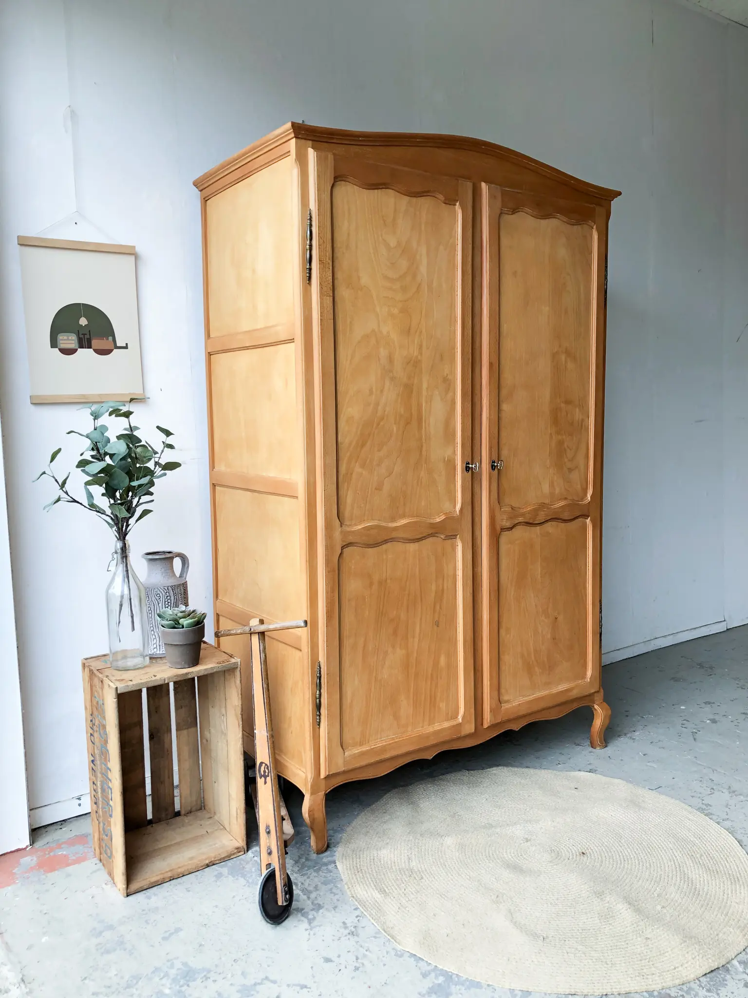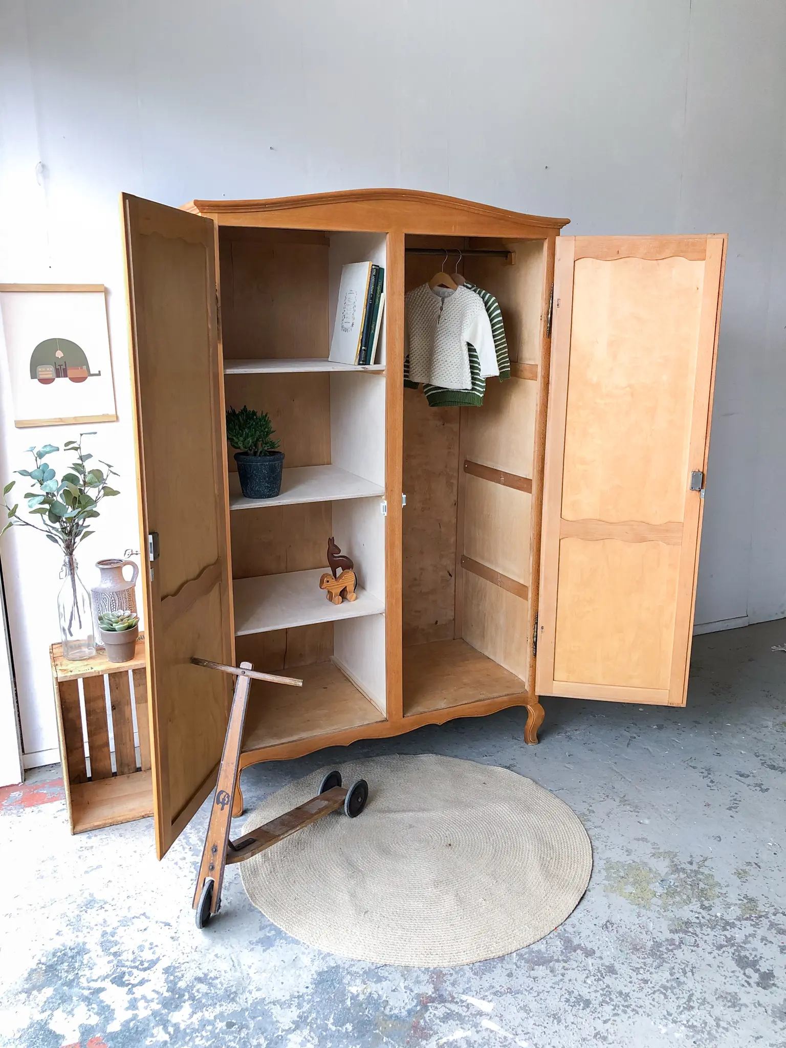 Dit soort kasten komen we in verschillende vormen en maten tegen. Het zijn ideale kasten voor op de kinderkamer. Deze had zo’n mooie houtkleur, dat we het eigenlijk zonde vonden hem te schilderen. Dus besloten we hem zo te laten! Na de grondige schoonmaakbeurt heeft hij een behandeling gehad tegen houtworm. Vervolgens hebben we hem een nieuwe indeling gegeven. Een tussenschot in het midden, drie planken achter de linker deur (berken multiplex) en een roede rechts. De kast is diep genoeg voor ook de wat grotere hangers. We hebben hem behandeld met een voedende olie en hij heeft twee nieuwe sleutelplaatjes. De sleutels werken niet optimaal, vandaar dat beide deurtjes sluiten met een magneetje. Et voilà, klaar is kees!