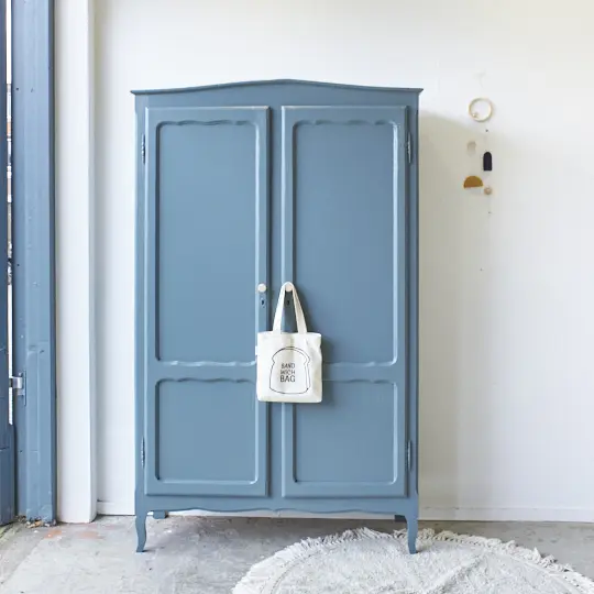 Sierlijke kasten zoals deze hebben we wel vaker en zijn fijne kasten voor in huis. Ze zijn altijd nét even anders. Wat een leuke speelse pootjes en paneeldeuren met sierlijke randen heeft deze! Toen deze kast binnenkwam zaten er ruitjes in. Deze ruitjes waren in slechte staat en ze pastte niet helemaal goed bij de rest van de kast. Daarom hebben we ze eruit gehaald en vervangen voor houten panelen. We hebben alle oude verflagen er af laten zandstralen en vervolgens de kast goed schoongemaakt en behandeld met aan anti-houtworm spray. We behandelen al onze meubels met deze spray, mocht er ooit houtworm in hebben gezeten dan weten we zeker dat deze niet meer leeft. Wel zo’n fijn idee! Toen de nodige reparaties waren gedaan hebben we een nieuwe indeling gemaakt. Drie stevige planken met genoeg ruimte voor boeken, spelletjes of stapeltjes kleding. Door zijn fijne formaat kan deze kast eigenlijk overal wel staan. In de woonkamer voor boeken en spelletjes, in de hal voor linnengoed of in de baby- of kinderkamer voor kleding. Op de drie planken is er genoeg opbergruimte! Beide deuren sluiten met een magneetje. We hebben hem uiteindelijk geschilderd in onze kleur Klif, een mystieke warme blauw met een vleugje groen. Een kleur die al lang in ons Firma Zoethout kleuren assortiment zit. Op deze kast kun je zien waarom, Klif geeft ook deze kast meteen karakter, wat een fijne kleur! De houten knoppen maken hem helemaal af.