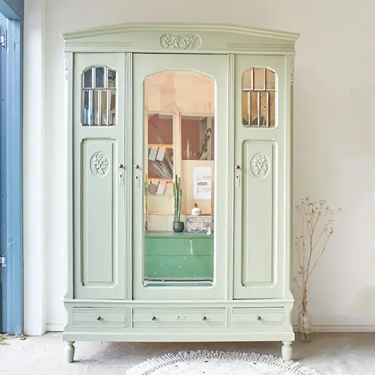 We hebben weer een nieuwe spiegelkast, zo fijn! En wat een mooie bijzondere spiegels op de buitenste deuren, geplaatst in lood. Een fijne kast voor op de kinderkamer met mooie details, zoals het houtsnijwerk en de leuke pootjes. Alle drie de deuren kunnen open, dus je kunt overal gemakkelijk bij. Bij veel soortgelijke spiegelkasten is de rechterdeur een vast paneel, maar bij deze dus niet. Heel handig! Alle oude verflagen zijn eraf gehaald door middel van zandstralen, daarna hebben we de kast goed schoongemaakt en behandeld tegen houtworm. Na de nodige reparaties hebben we achter de linkerdeur 3 nieuwe planken geplaatst. En aan de rechterkant een nieuwe plank over de gehele breedte met daaronder de originele roede. Samen met de 3 lades is er genoeg plek voor kleding, schoenen, speelgoed en andere spullen. Alle deuren sluiten met magneetjes en bronzen knoppen. We hebben deze kast geschilderd in onze kleur Artisjok, een perfecte kleur voor op de baby- of kinderkamer. Zacht, toegankelijk, maar niet te saai! Deze subtiele groene pastel tint combineert goed met andere natuurlijke zachte kleuren. En nu is deze spiegelkast helemaal klaar voor een nieuwe plek in de kinderkamer.