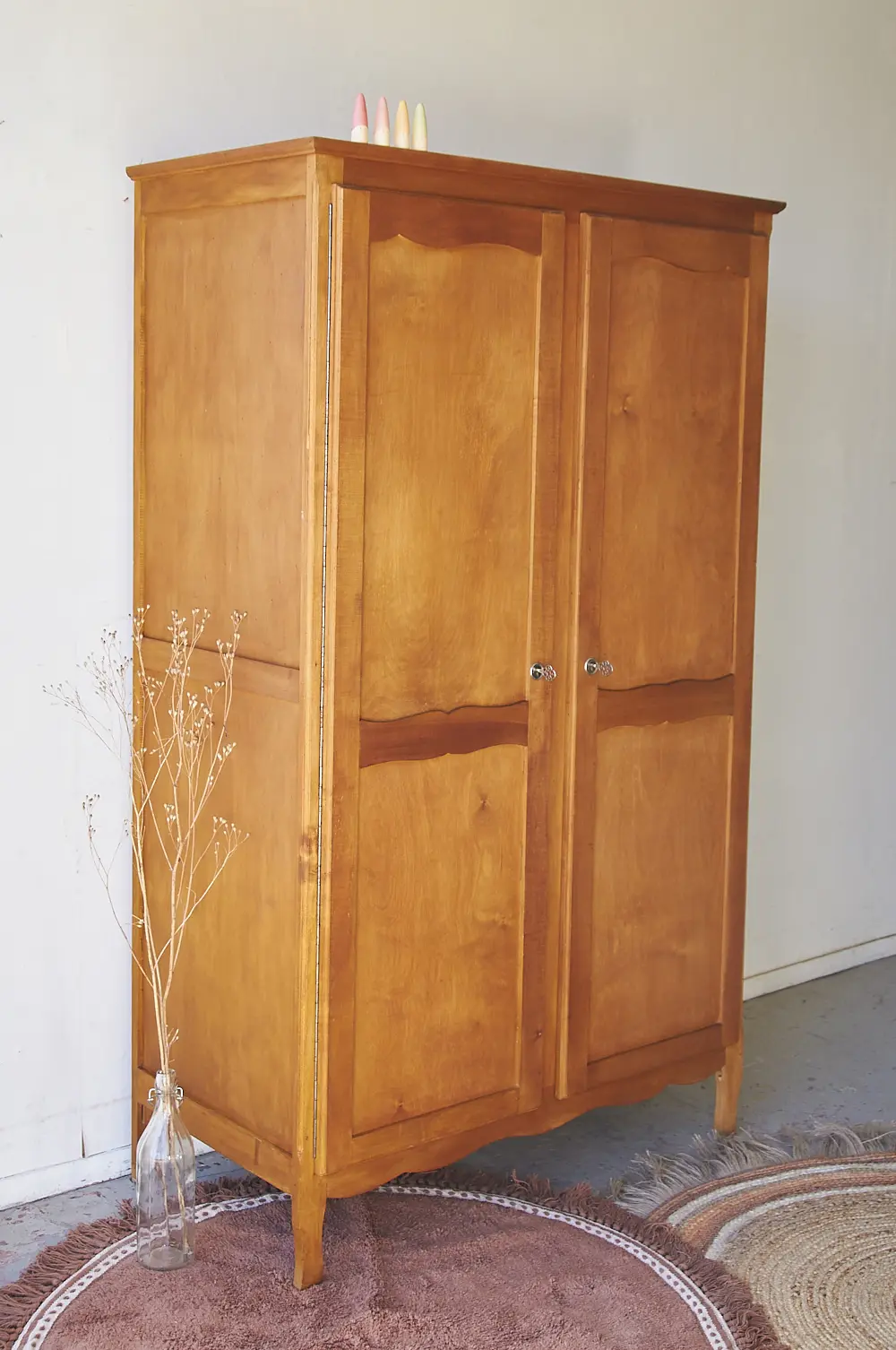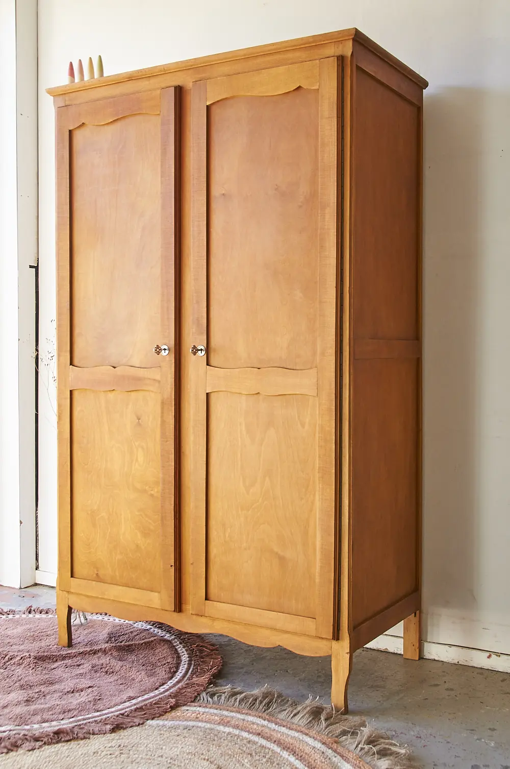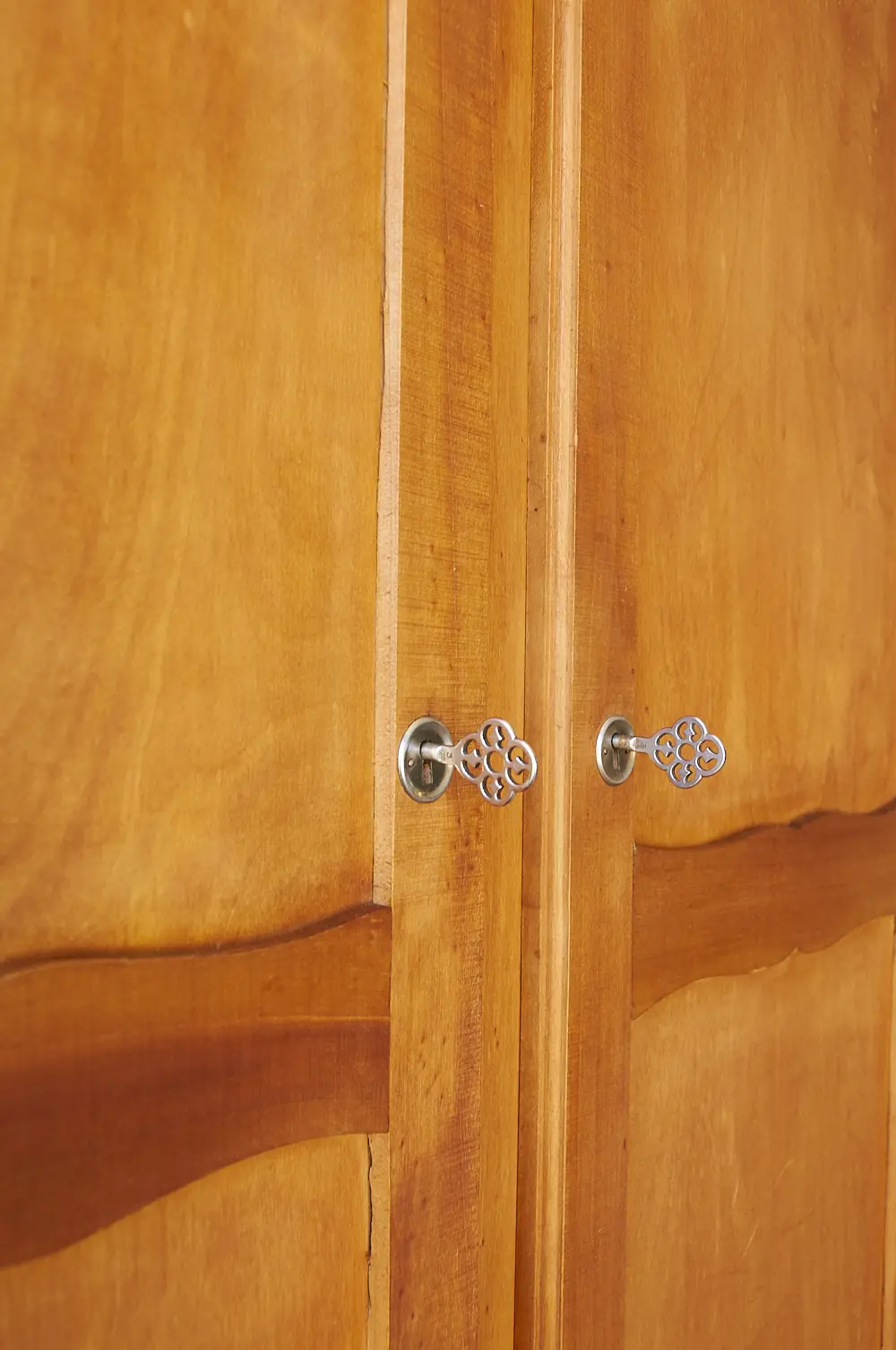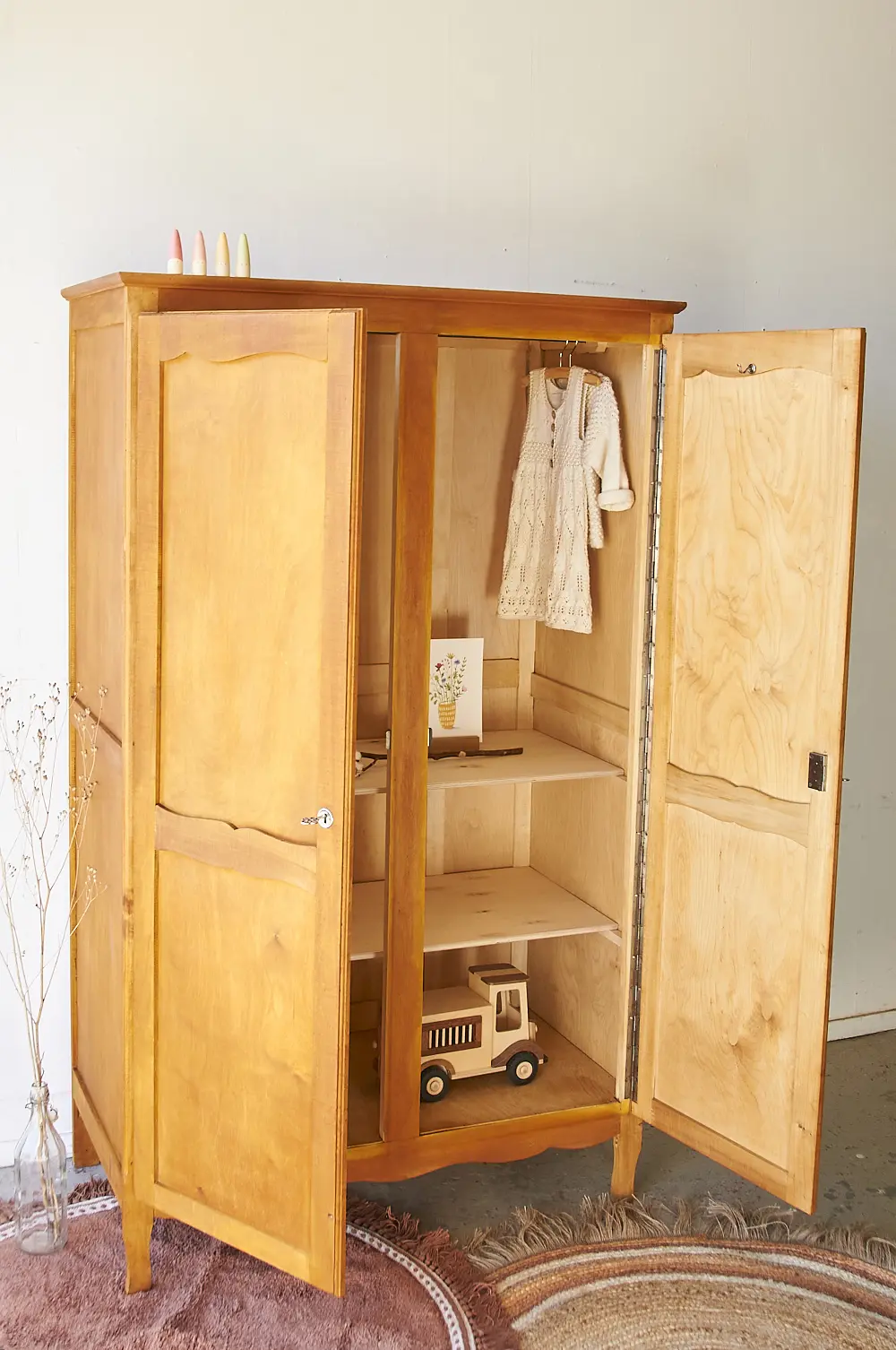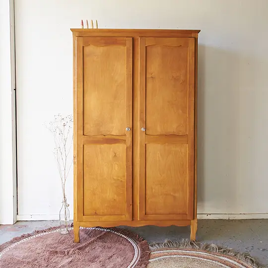 Deze kast is een van onze favorieten, zo leuk! Helemaal zo in zijn houtkleur. Vaak komen dit soort kasten met sleutelplaatjes die net iets te kitsch zijn voor ons, of het is de houtkleur die niet mooi is waardoor we besluiten de kast toch te schilderen. Maar deze is zo leuk zoals hij is! De sleutelplaatjes zijn stoer, een fijne combinatie met de sierlijke aspecten van de kast zelf. We werden er helemaal blij van. De kast had alleen een roede over de hele breedte, dus hebben we er twee extra planken in gemaakt. Ook hebben we aan de binnenkant van beide deuren een haakje gemonteerd, super handig om de gedragen kleren aan op te hangen! De deuren sluiten perfect met de sleutels. De kast hebben we grondig schoongemaakt en hij is behandeld tegen houtworm. Uiteindelijk hebben we hem behandeld met een voedende meubelolie, en nu is hij weer klaar voor een nieuwe plek!
