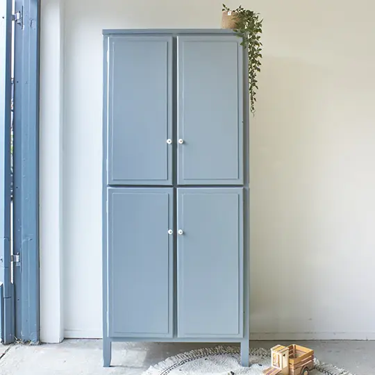 Wat een leukerd, deze kast met vier deurtjes! Deze kast heeft er al een lang leven op zitten, dat zagen we aan alles. Hij had daarom ook flink wat aandacht en liefde nodig. Annelies heeft hem flink onder handen genomen. We hebben hem eerst laten zandstralen, daarna goed schoongemaakt en behandeld tegen houtworm. De achterkant is helemaal vervangen en ook hebben we een nieuw dakje erin gezet, met een nieuwe sierrand. De pootjes zijn aangepast waardoor de kast weer netjes recht staat. Het hout van de deurtjes was behoorlijk krom, nu hangen ze weer een stuk rechter. Het blijft een oude kast dus de deurtjes hebben nog wel wat kieren. Alle vier de deuren hebben we daarom 2 magneetjes gegeven, zodat ze goed sluiten. De indeling was niet helemaal meer compleet. Daarom hebben we twee nieuwe planken geplaatst en links bovenin een roede. Genoeg plek om kleding op te hangen en neer te leggen! Na de grondverf laag hebben we gekozen voor onze kleur Bron, in combinatie met porseleinen knoppen op alle deuren. Nu is het de perfecte kast voor op de kinderkamer!