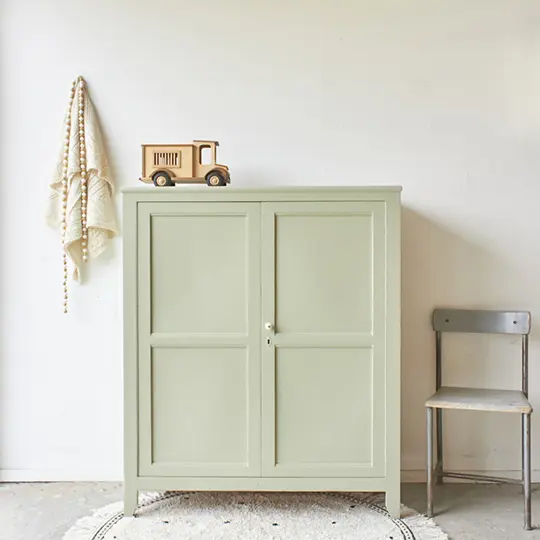 Deze kast kan overal in het huis staan, in de kinderkamer als kledingkast, in de woonkamer als speelgoedkastje of in de hal voor tassen en schoenen! Ideaal! Een heel fijn formaatje in een strakke stijl, een kast die overal past. Ook leuk om het kastje als dressoir te gebruiken met een lampje erop en bijvoorbeeld mooie vazen en boekjes. Deze kast hebben wij nadat hij terug kwam van de stralers, goed schoongemaakt en behandeld tegen houtworm. De kast en de indeling zagen er nog goed uit, dus na de flinke poetsbeurt hebben we de originele planken kunnen behouden. Wij hebben iets van de pootjes afgehaald waardoor hij nu weer stevig staat. Na de grondverf besloten wij hem in deze mooie groene kleur Artisjok te schilderen. Het is echt een perfecte kleur voor op de baby- of kinderkamer. Zacht, toegankelijk, maar niet te saai! Deze subtiele groene pastel tint combineert goed met andere natuurlijke zachte kleuren. Wij vinden Artisjok ook prachtig in combinatie met onze kleur Rozemarijn. Net wat stoerder als ze samen in een ruimte staan, twee kleuren die elkaar versterken! Het linker deurtje sluit met een schuifje, het rechter deurtje sluit met een magneetje. De kast hebben wij afgewerkt met een porseleinen knopje en nu is deze kast weer helemaal klaar voor gebruik! Perfect voor al het speelgoed. Die mooie houten auto en het fijne stippenkleed is ook bij ons te koop. Klik HIER voor onze kinderkamer decoratie.