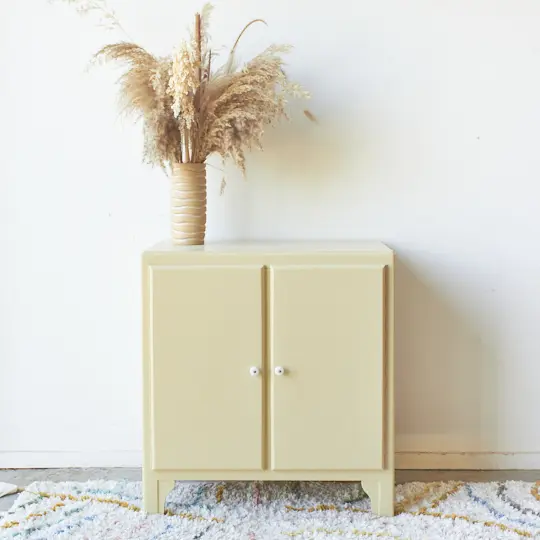 Wat een lief kastje! Dit kastje is perfect voor in huis en is fijn als je net wat meer opbergruimte nodig hebt. Door zijn kleine formaat kan hij overal wel staan. In de woonkamer voor boeken, in de baby- of kinderkamer vol met speelgoed of in de hal voor schoenen en handschoenen. Bovenop is er ook nog plek voor een mooi vaasje of mooie plant. Toen dit kastje binnenkwam hebben we hem goed schoongemaakt en gerepareerd waar nodig. Daarna hebben we hem goed opgeschuurd. Na een goede grondlaag hebben we hem geschilderd in onze kleur Kamille. Kamille is een van onze nieuwste kleuren en wat zijn we toch blij met deze kleur! Ook op dit kastje staat hij zo mooi. Het is een lichtgele tint met een vleugje grijs en groen. Met twee nieuwe porseleinen knoppen op de deurtjes is hij weer klaar voor gebruik.