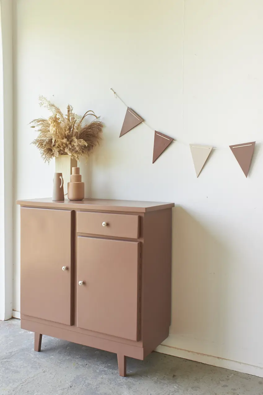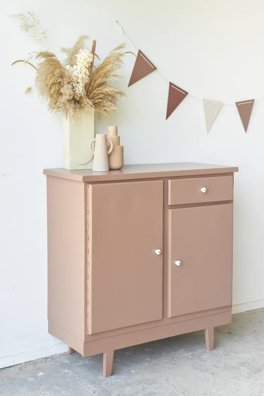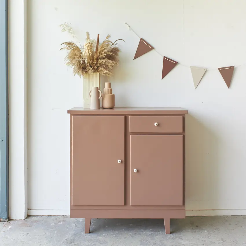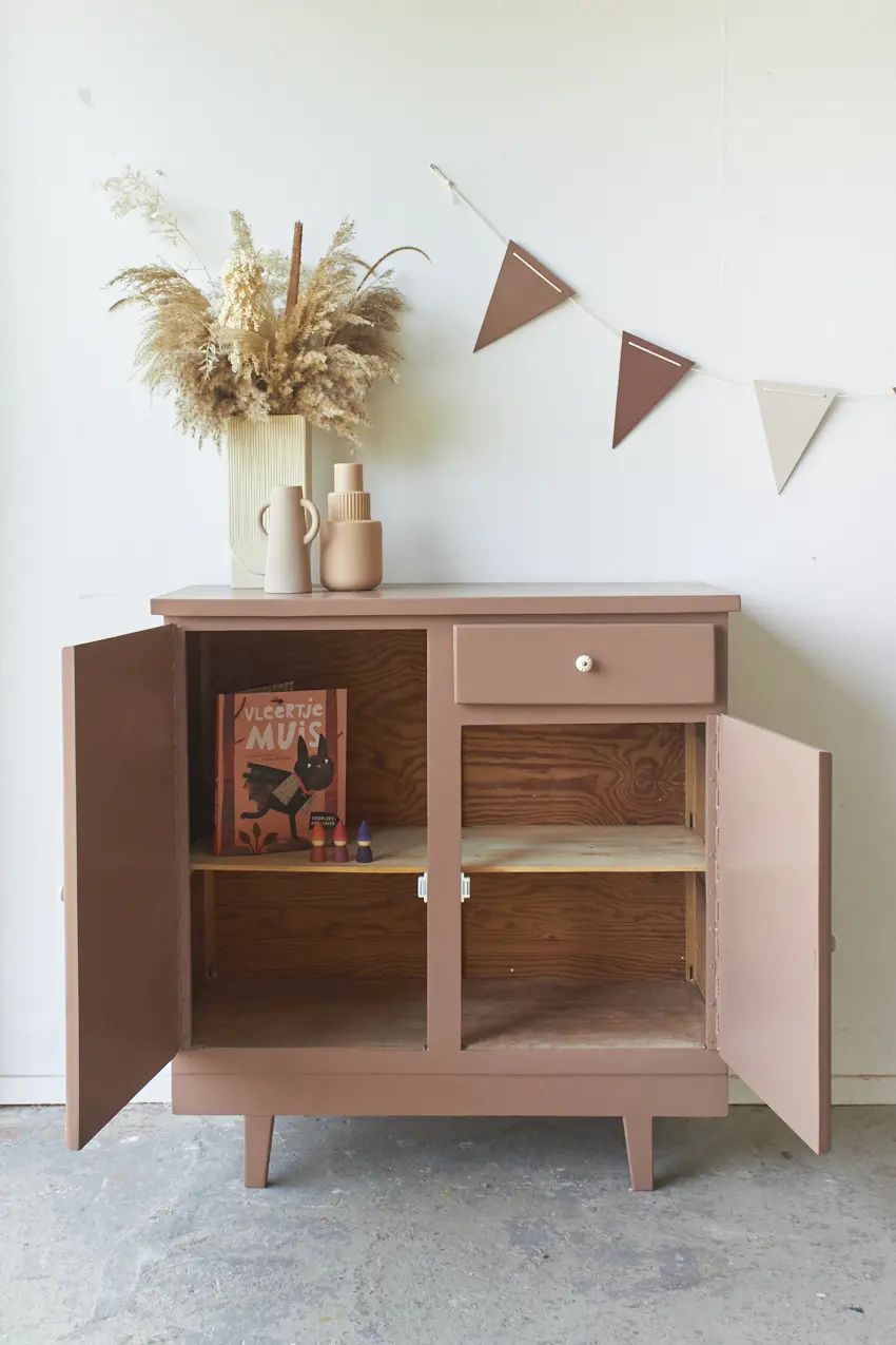 Een fijn klein kastje in onze kleur Vijg, een ideaal kastje voor in huis! Dit leuke kastje kan door zijn kleine formaat eigenlijk overal wel staan. In de baby- of kinderkamer met speelgoed, in de keuken met kookboeken of in de hal met schoenen en laarsjes. Uniek aan dit kastje zijn de poten, die hebben wij er nieuw onder gemaakt. Dit geeft speelsheid en ook meteen de stevigheid. We hebben dit kastje eerst kaal gemaakt, daarna hebben we hem goed schoongemaakt en behandeld tegen houtworm. De deurtjes sluiten met een magneetje. De planken waren erg ruw. Wij hebben ze weer gladgeschuurd, zodat de planken weer fijn glad zijn. Uiteindelijk hebben we hem in onze kleur Vijg geschilderd, een oud roze met een warme ondertoon. Vijg is een krachtige kleur, maar niet te schreeuwerig. Deze kleur geeft veel warmte aan een meubel. Nu is dit kastje weer klaar voor een nieuwe plek in huis.