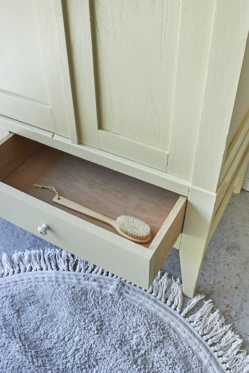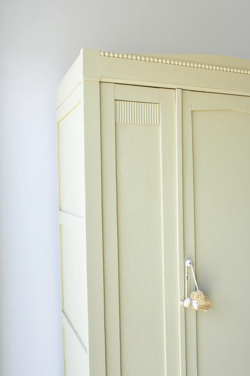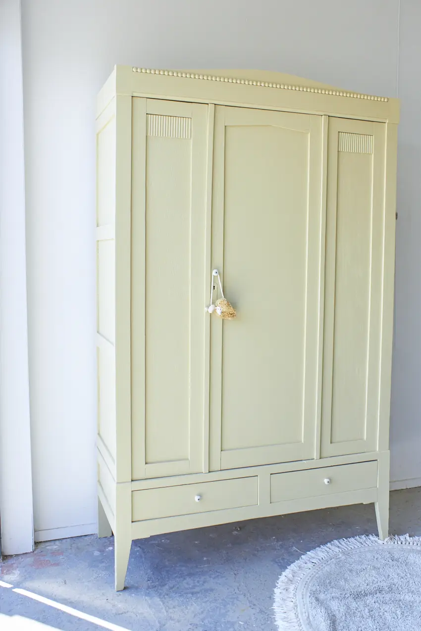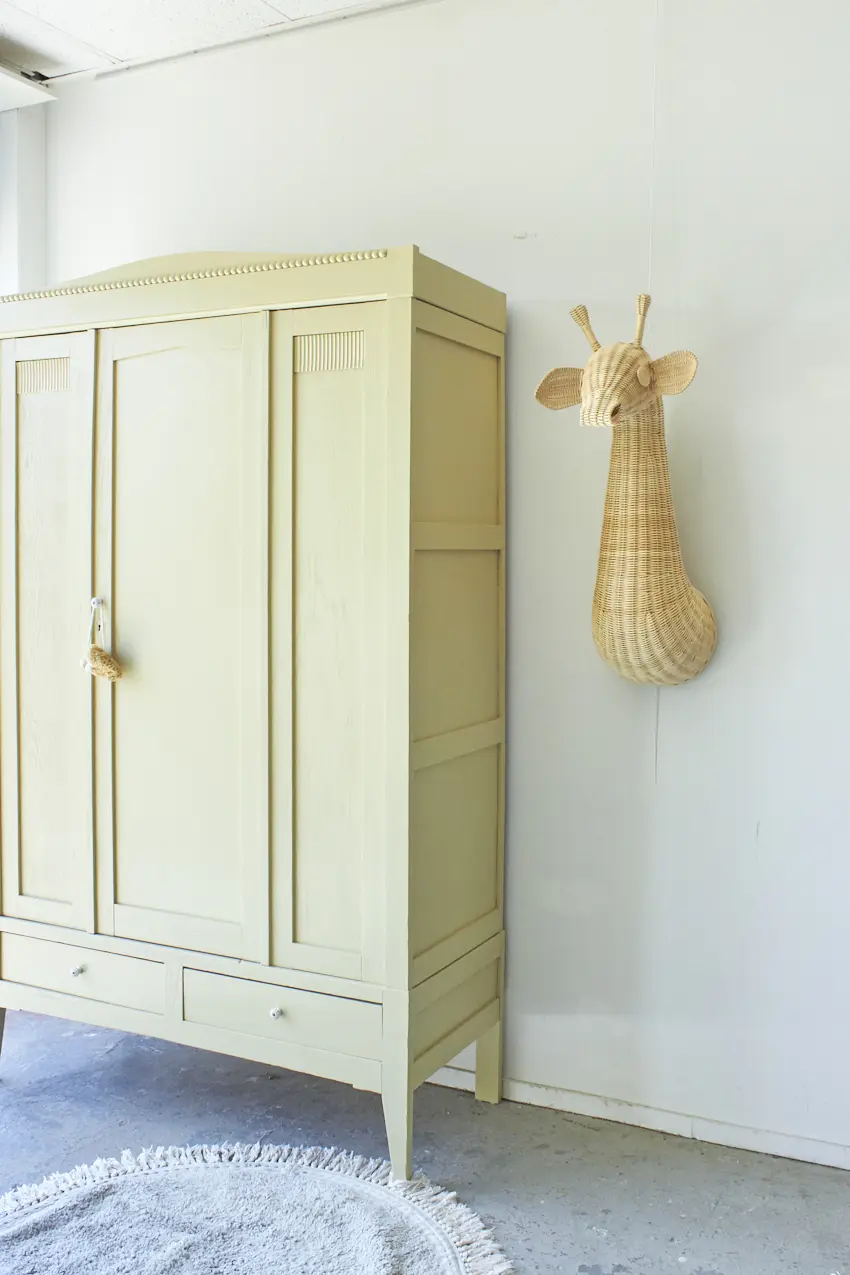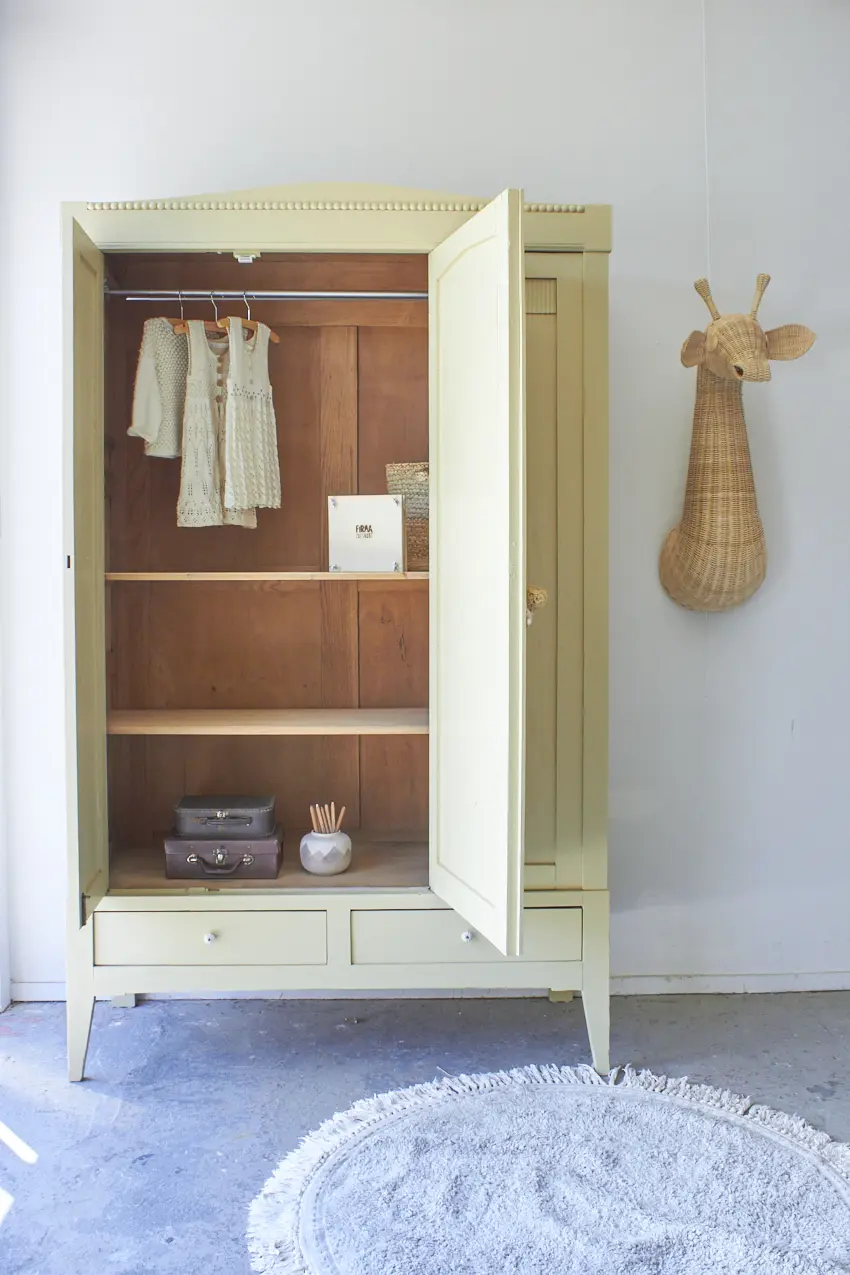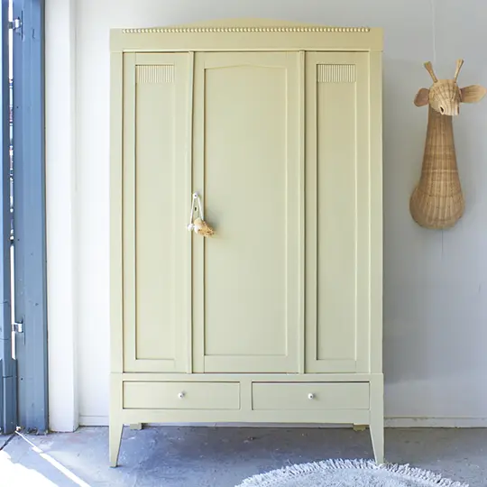 Wauw, wat een mooie nieuwe strakke kast! Deze kast heeft subtiel houtsnijwerk, zoals de bolletjes op de kroon. En wat een leuke speelse schuine pootjes. Deze kast is demontabel en kan helemaal uit elkaar gehaald worden. Heel fijn als de kast naar boven moet, je tilt hem zo gemakkelijk naar boven toe. Toen deze kast binnen kwam hebben we eerst de spiegel eruit gehaald. Alle onderdelen hebben we laten zandstralen, alle oude beits- en verflagen zijn hierdoor verwijderd. Daarna hebben we hem grondig schoongemaakt, van binnen en buiten en is heel de kast behandeld met een anti-houtworm spray. De indeling is origineel, bovenin zit een roede over de gehele breedte en er zitten 2 stevige planken in. De indeling was nog in goede staat, de planken hebben we goed opgeschuurd en terug kunnen plaatsen. Er zitten meerdere plankendragers in de kast, waardoor de planken versteld kunnen worden in hoogte. Heel handig! De spiegel hebben we eruit gelaten, in plaats daarvan hebben we een houten paneel geplaatst. Links en in het midden zit een deur, rechts een vast paneel. Op de linkerdeur hebben we een schuifje geplaatst en de rechterdeur sluit met een magneetje. We hebben deze kast in onze kleur Kamille geschilderd. Kamille is onze nieuwe toevoeging aan ons Firma Zoethout assortiment. En wat zijn we blij met deze kleur! Het is een lichtgele tint met een vleugje grijs en groen. Een kleur die prachtig staat op zowel een commode als een grote kast. De porseleinen knoppen op de lade en de rechterdeur zijn een fijne combinatie. Wat een fijne lichte uitstraling heeft deze kast gekregen. Hij is weer helemaal klaar voor een mooie plek in huis.