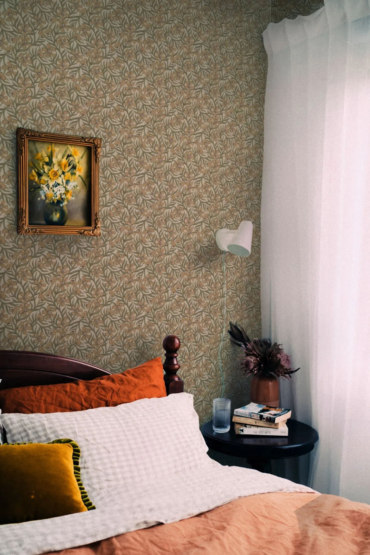 De zachte, groene tinten in dit behang passen perfect bij een vintage meubel in verschillende groentinten. Zoals het warme Rozemarijn en het frisse Voorjaar en Artisjok. Maar ook Linnen of Roest passen er mooi bij.