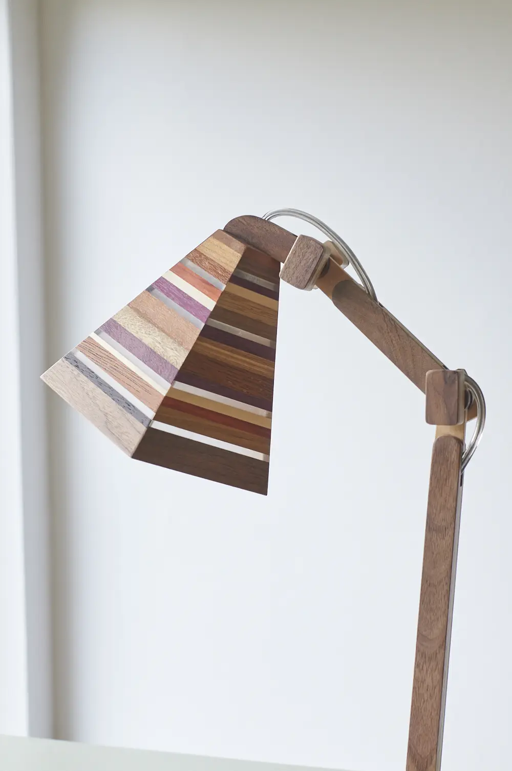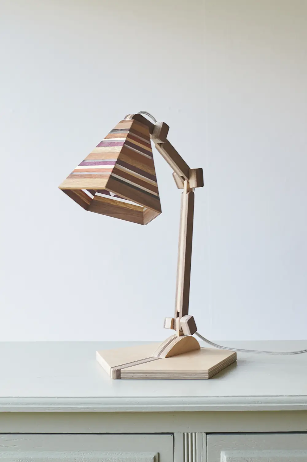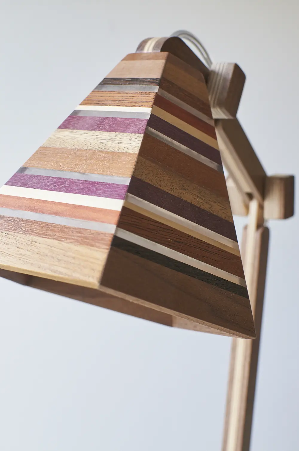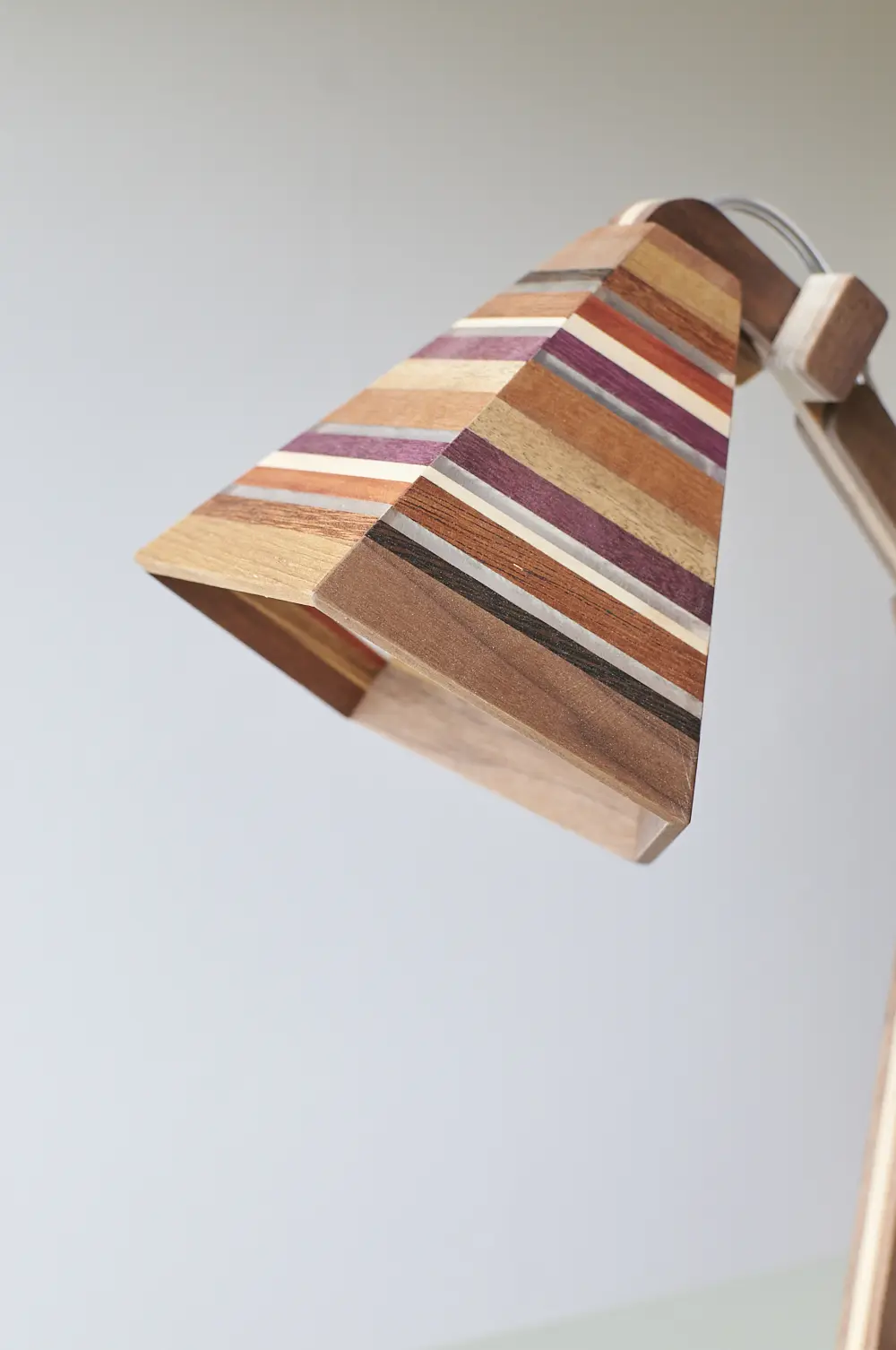 Dit prachtige lampje is met de hand gemaakt door Henk. Hij is helemaal gemaakt van verschillende soorten hout. Als je goed kijkt zie je dat er in het kapje ook transparante strips zijn verwerkt, waar het licht mooi doorheen schijnt als de lamp aan staat. Wat een mooi, speels lampje! Hij kan eigenlijk overal in huis wel staan. Op je nachtkastje, op een tafeltje naast de bank om ’s avonds onder te lezen of op een bureautje in de kinderkamer. Hij is verstelbaar, is voorzien van een lichtbron en een aan&uit schakelaar en het transparante snoer is mooi verwerkt. Een prachtige lamp om in huis te hebben, ook als hij niet aan staat.