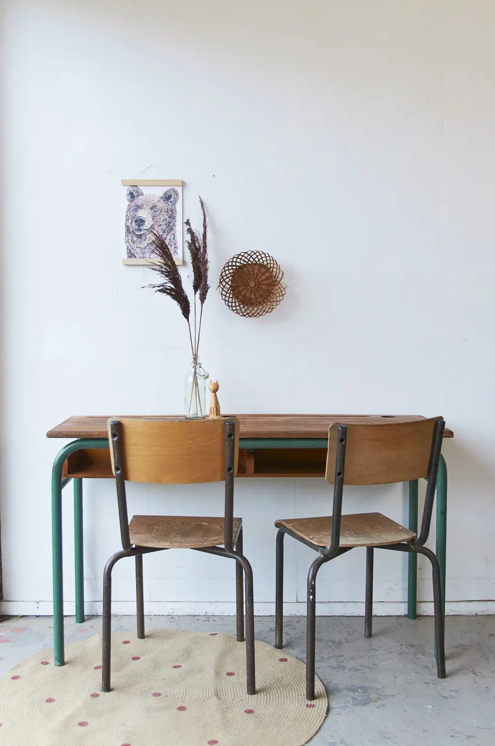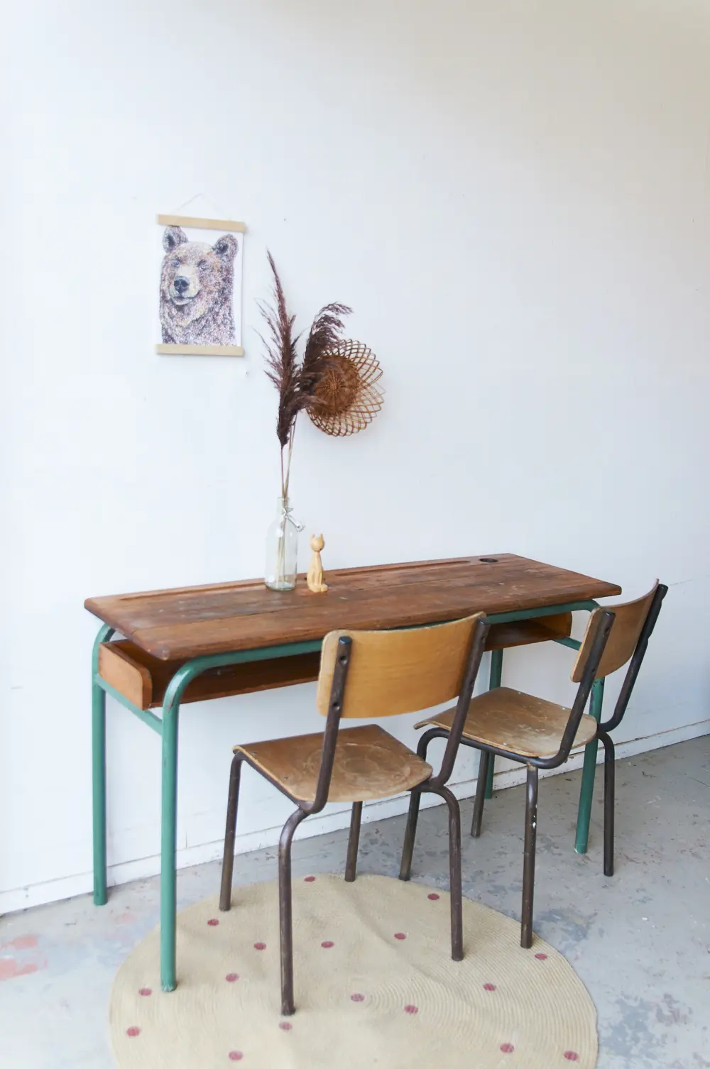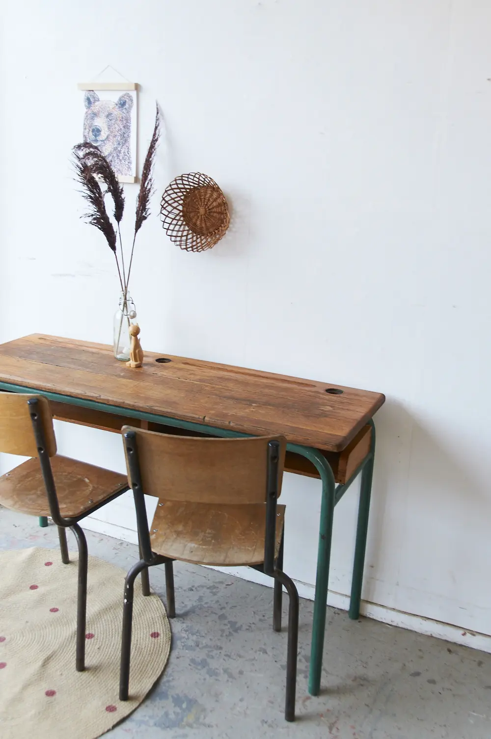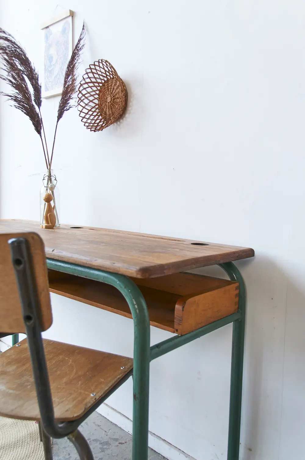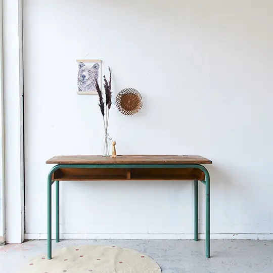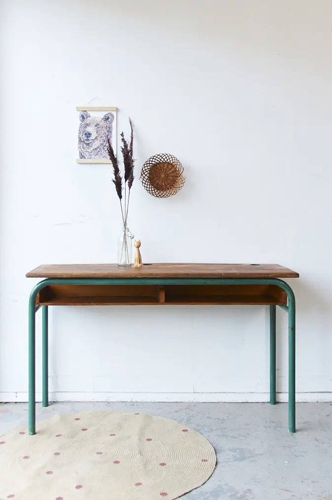 Wat een prachtige schooltafel is dit. Zo mooi origineel nog! Het blad is van eikenhout, heel stevig en solide. De vakken eronder zijn ook zo fijn, super handig om alle boekjes en gemaakte tekeningen in op te bergen! Deze tafel komt uit Frankrijk, heeft jarenlang in een school in de buurt van Limoges dienst gedaan. Wij hebben hem schoongemaakt en opgeknapt en nu is hij klaar voor een nieuwe plek!