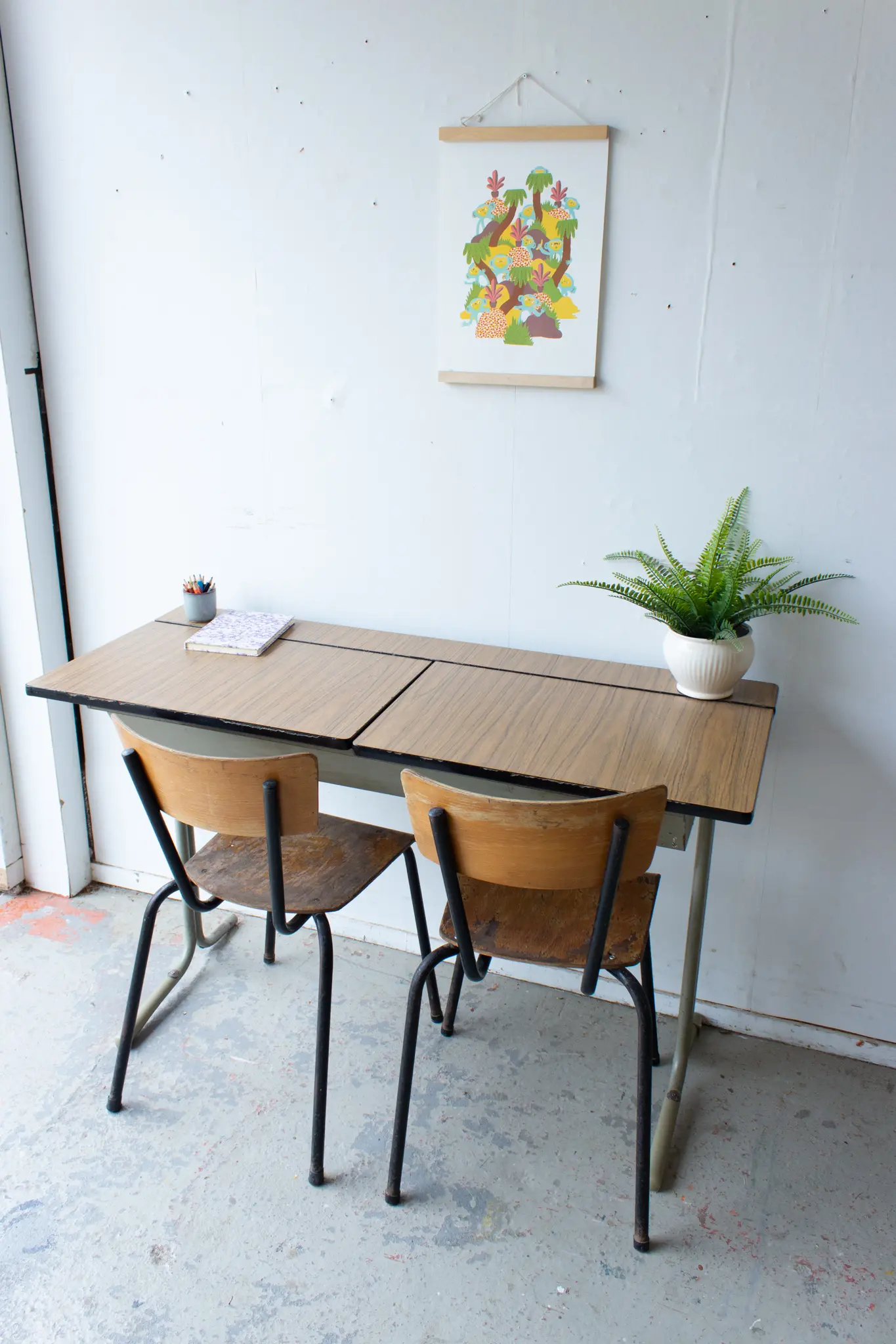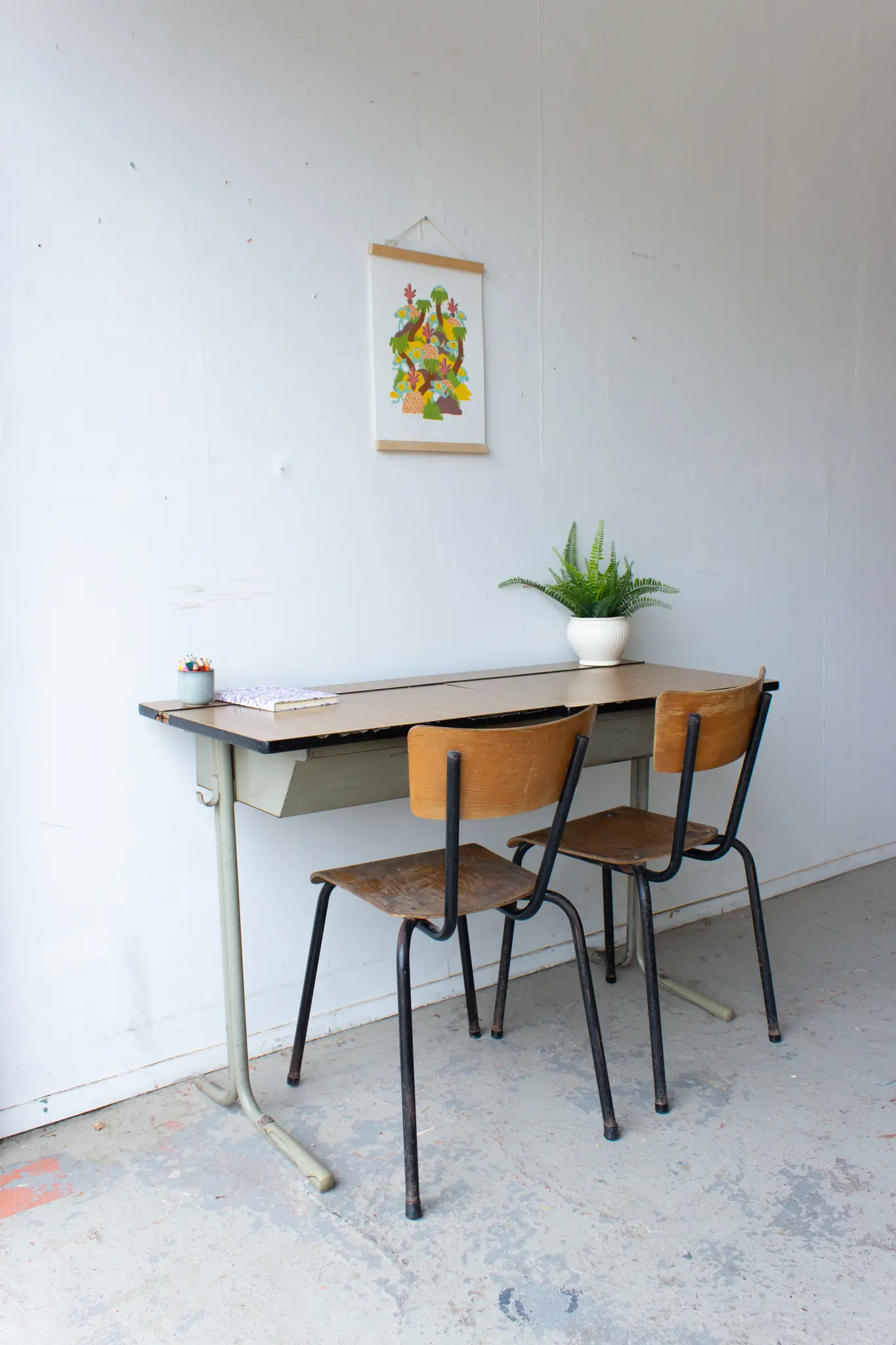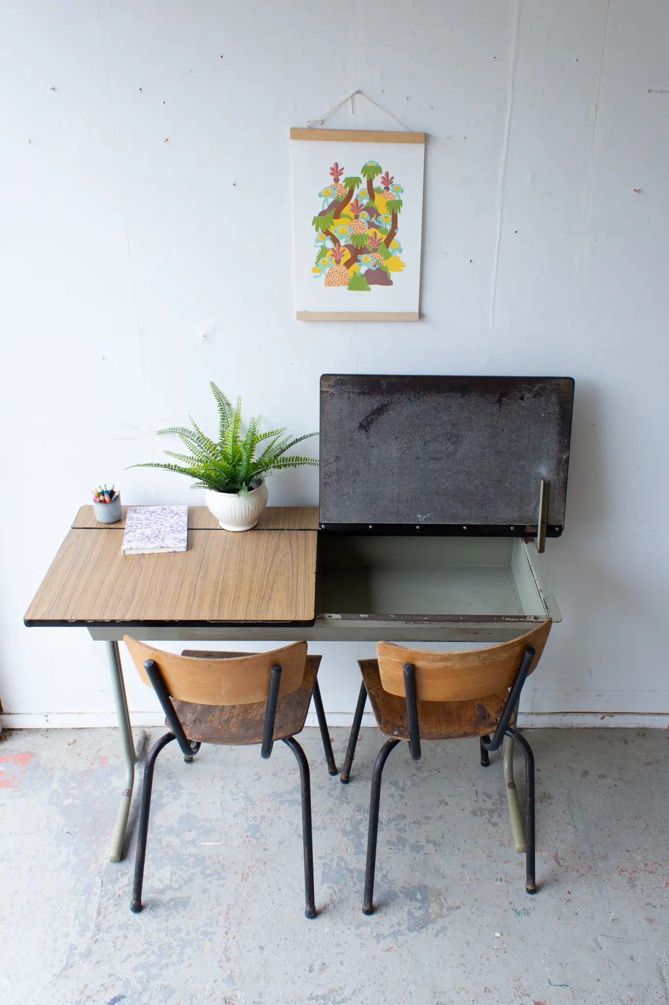 Een tweepersoons schooltafel met kleppen! Het blad is van formica en de tafel heeft een stalen frame. Beide kleppen kunnen open, super leuk om alle knutselspullen in op te bergen! Deze set is ideaal voor een kind vanaf een jaar of 5 / 6. De prijs is inclusief deze twee stoelen.