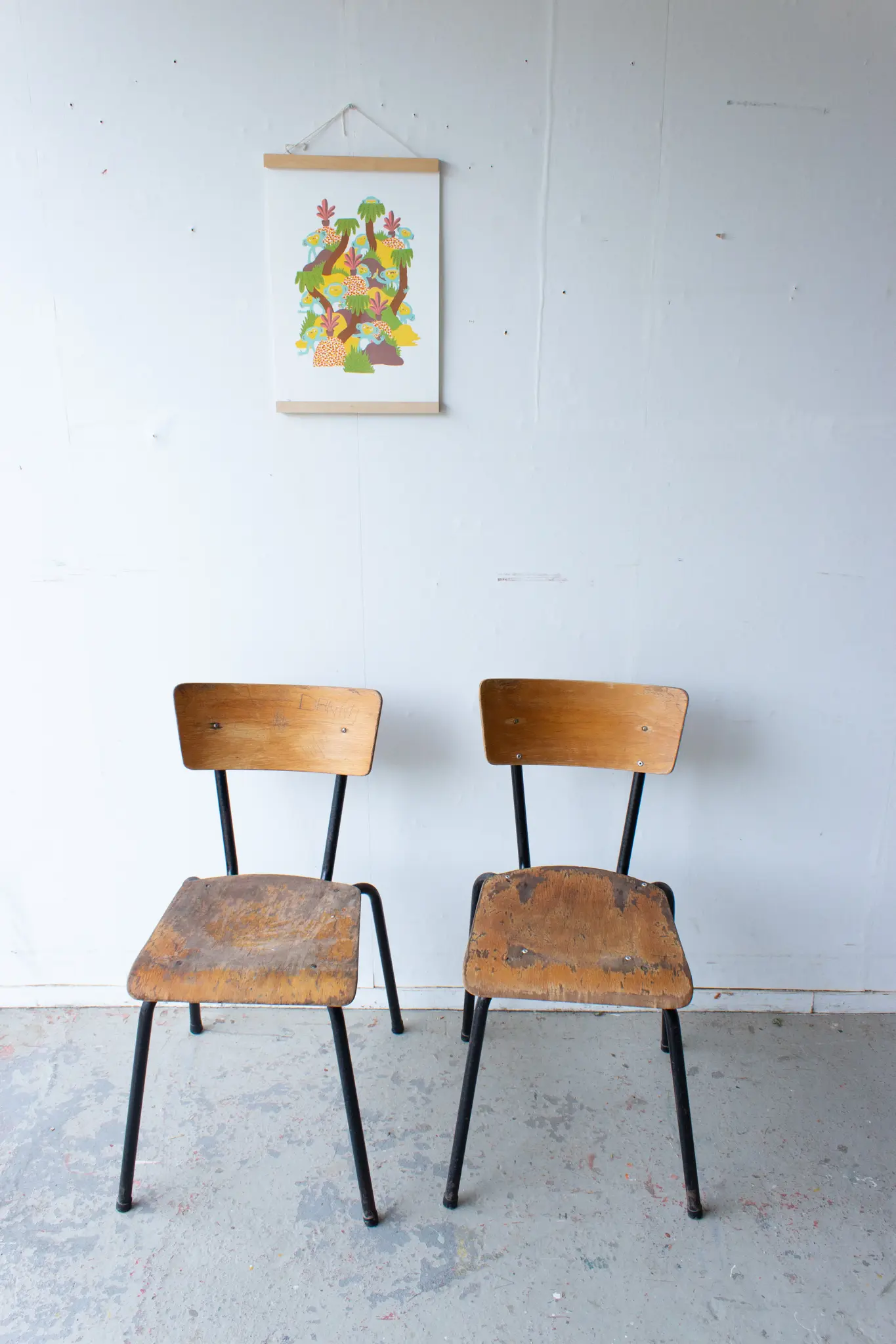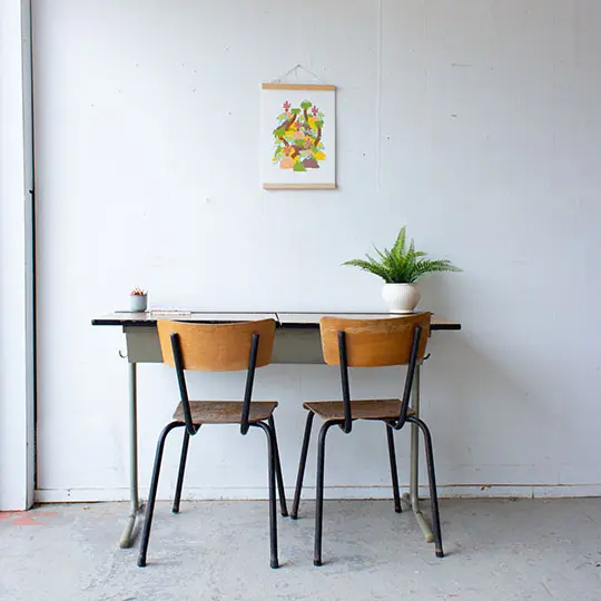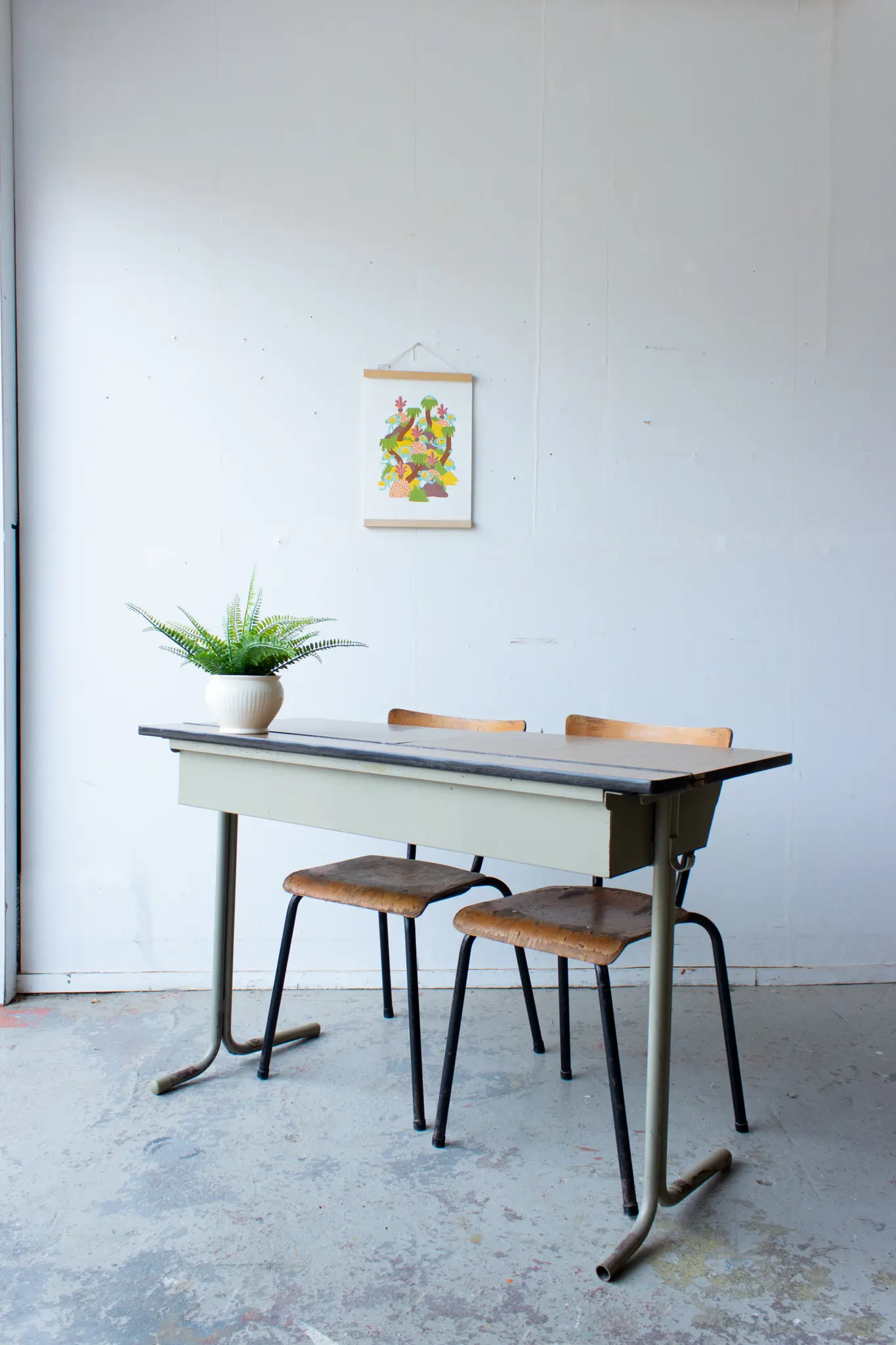 Een tweepersoons schooltafel met kleppen! Het blad is van formica en de tafel heeft een stalen frame. Beide kleppen kunnen open, super leuk om alle knutselspullen in op te bergen! Deze set is ideaal voor een kind vanaf een jaar of 5 / 6. De prijs is inclusief deze twee stoelen.