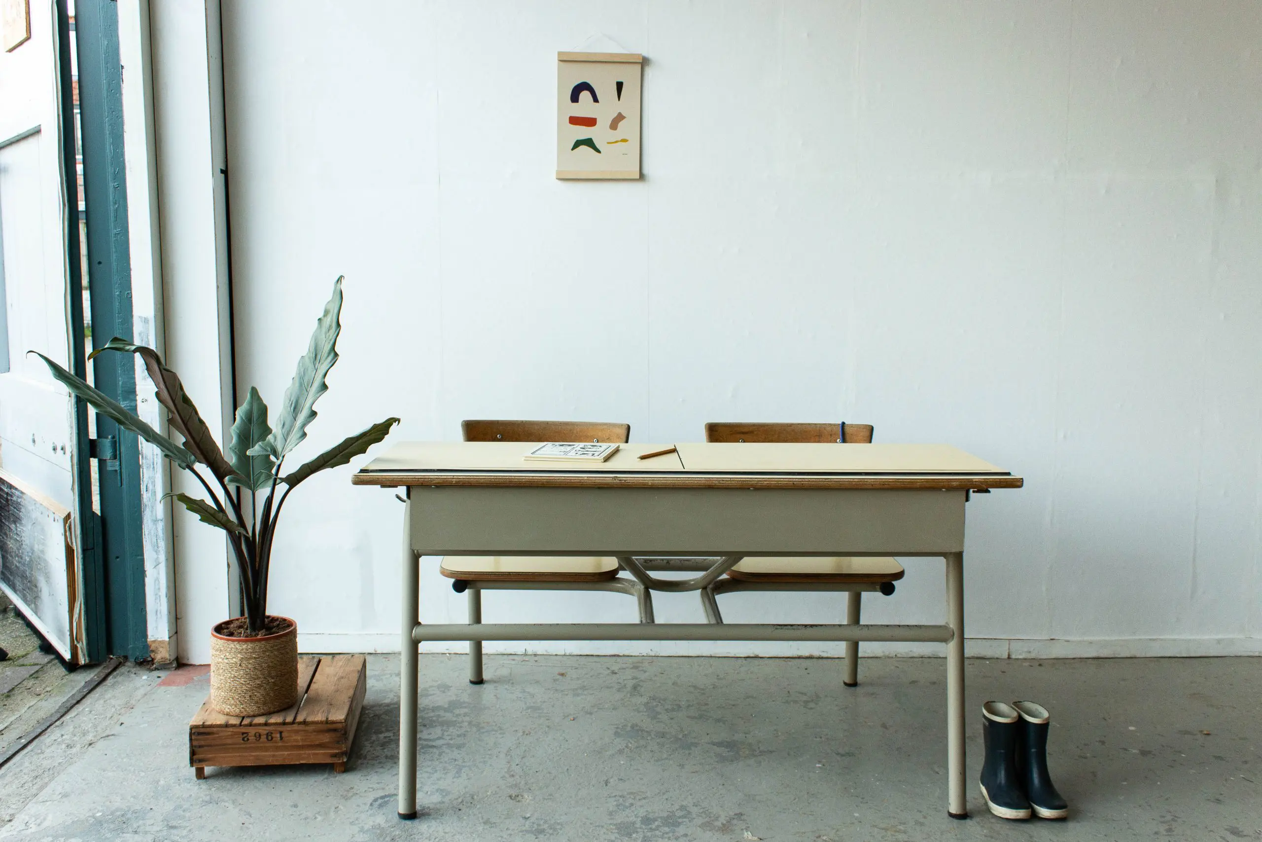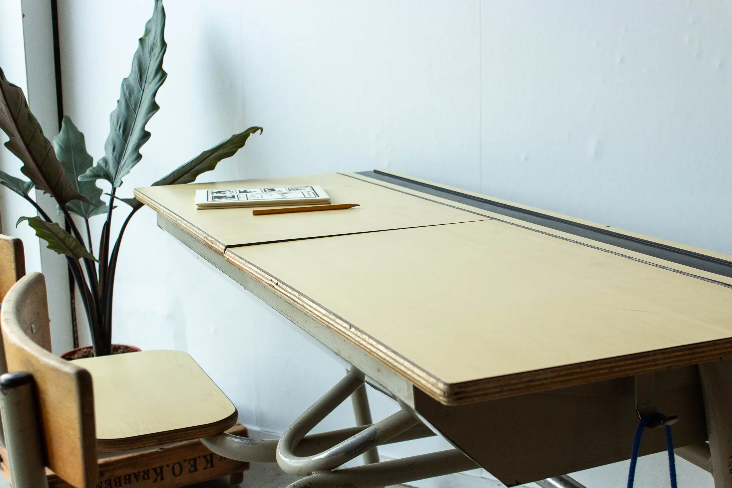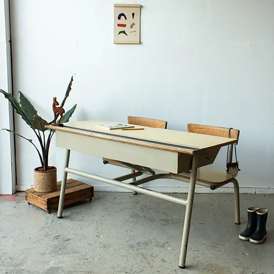 Tweepersoons vintage schoolbank met formica blad