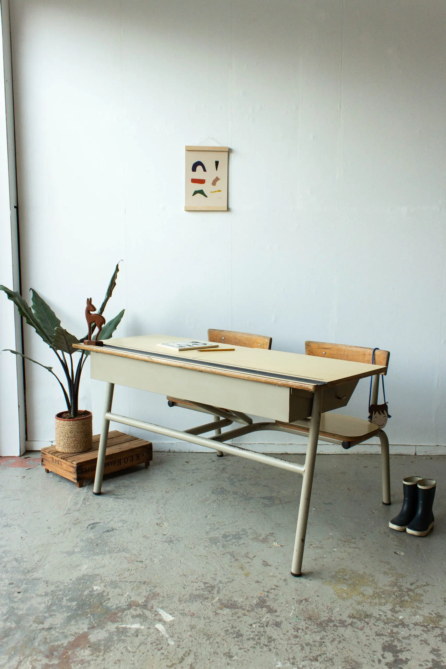 Een leuke vintage schoolbank uit België. Dit soort schoolbanken komen uit de jaren zestig en zeventig. En vermoedelijk hebben er veel kinderen aan zitten werken. Tafels met een verleden dus! Wij hebben deze schoolbank grondig schoongemaakt en nagelopen. En nu is hij weer helemaal klaar voor gebruik. Heel handig zijn de opbergvakken onder het werkblad. Ideaal om teken- en knutselspul in op te bergen!