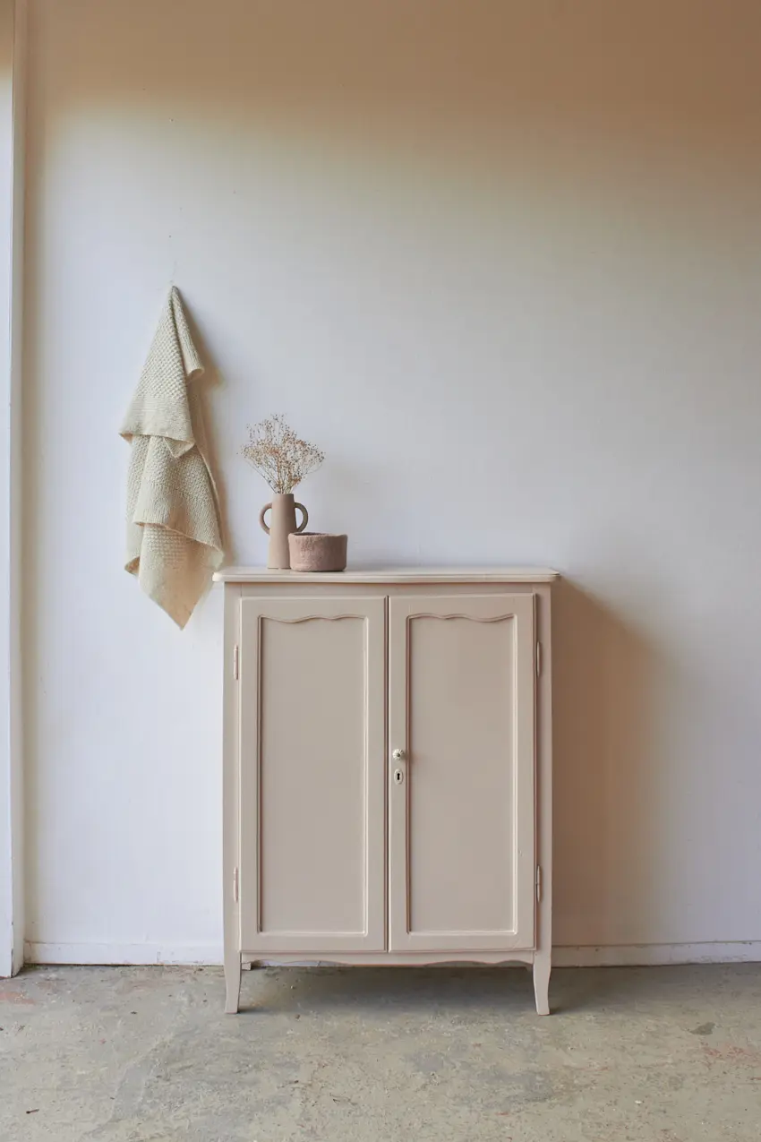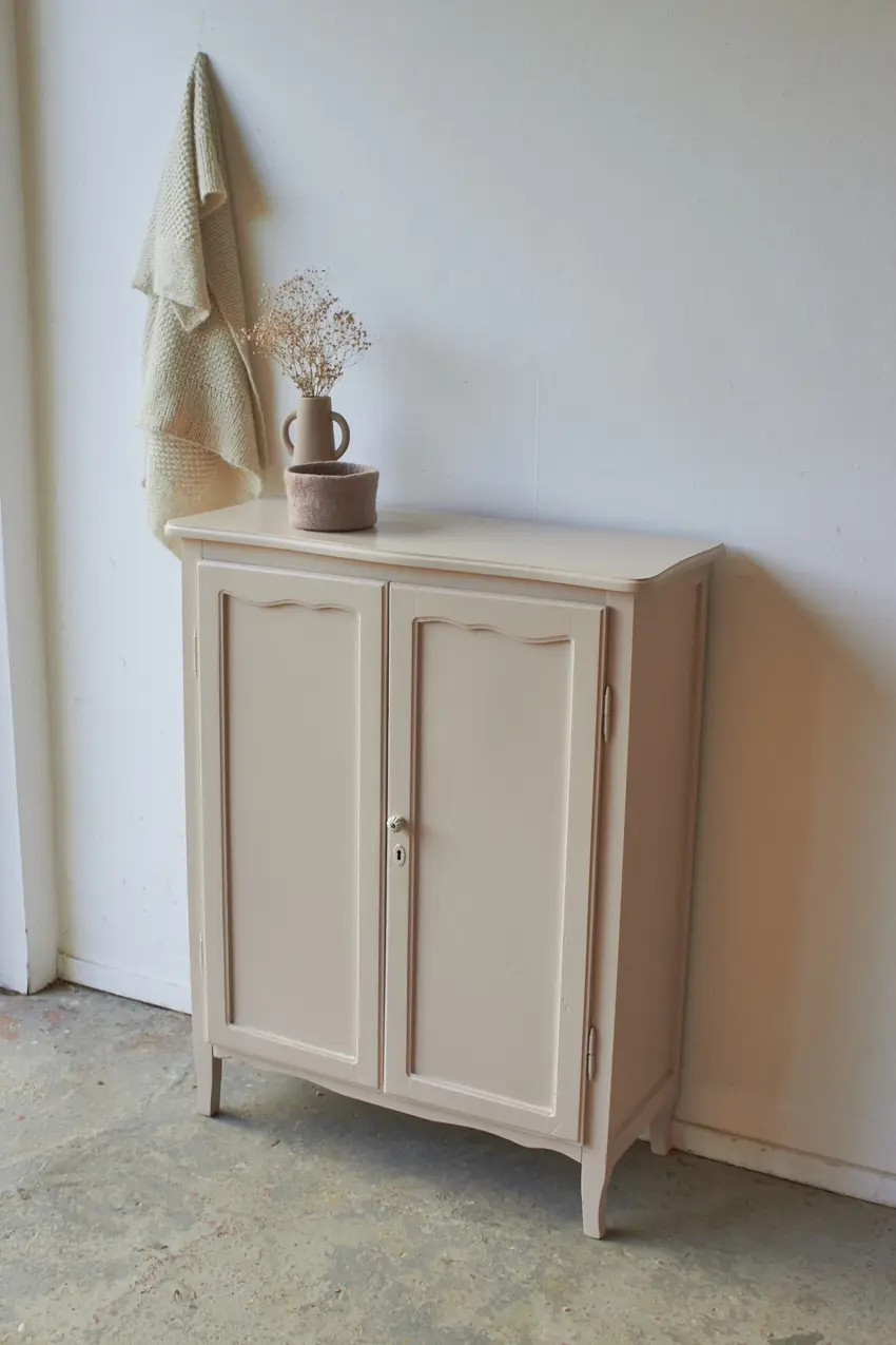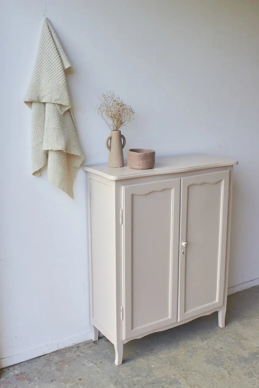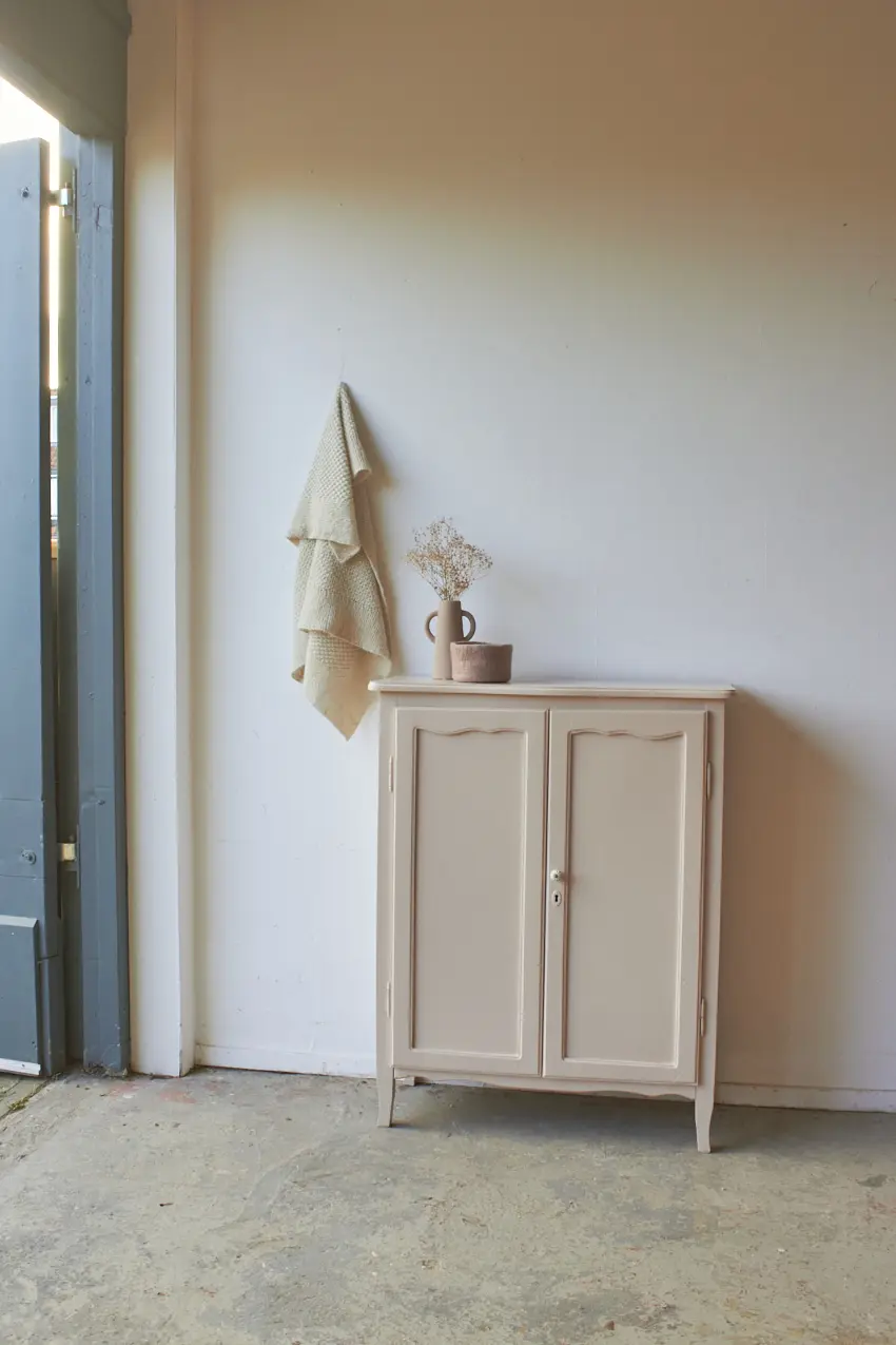 De achterkant is helemaal vervangen en de plank in de kast in nieuw. We kozen uiteindelijk voor deze heerlijke fijne zachte kleur Bloesem. Helemaal klaar voor een nieuwe plek.