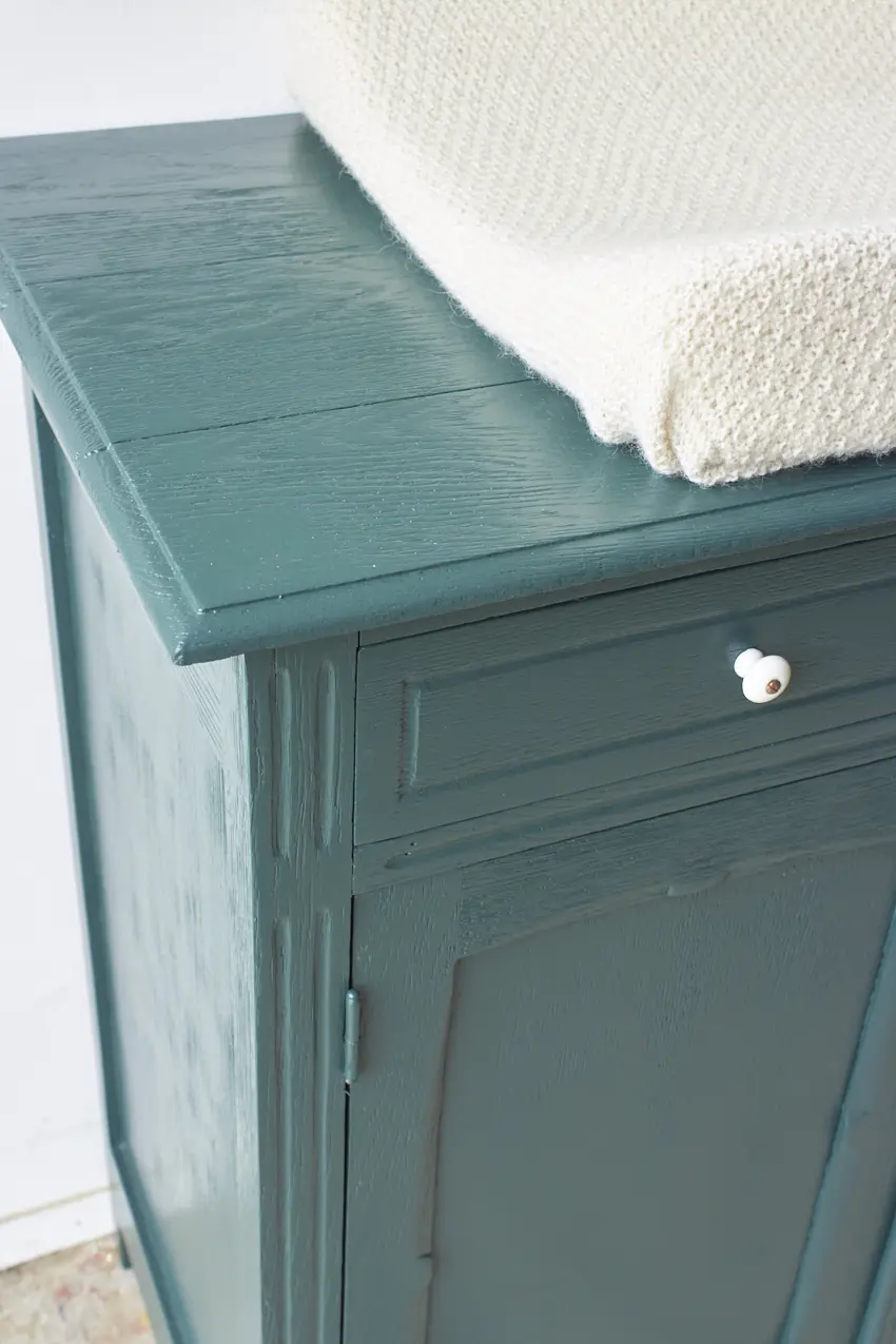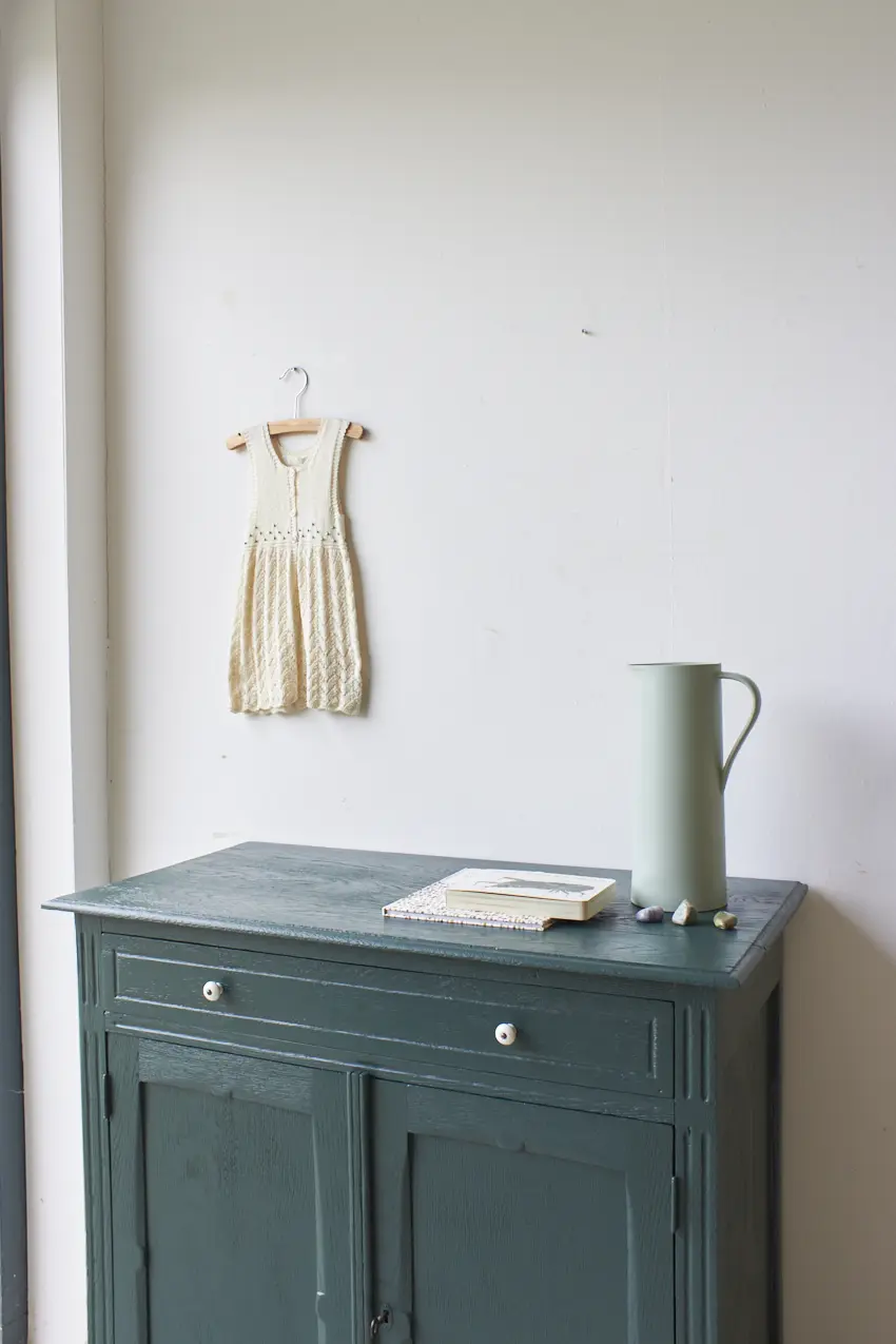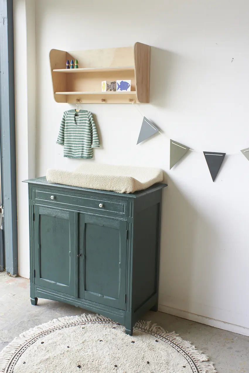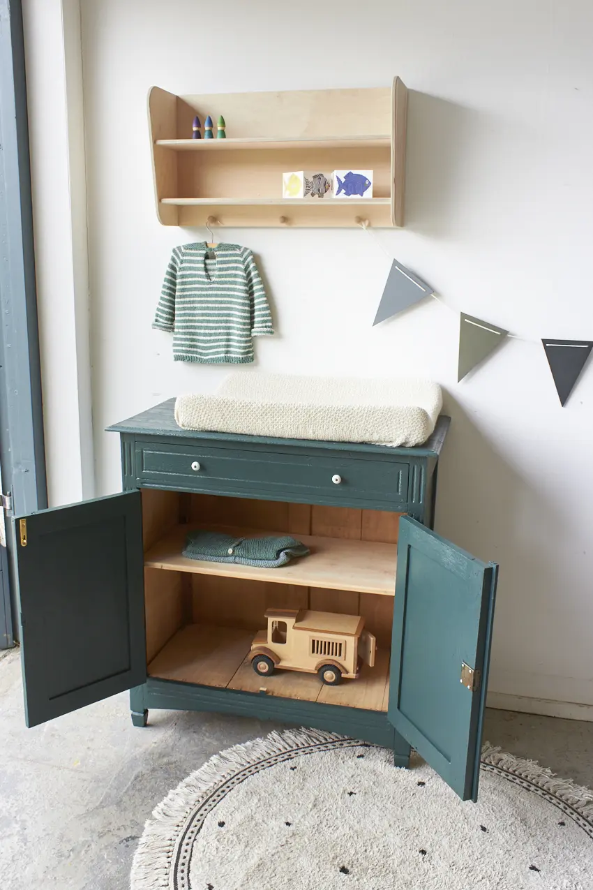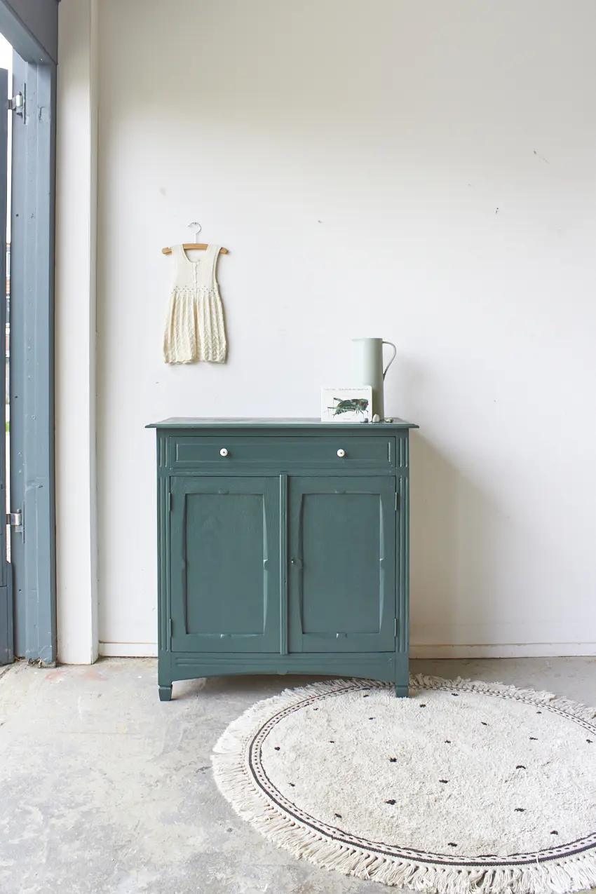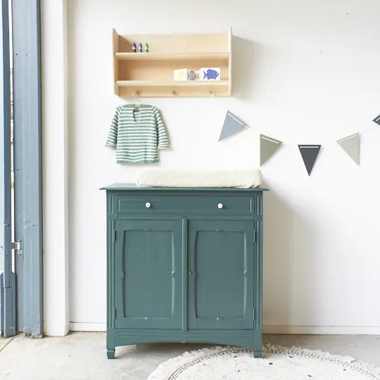 Na de grondige schoonmaakbeurt, nodige reparaties, hebben wij er voor gekozen om dit lieve kastje in deze kleur Amazone te schilderen. Deze speciale groentint doet ons denken aan de natuur met zijn mooie dichtbegroeide bossen. Je kunt helemaal verdwijnen in deze kleur. Amazone is daarom ook onmisbaar in een stoere jungle kamer. We zien het al voor ons, samen met een mooi behang in blauw en groentinten, de droom van elke jungle- en dierenliefhebber toch?! Wil je Amazone combineren met een wat rustigere tint, dan past Linnen hier heel mooi bij. Het deurtje sluit met een sleutel en op de lades hebben wij porseleinen knopjes geplaats. Liever geen sleutel? Wij kunnen ook een magneetje plaatsen en nog een porseleinen knopje. Ons eigen originele Firma Zoethout wandplankje en kleed is ook bij ons verkrijgbaar. Klik hier voor al onze kinderkamer decoratie.