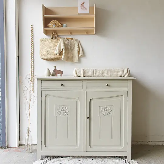 Een mooie vintage commode voor op de babykamer. Lief, strak en subtiel. Deze commode hebben wij grondig schoongemaakt en behandeld tegen houtworm. Hij heeft een nieuwe plank gekregen. De deurtjes klemmen niet meer en gaan weer soepel open en dicht gaan, evenals de laatjes. Het linker deurtje sluit met een schuifje en het rechterdeurtje met een magneetje. We hebben de commode in de kleur ‘linnen’ geschilderd en hem afgewerkt met bronzen knoppen. Linnen is een fijne, lichte neutrale kleur, een mix van heel licht grijs en beige. Omdat het zo’n rustige en makkelijke kleur is kun je Linnen heel goed combineren met een druk behang of veel andere kleuren. Zelf vinden we Linnen altijd prachtig staan op een echt klassiek meubel. Wil je de commode over een tijdje toch liever op een andere plek? Deze kleur staat overal prachtig!