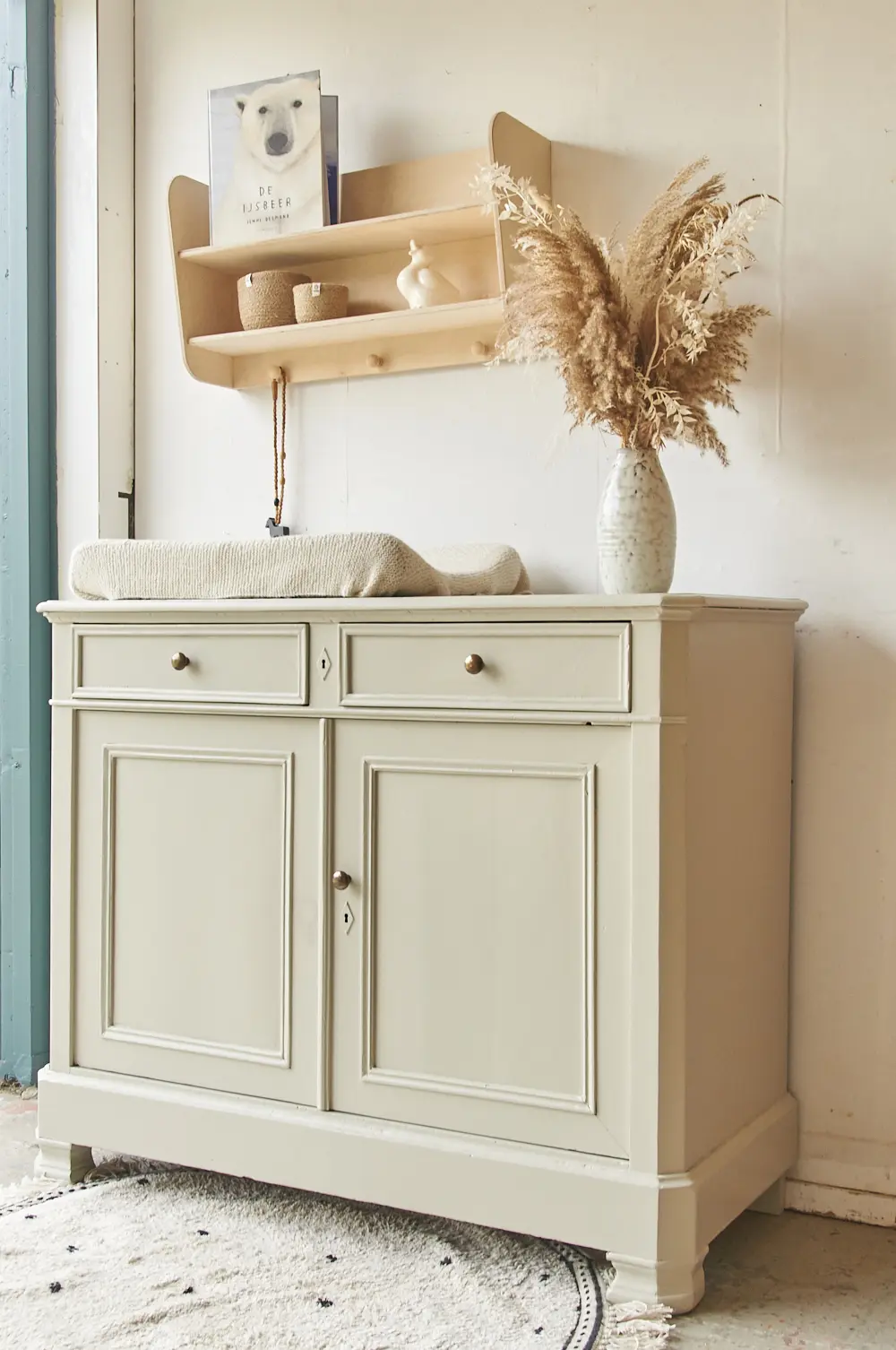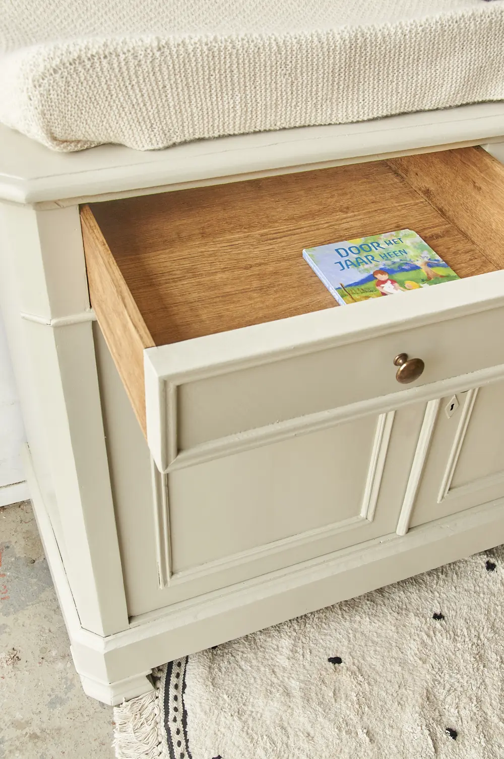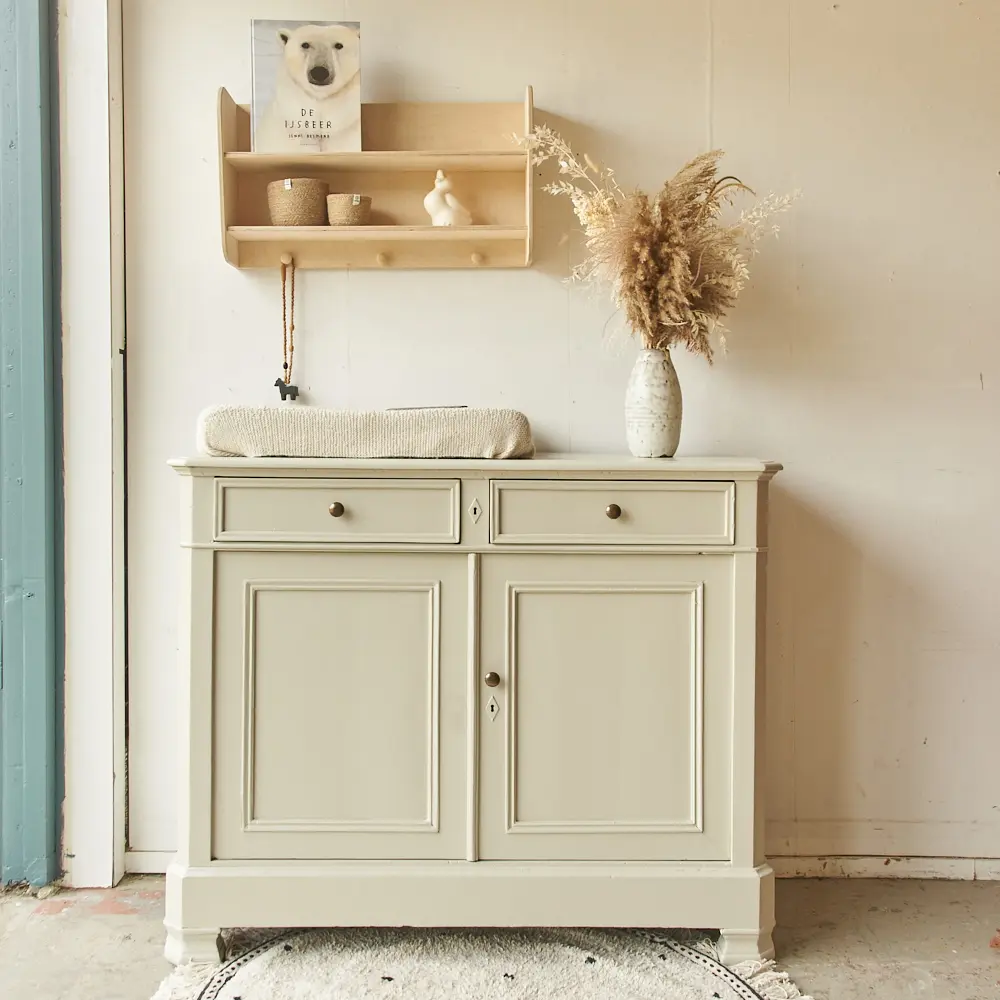 Wat een fijne commode in onze kleur Linnen. Linnen is een lichte neutrale kleur, een mix van heel licht grijs en beige. Omdat het zo’n rustige en makkelijke kleur is kun je Linnen heel goed combineren met een druk behang of veel andere kleuren. Zelf vinden we Linnen altijd prachtig staan op een echt klassiek meubel. Wil je de commode over een tijdje toch liever op een andere plek? Deze kleur staat overal prachtig! Ben je op zoek naar een net zo’n mooie neutrale kleur, maar toch net iets grijzer? Dan is Maan een heel fijn alternatief. Hij heeft een klassiek karakter, de knoppen geven hem de perfecte finishing touch. Hij heeft achter de twee deurtjes een brede legplank. Wij hebben de commode na een grondige schoonmaakbeurt behandeld tegen houtworm. Na de nodige reparaties heeft hij een laag grondverf gekregen en is hij twee keer afgelakt. De laatjes gaan soepel open en dicht en het deurtje heeft een schuifje aan de binnenkant. Helemaal klaar voor gebruik.