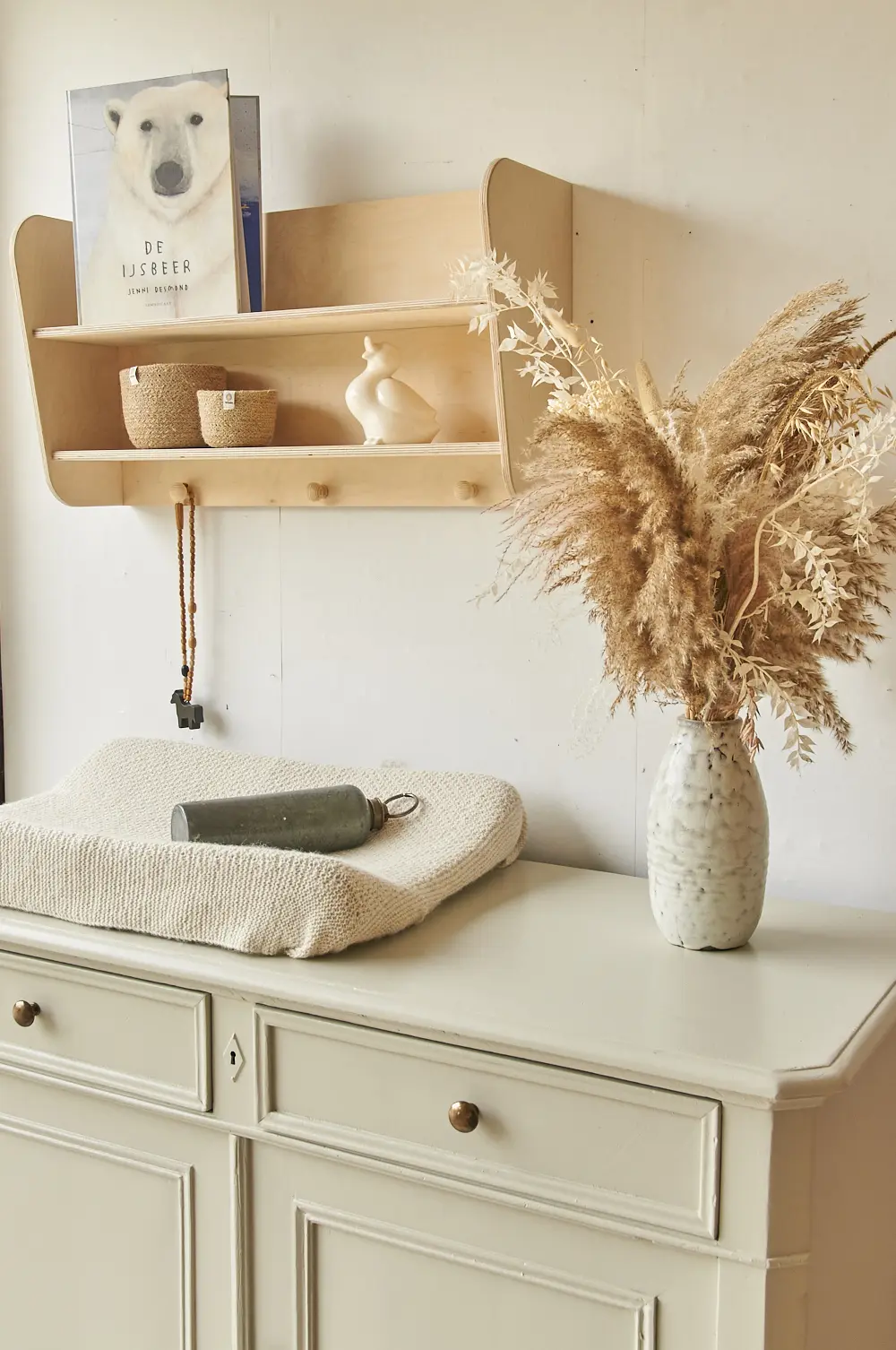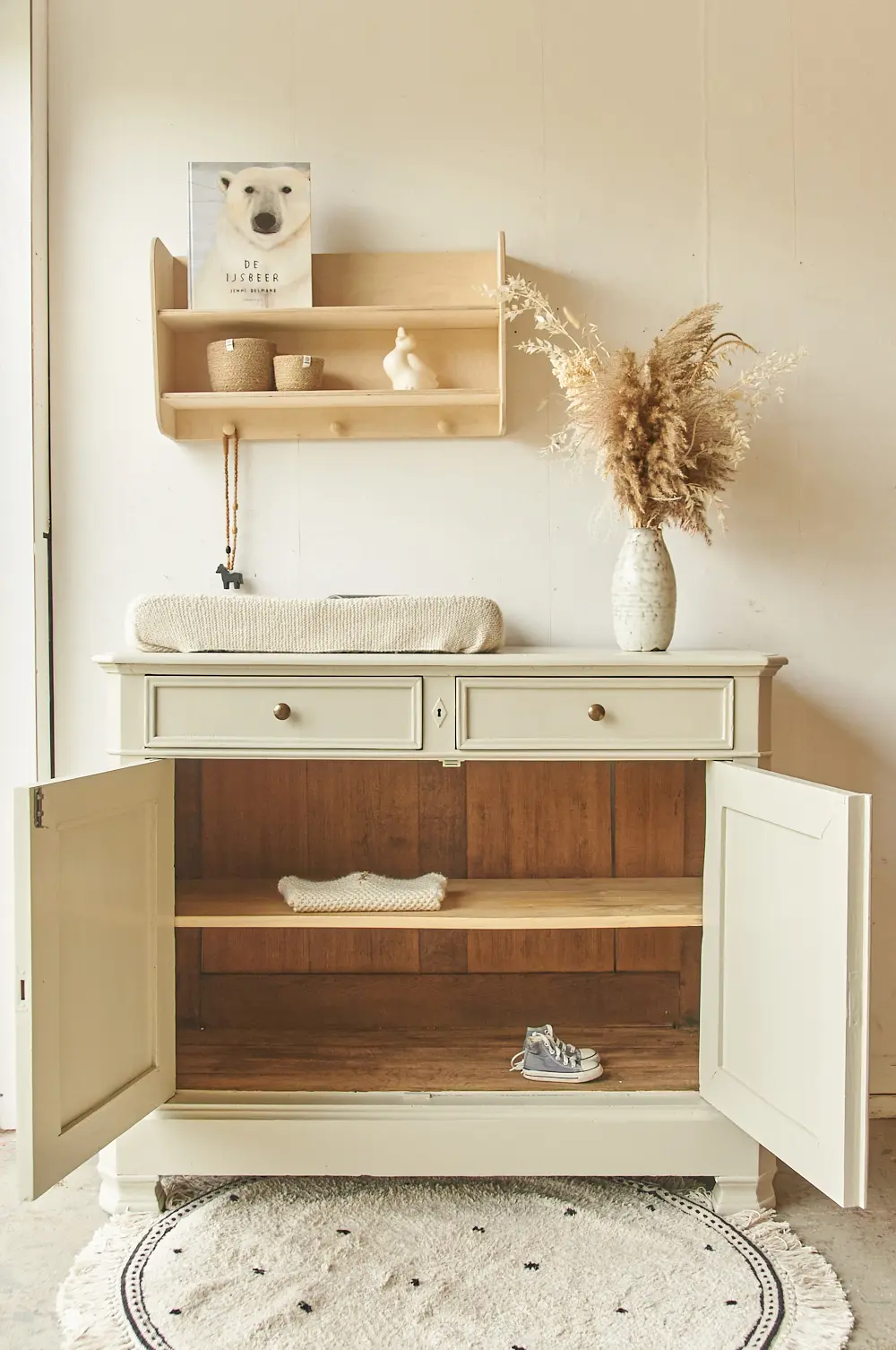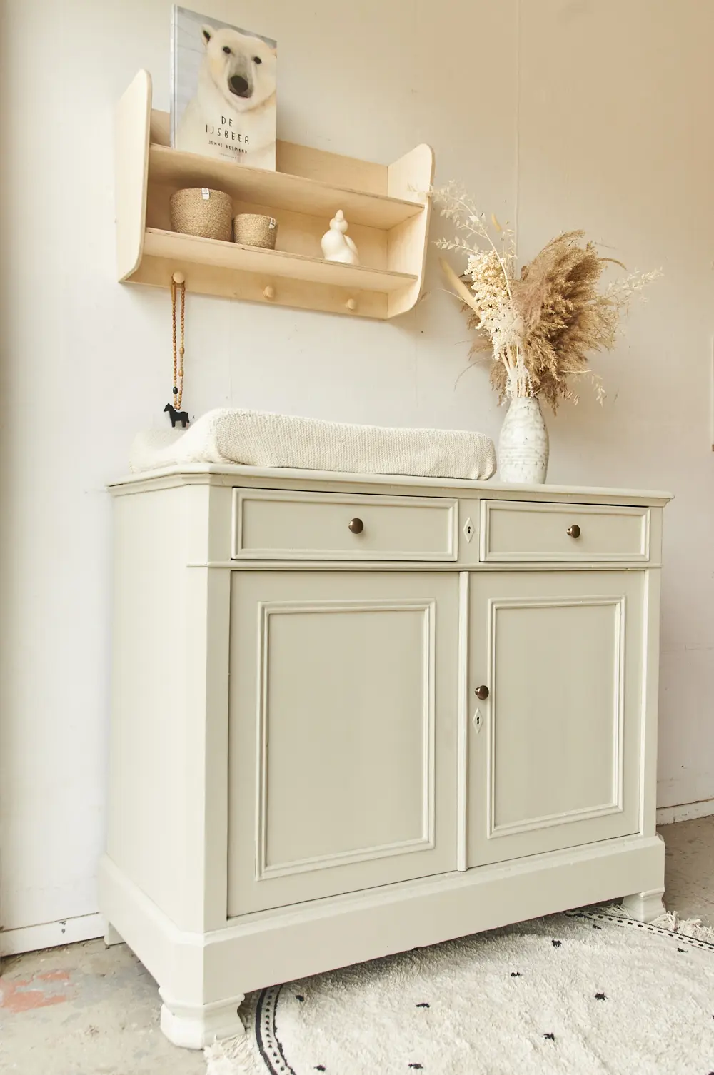 Wat een fijne commode in onze kleur Linnen. Linnen is een lichte neutrale kleur, een mix van heel licht grijs en beige. Omdat het zo’n rustige en makkelijke kleur is kun je Linnen heel goed combineren met een druk behang of veel andere kleuren. Zelf vinden we Linnen altijd prachtig staan op een echt klassiek meubel. Wil je de commode over een tijdje toch liever op een andere plek? Deze kleur staat overal prachtig! Ben je op zoek naar een net zo’n mooie neutrale kleur, maar toch net iets grijzer? Dan is Maan een heel fijn alternatief. Hij heeft een klassiek karakter, de knoppen geven hem de perfecte finishing touch. Hij heeft achter de twee deurtjes een brede legplank. Wij hebben de commode na een grondige schoonmaakbeurt behandeld tegen houtworm. Na de nodige reparaties heeft hij een laag grondverf gekregen en is hij twee keer afgelakt. De laatjes gaan soepel open en dicht en het deurtje heeft een schuifje aan de binnenkant. Helemaal klaar voor gebruik.