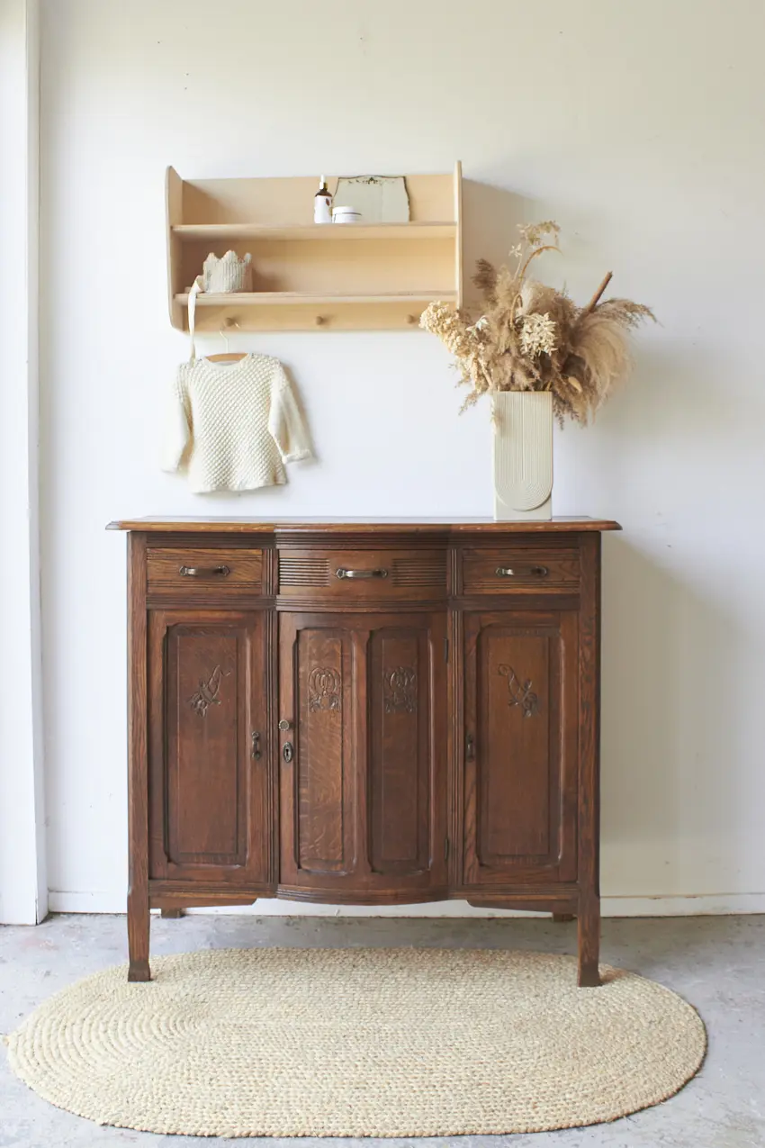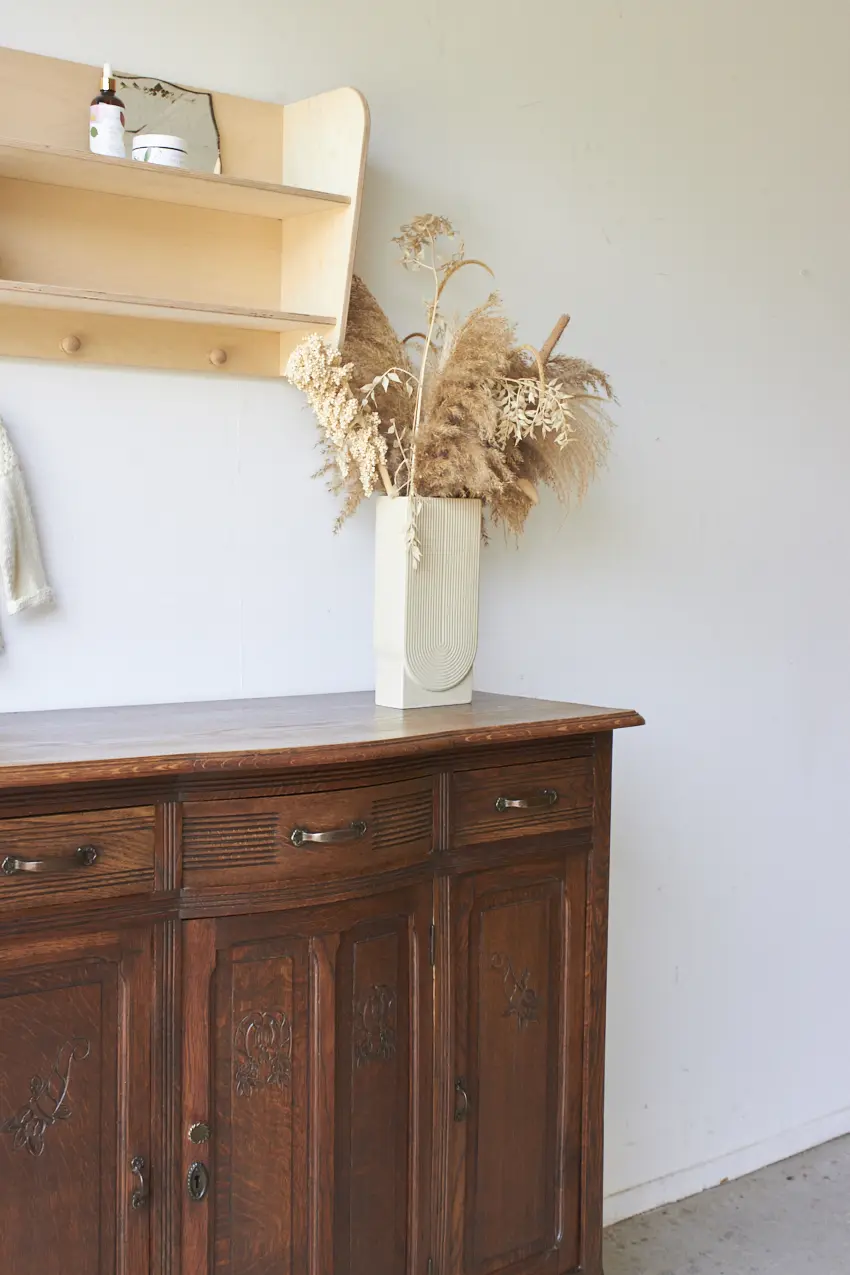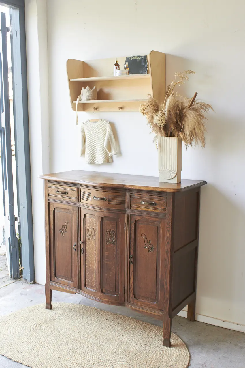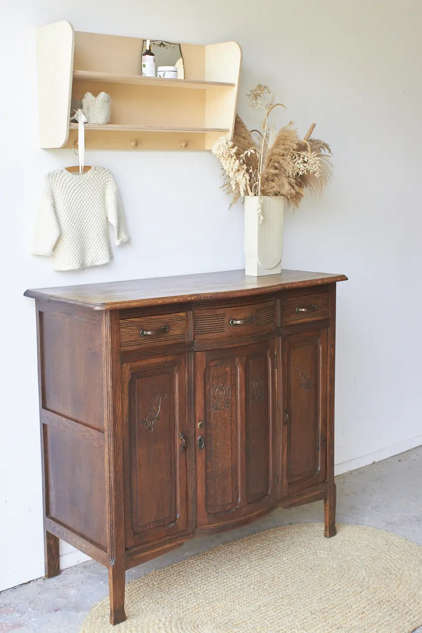 We hebben hem goed schoongemaakt en behandeld tegen houtworm. De originele plank hebben we goed opgeschuurd, zodat we deze ook konden hergebruiken. Met de 3 lades bovenin is er genoeg opbergruimte. De commode is licht opgeschuurd en hebben we een nieuwe laag beits en meubel olie gegeven, nu ziet hij er weer uit als nieuw. Wat een leukerd, met zijn originele handgrepen! Alle deurtjes sluiten met een magneetje. Mocht deze commode iets te hoog voor je zijn, we kunnen gemakkelijk nog iets van de pootjes afhalen.